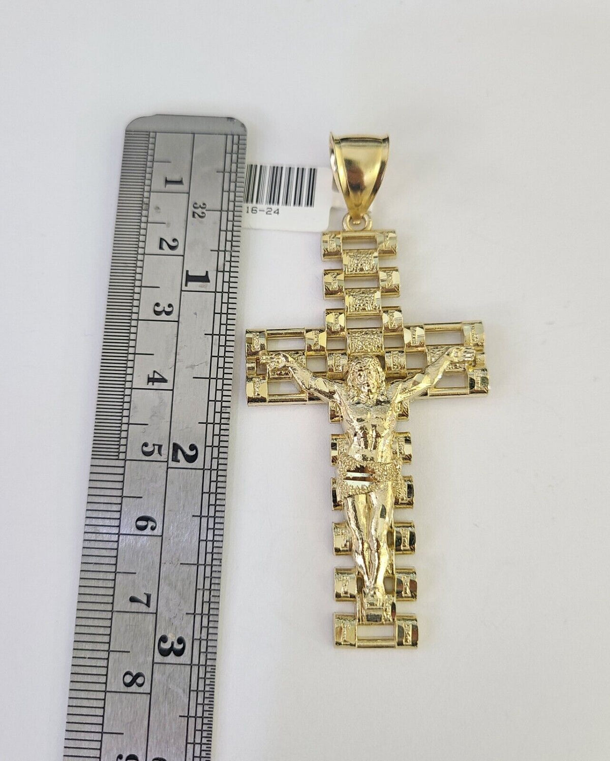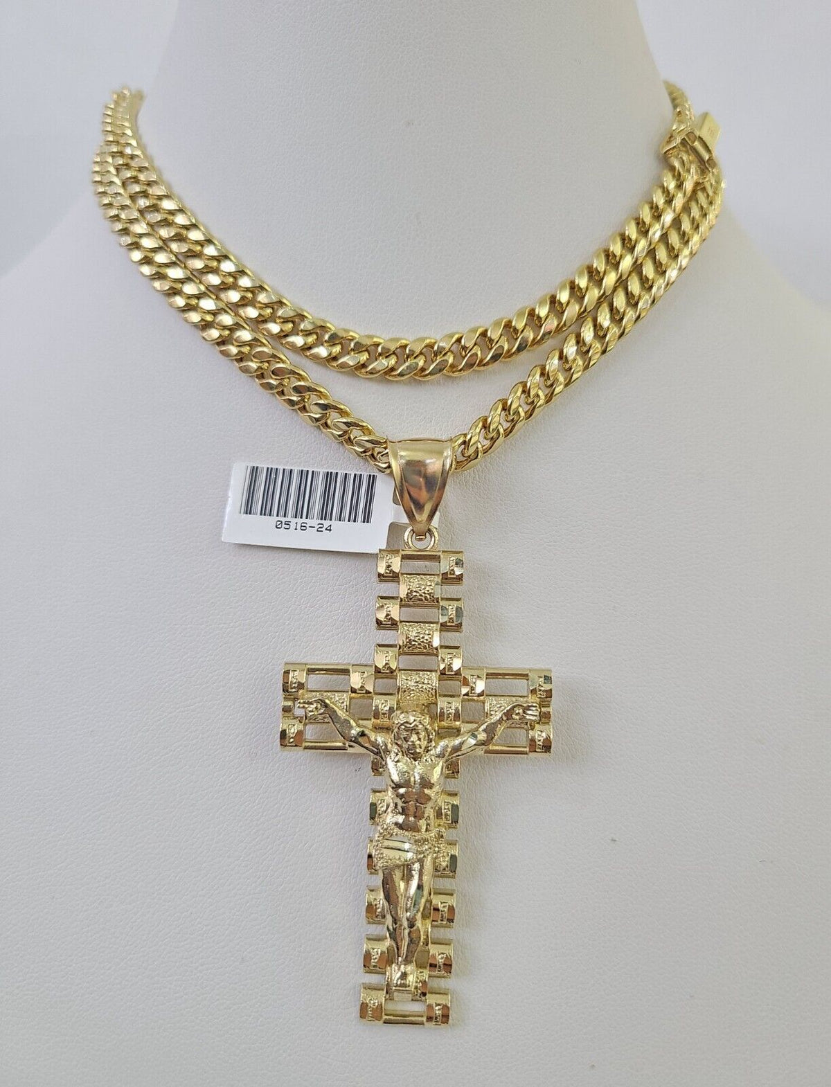 We present You with This Absolutely Stunning Real 10k Yellow Gold Miami Cuban Chain with Jesus Cross Pendant Charm. It has a detailed cut with a very good finish. These Beautiful Chains and Pendants will not tarnish, discolor, or fade because they are Pure 10K Gold. Please feel free to contact us if you have any queries regarding the item. 26"-A23B9 A8B2