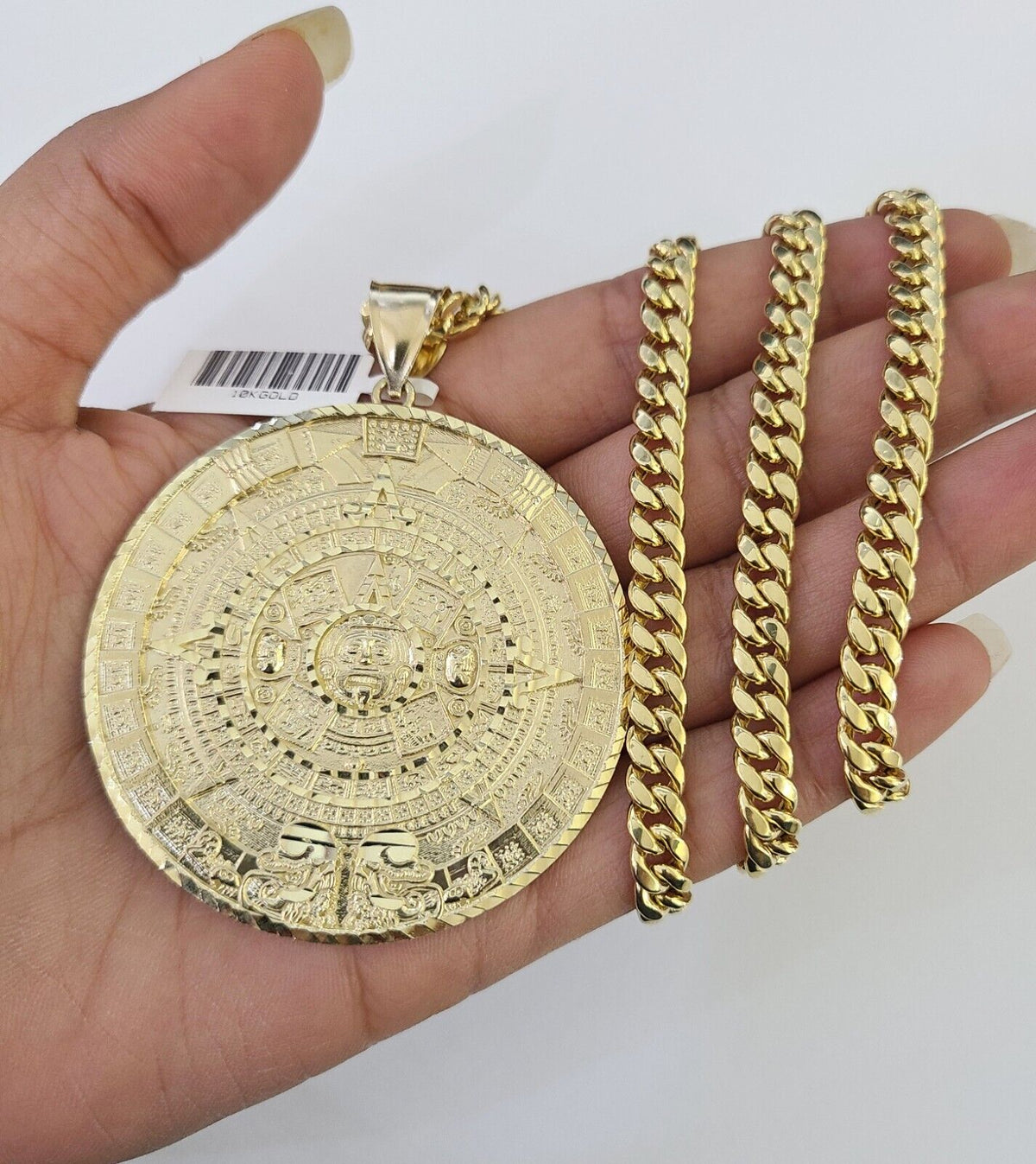 We present You with This Absolutely Stunning Real 10k Yellow Gold Miami Cuban Chain with Mayan Calendar Pendant Charm. It has a detailed cut with a very good finish. These Beautiful Chains and Pendants will not tarnish, discolor, or fade because they are Pure 10K Gold. Please feel free to contact us if you have any queries regarding the item.