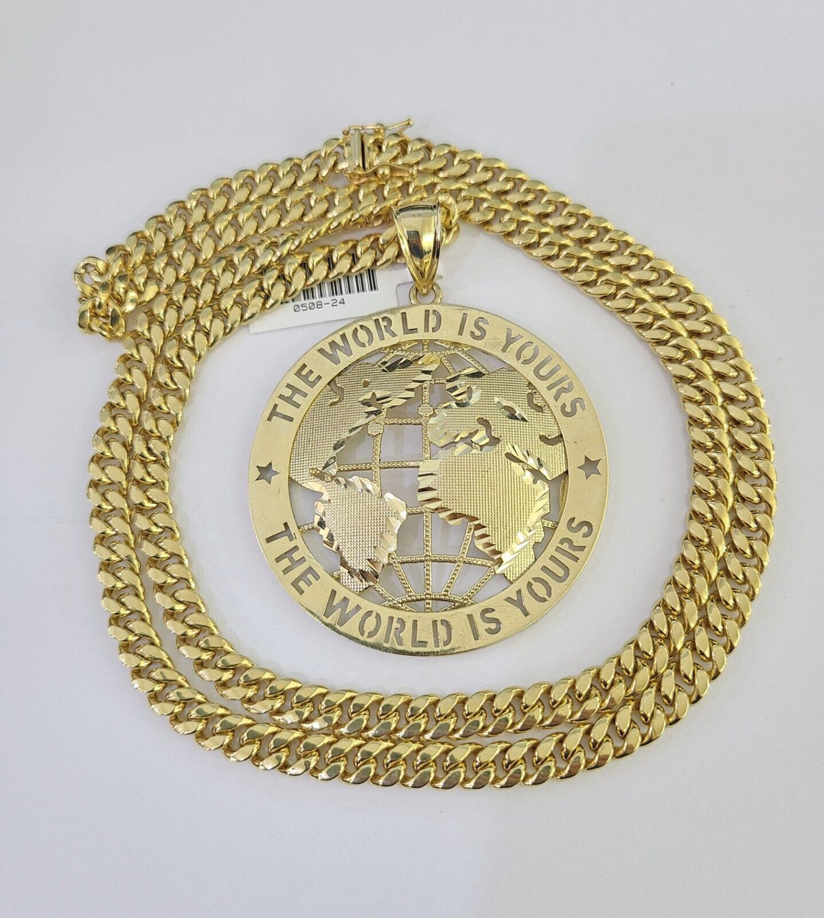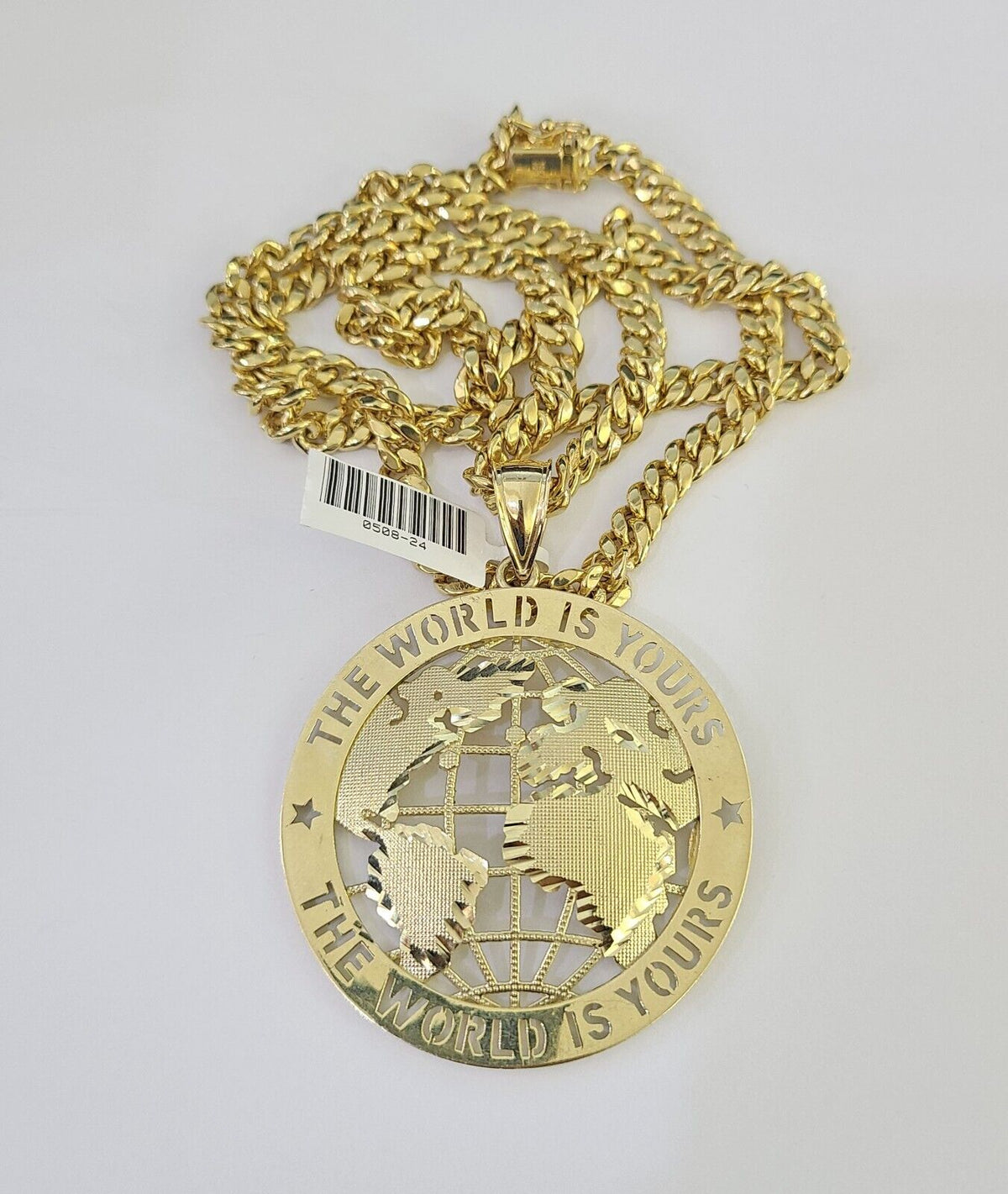 We present You with This Absolutely Stunning Real 10k Yellow Gold Miami Cuban Chain with World is Yours Pendant Charm. It has a detailed cut with a very good finish. These Beautiful Chains and Pendants will not tarnish, discolor, or fade because they are Pure 10K Gold. Please feel free to contact us if you have any queries regarding the item. 26"-A23B9 A10B6