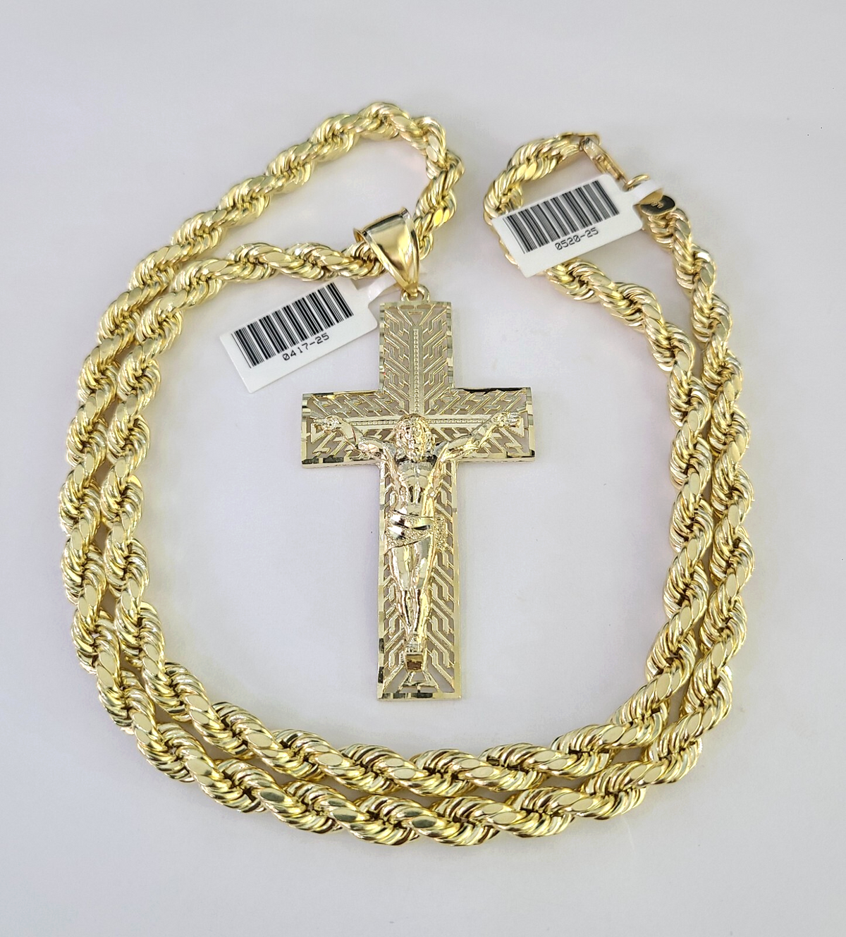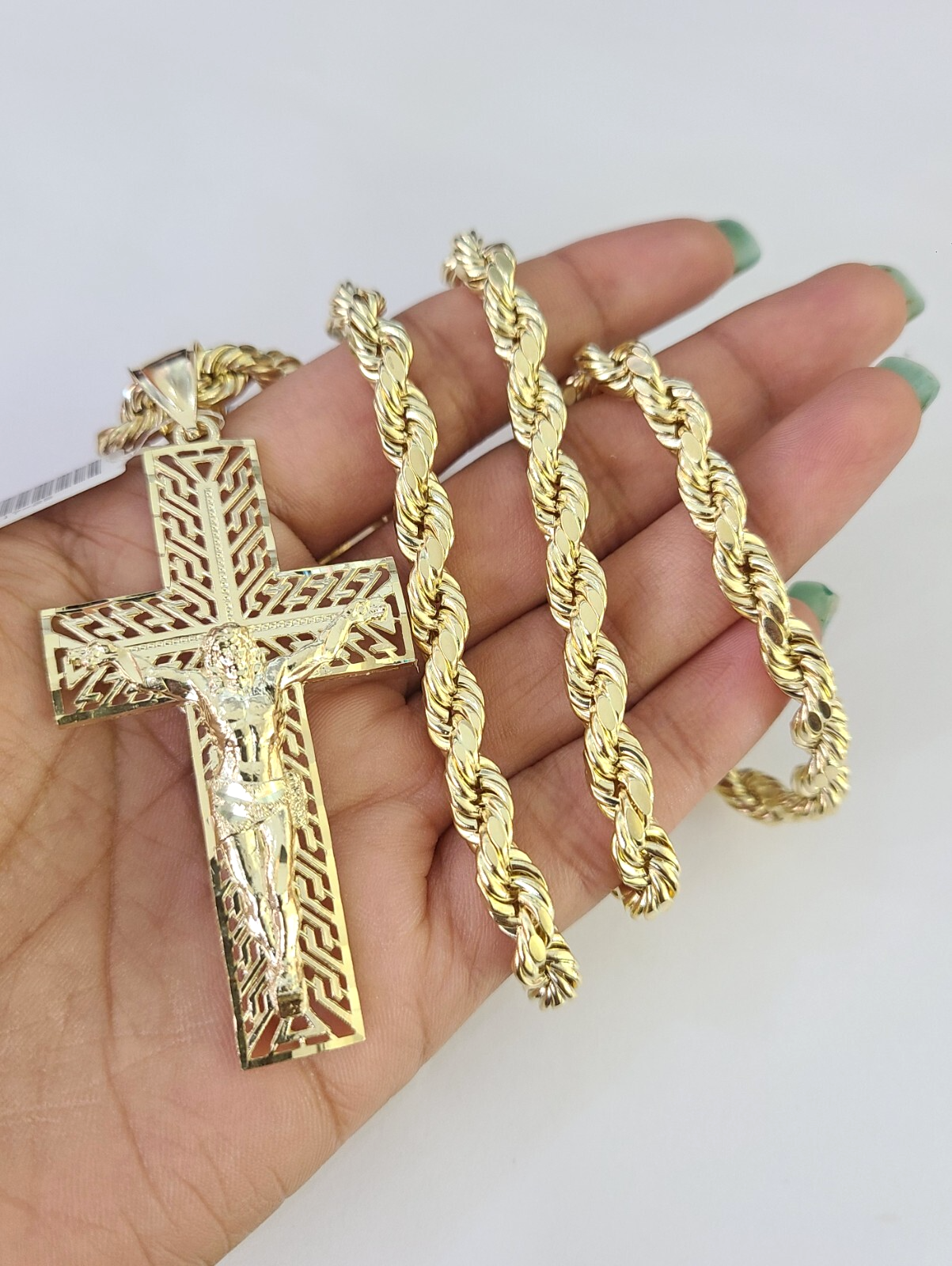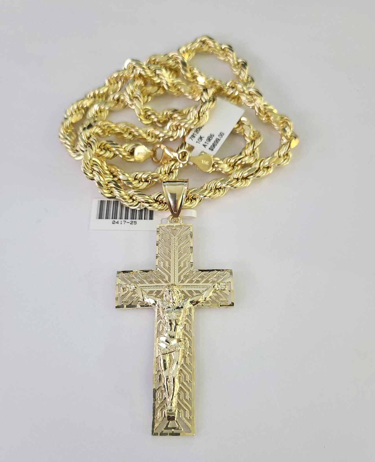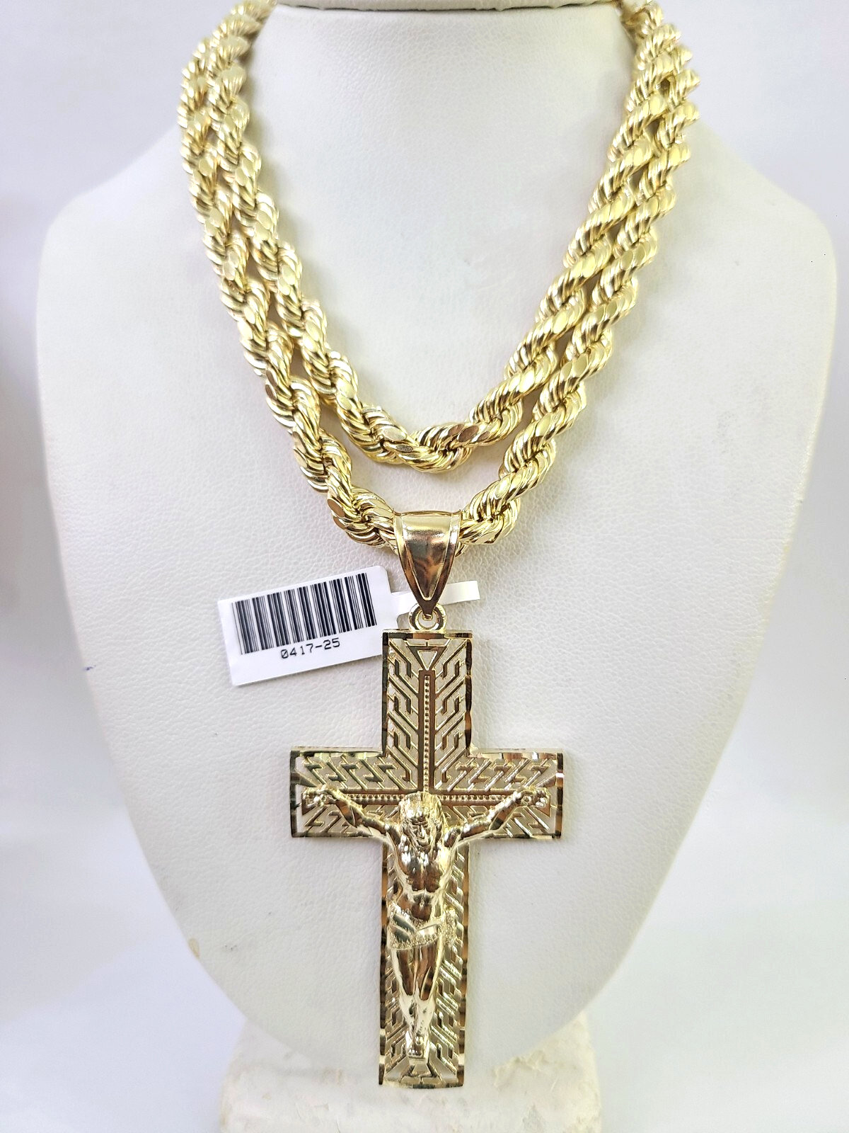 Genuine 10k Yellow Gold Rope Chain 18-30 Inches 7mm Necklace with Jesus Cross Charm design as a SET. The Various length of the Chain are 18-30 Inch with Jesus Cross Charm. If you are not happy with the way it looks or feels, we do offer 30 - Days FREE Return shipping. Contact us for more information.