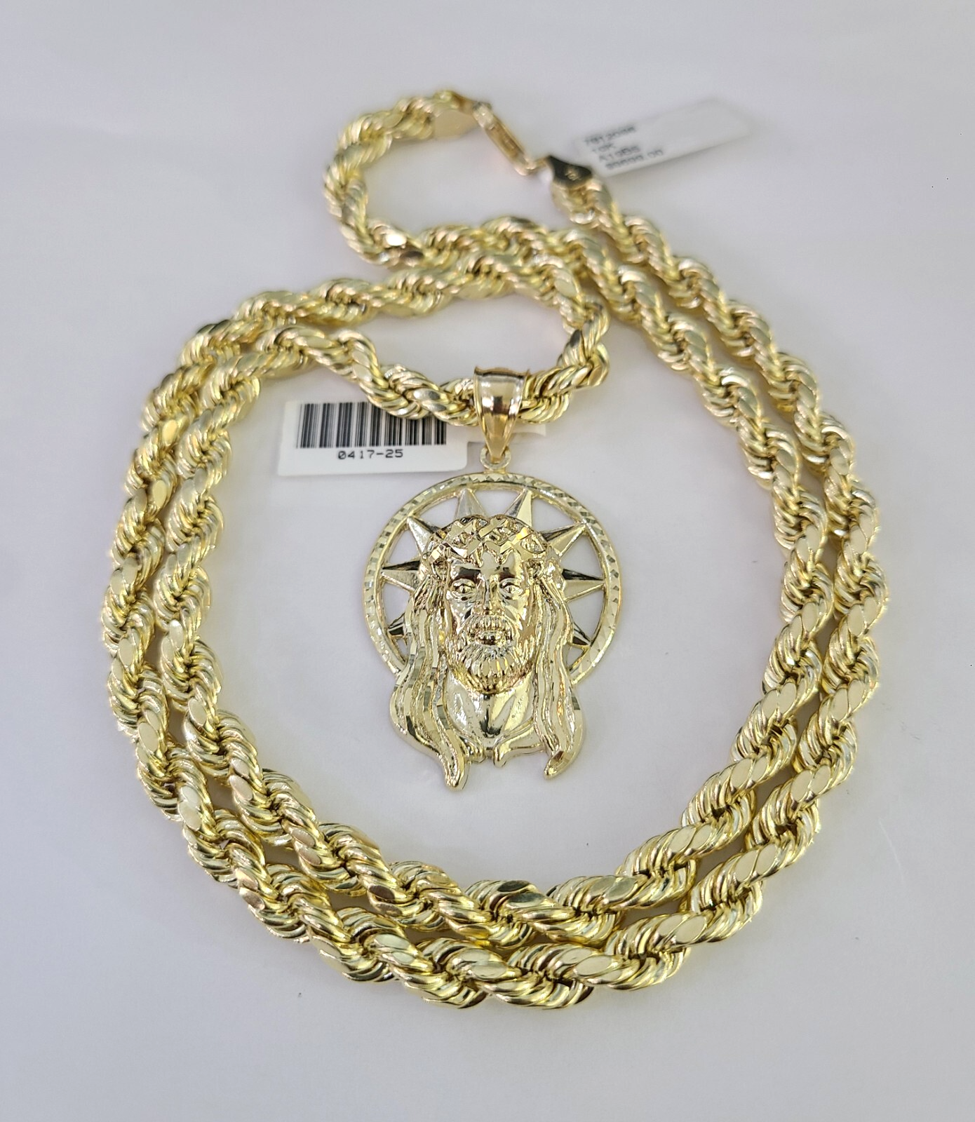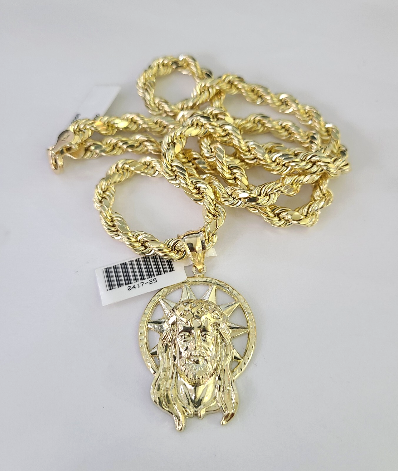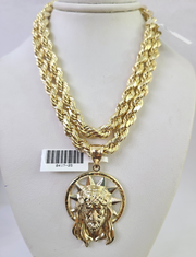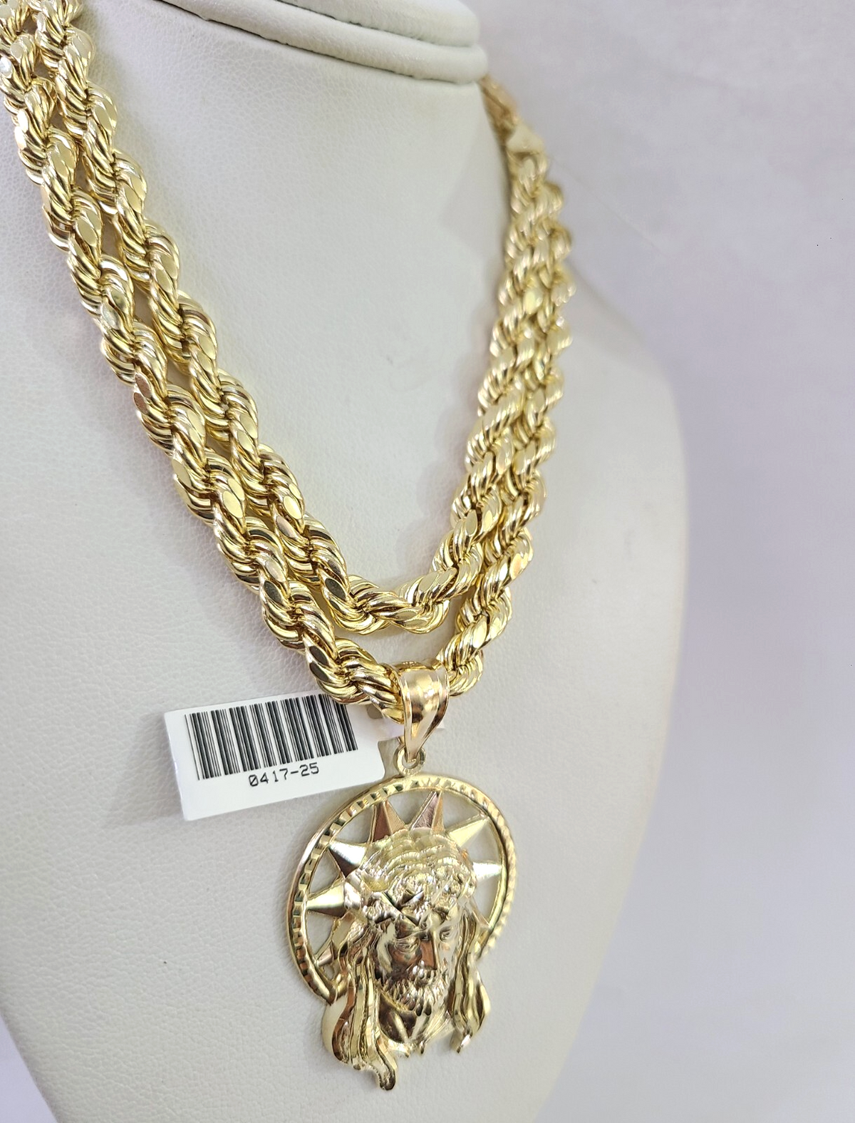 10k Rope Chain Jesus Head Charm Pendant Gold 18"-30'' Inch 7mm Necklace