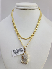 Is Presenting You with This Absolutely Stunning Real 10k Yellow Gold Solid Miami Cuban Chain 2.5mm, 18-26 Inches with Diamond Praying Hands Charm, Lobster Lock. The links are 10K GOLD and are very strong. These Beautiful Chains will not tarnish, discolor, or fade because they are Pure 10K Gold. We also have them in various another length. Please feel free to contact us if you have any queries regarding the item. 22"-A11B3 SJ431D12