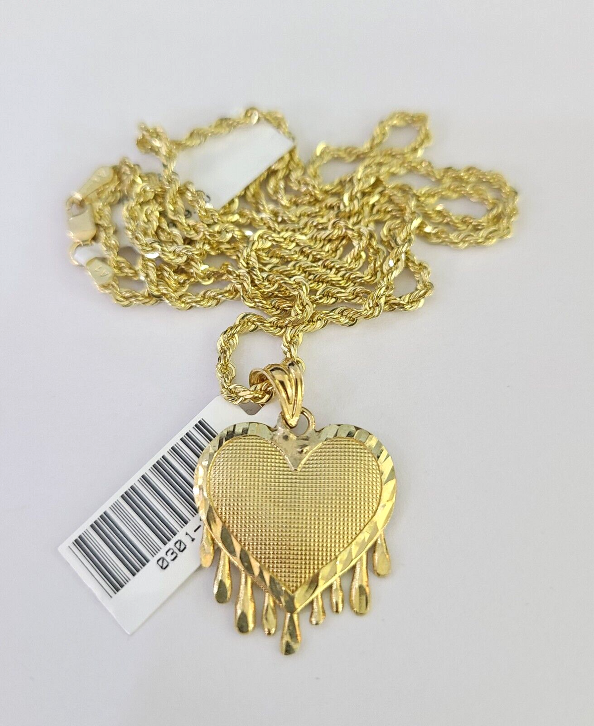 10k Solid Rope Chain 2mm Dripping Heart Pendant Charm Necklace SET 16-22" Ladies