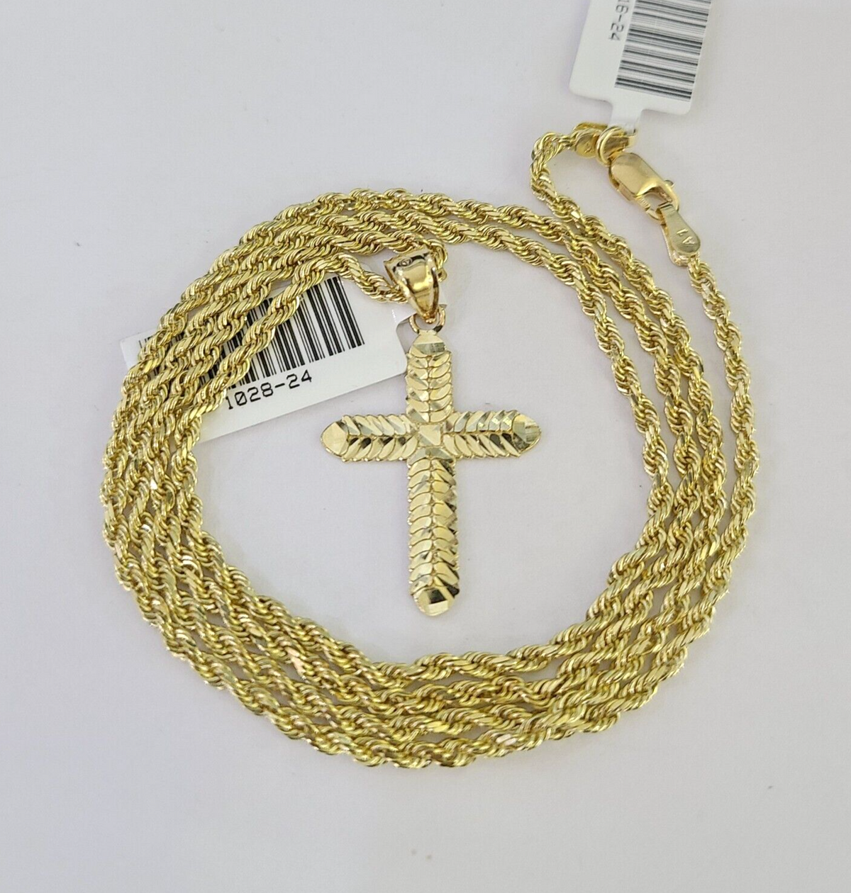 10k Solid Rope Chain 2mm Jesus Cross Pendant Charm Necklace SET 18-24 in