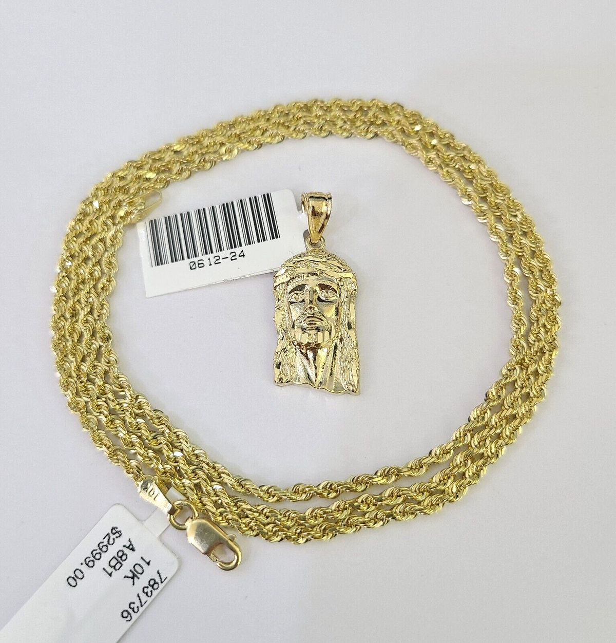 Is Presenting You with This Beautifully Designed Real 10k Yellow Gold Jesus Head Charm with 10k 2mm Solid Rope Chain in various lengths. Please feel free to contact us if you have any queries regarding the item. These Beautiful chains and pendants will not tarnish, discolor, or fade because they are Pure 10K Gold. 22"-A7B4 , A1B3 Cal