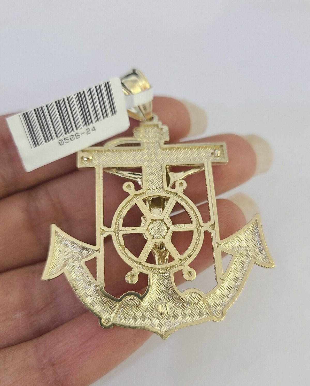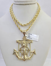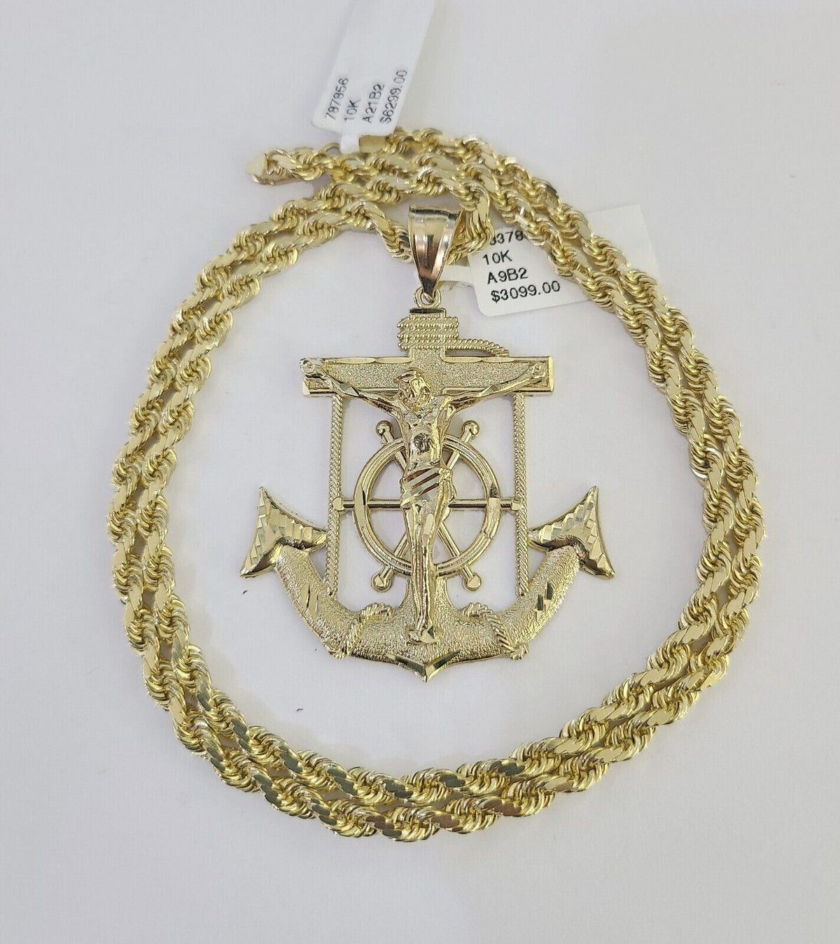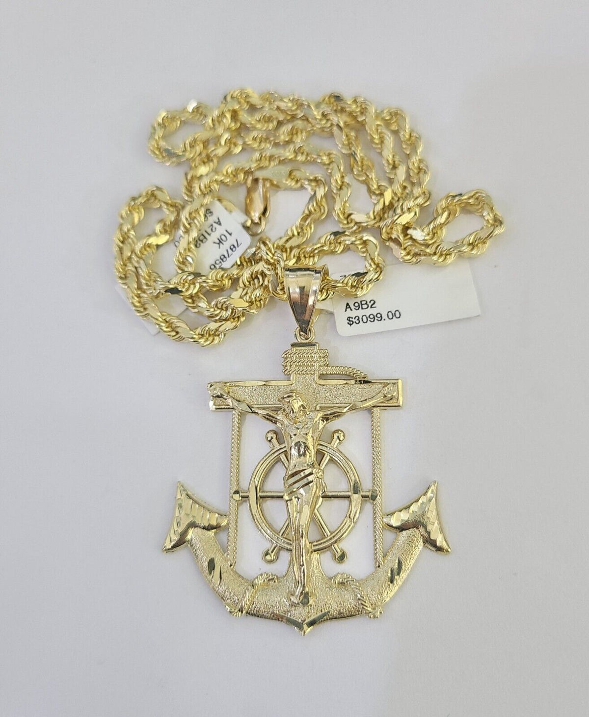 Is Presenting You with This Absolutely Stunning Real 10k Yellow Gold Solid Rope Chain 4mm, 18 inch-30 inches, Lobster Lock with a 10k Jesus Anchor Pendant. These Beautiful chains and Pendant will not tarnish, discolor, or fade because they are Pure 10K Gold. We also have them in various another length and sizes. 20"-21.2 A9B2
