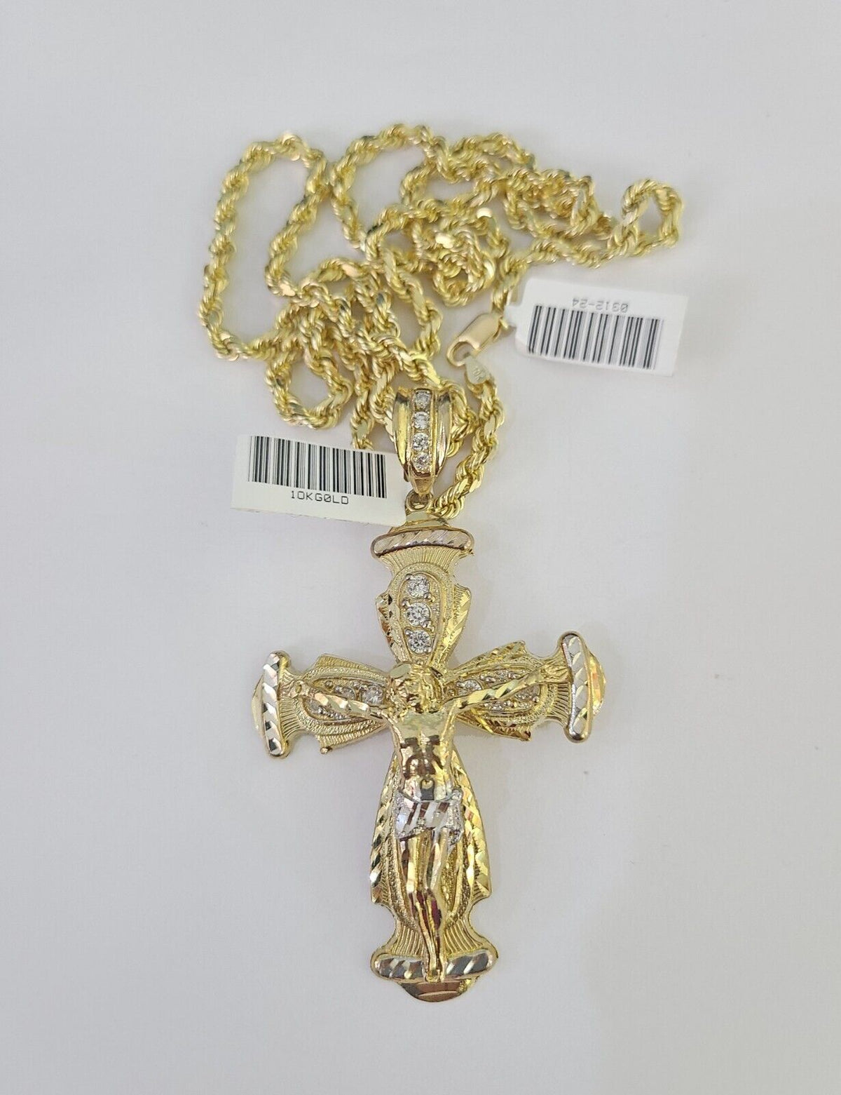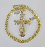 10k Solid Rope Chain Jesus Cross Charm Set 4mm 20"-28" Necklace Gold Yellow