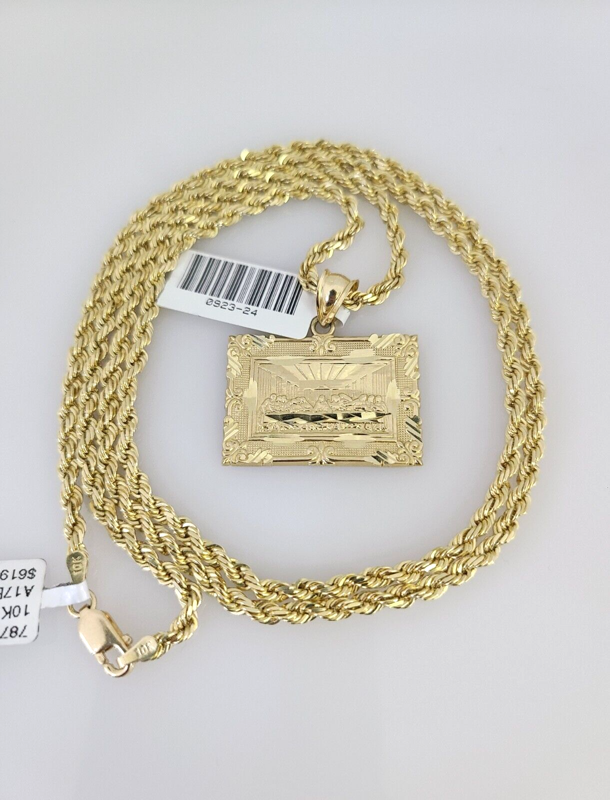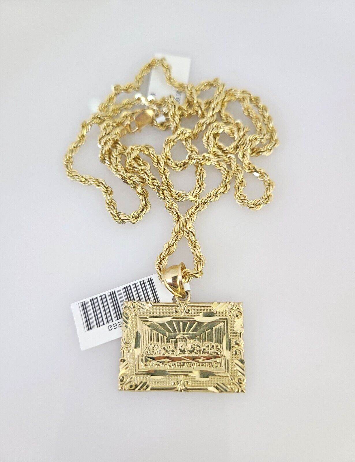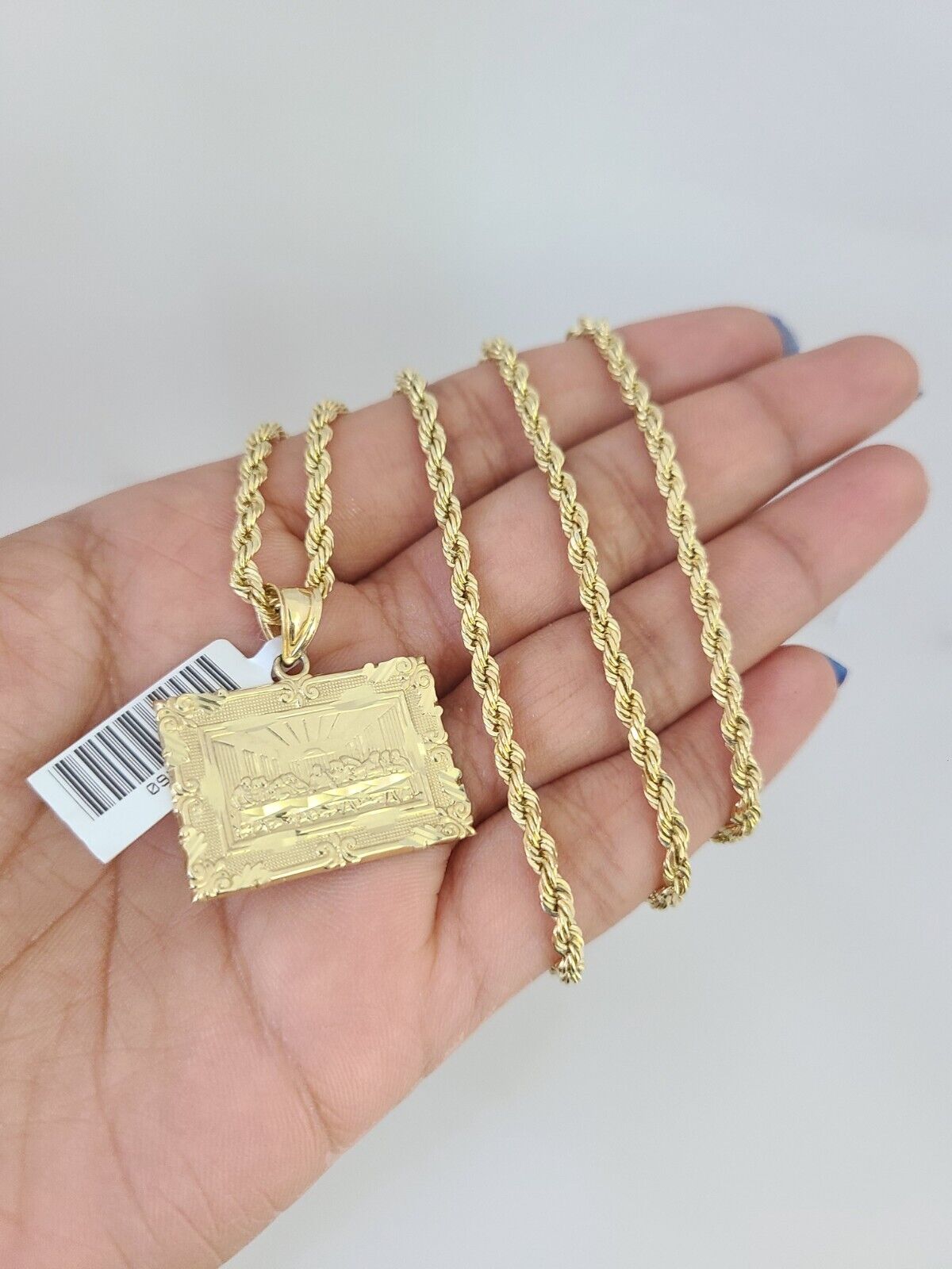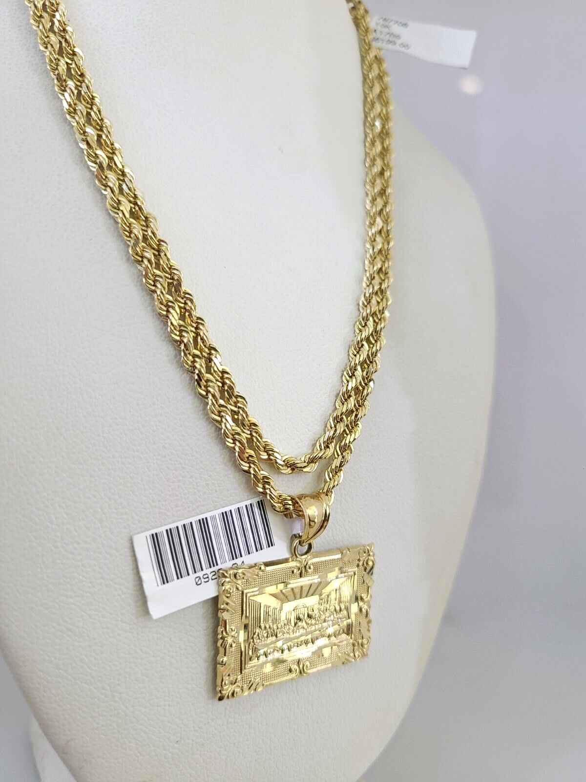 Genuine 10k Yellow Gold Rope Chain 3mm With Last Supper design. The Various length of the Chain are 18"-26" with Last Supper. The pendants are unique in design and considered durable too. If you are not happy with the way it looks or feels, we do offer 30 - Days FREE Return shipping. Contact us for more information.