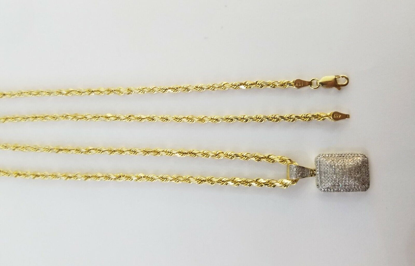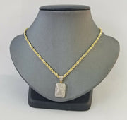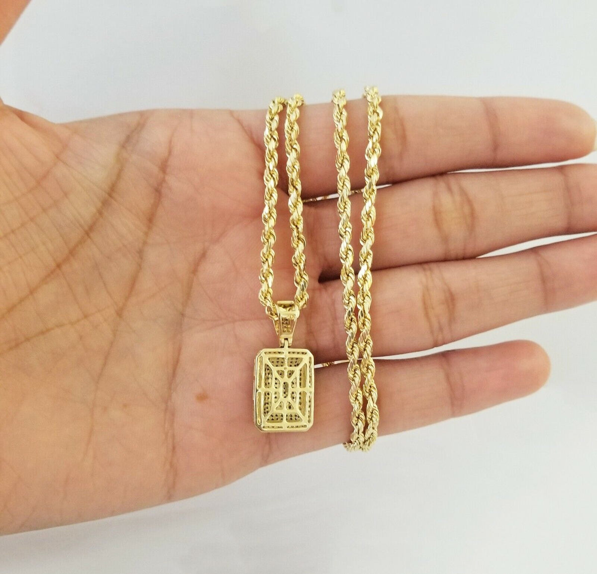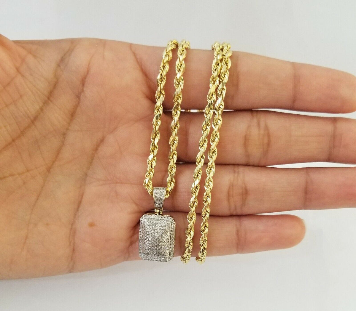 We present You with This Absolutely Stunning Real 10k Yellow Gold Rope Chain with Real Diamond Pillow Charm Pendant. It has a detailed cut with a very good finish.��These Beautiful Chain and Pendant will not tarnish, discolor, or fade because they are Pure 10K Gold and Diamond. Please feel free to contact us if you have any queries regarding the item.��