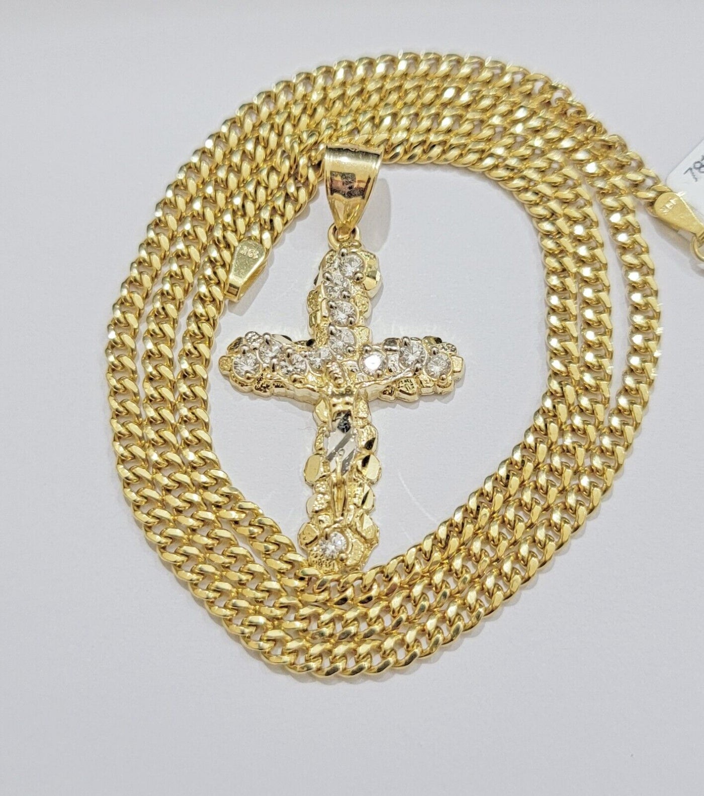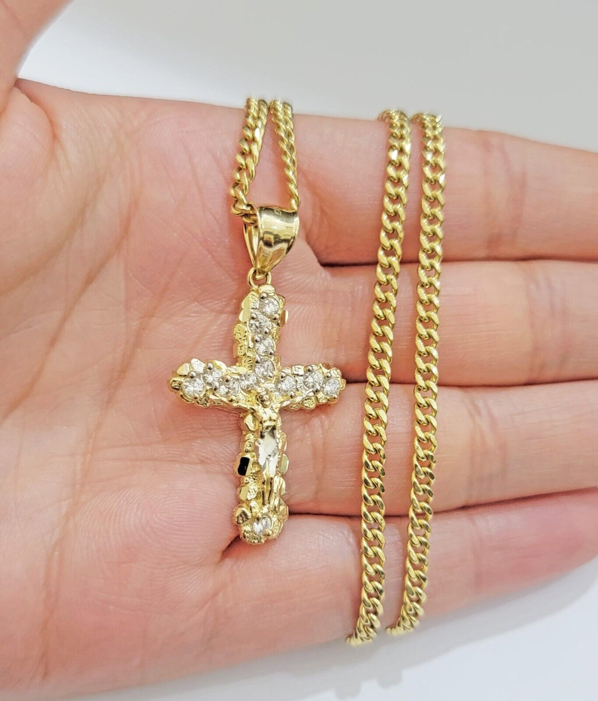 10k Yellow Gold Cross Charm pendant & Miami cuban Link Chain Necklace 2.5mm 18"