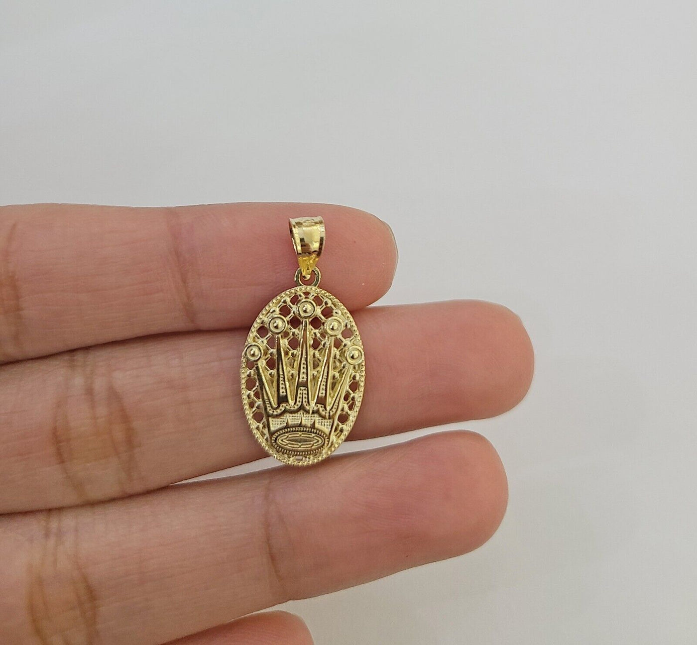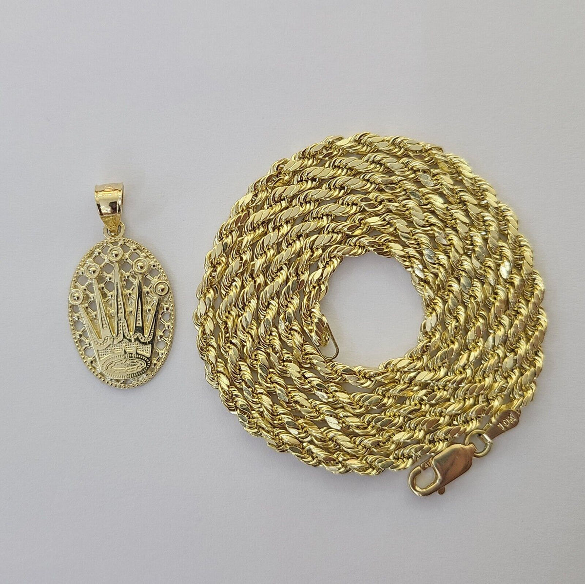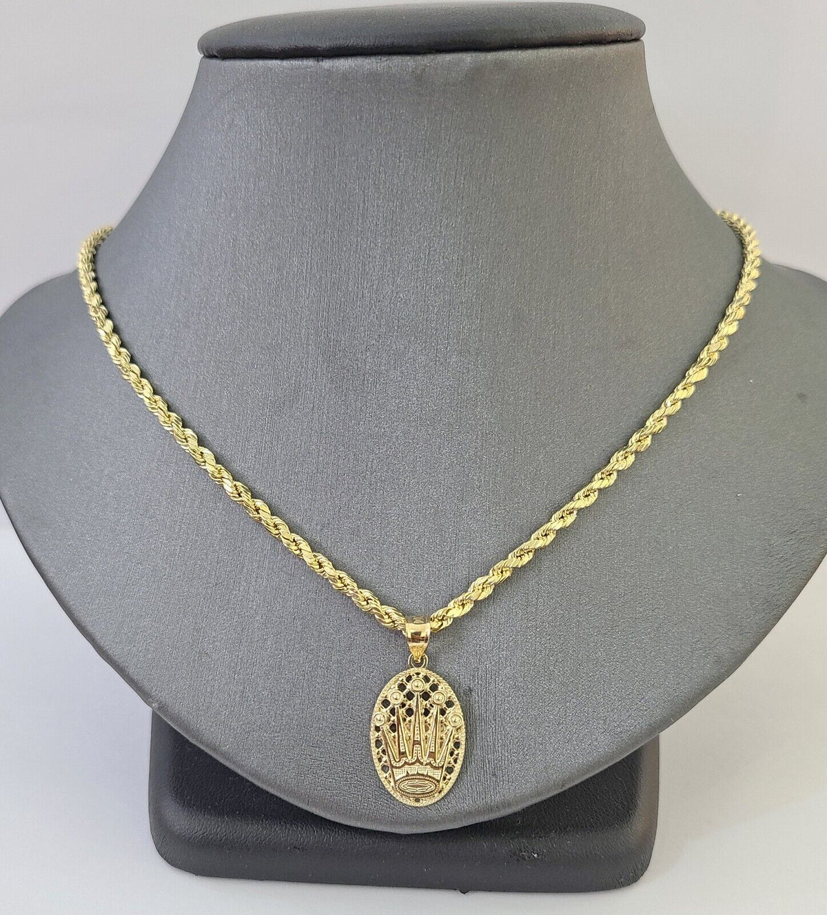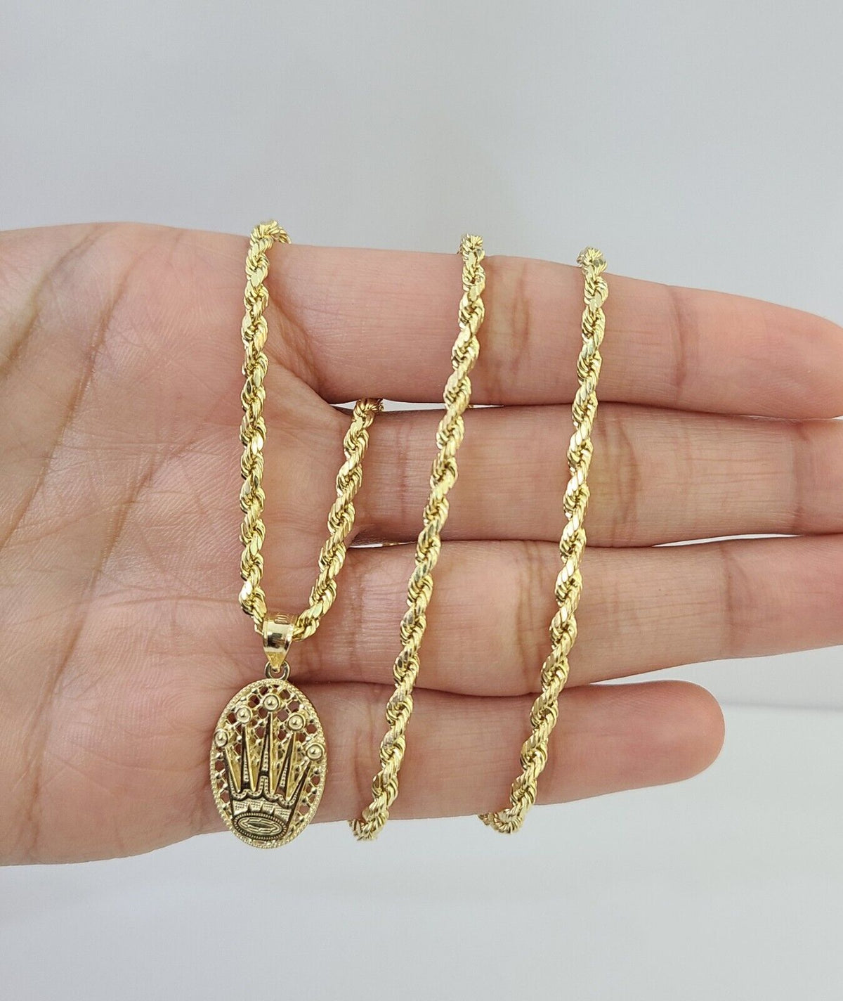 10K Yellow Gold Crown Pendent Charm 3mm Rope Chain 18" 20" 22" 24" 26" Inch