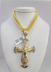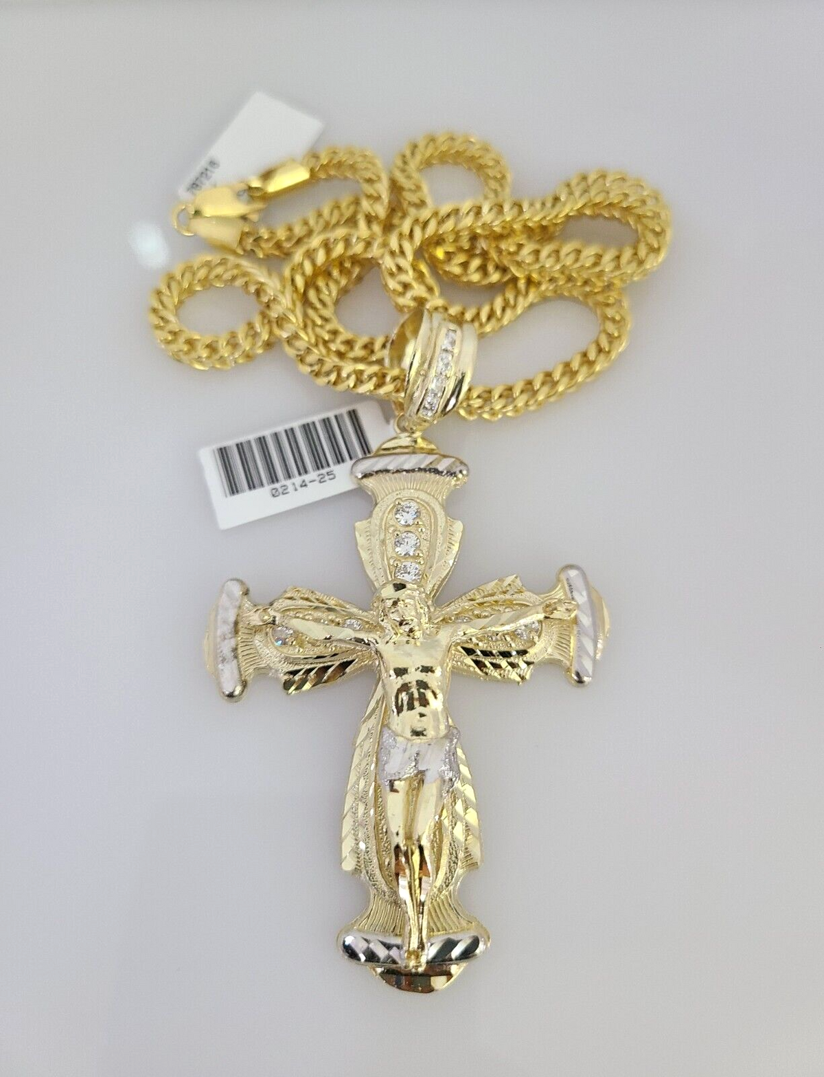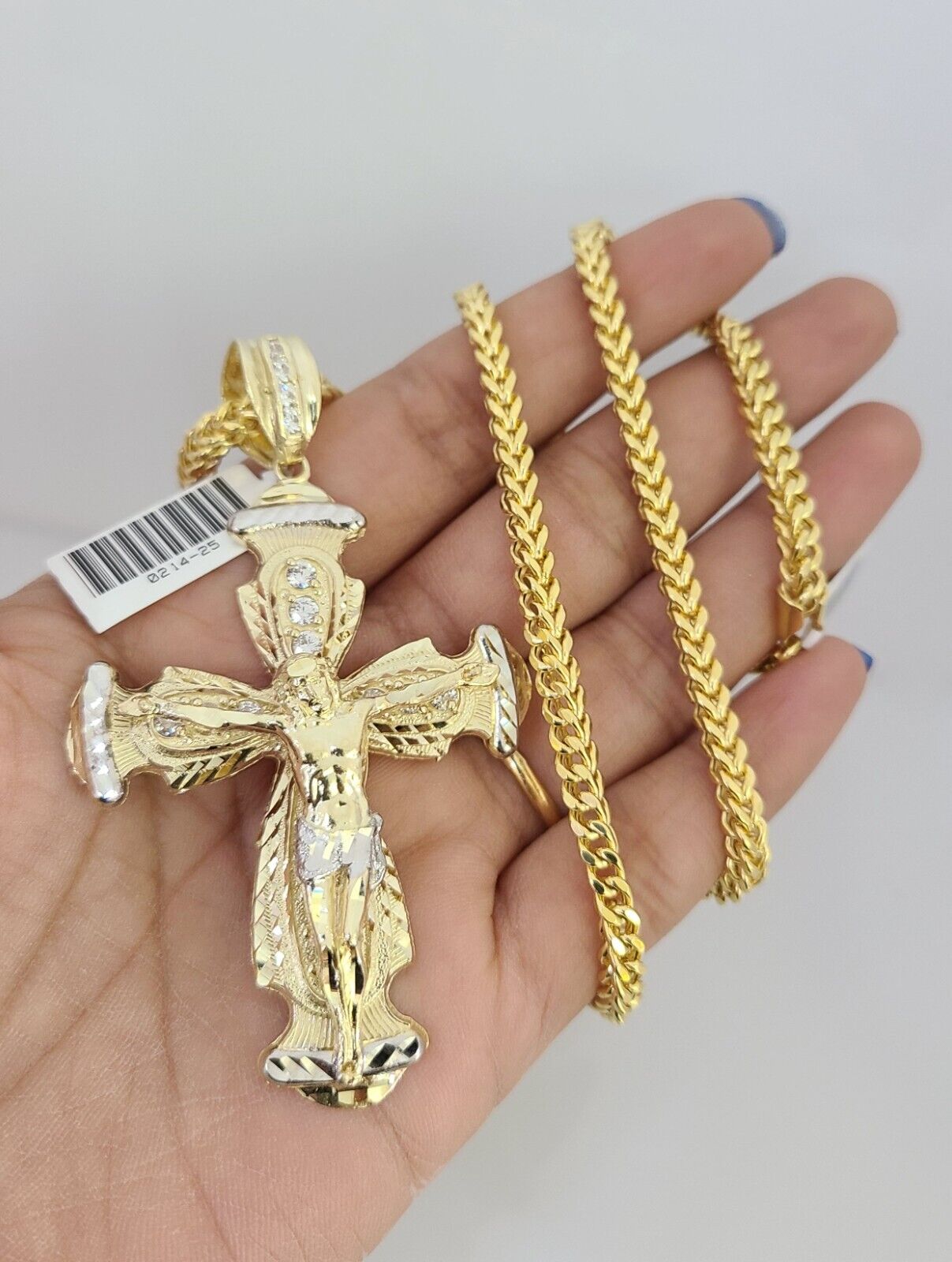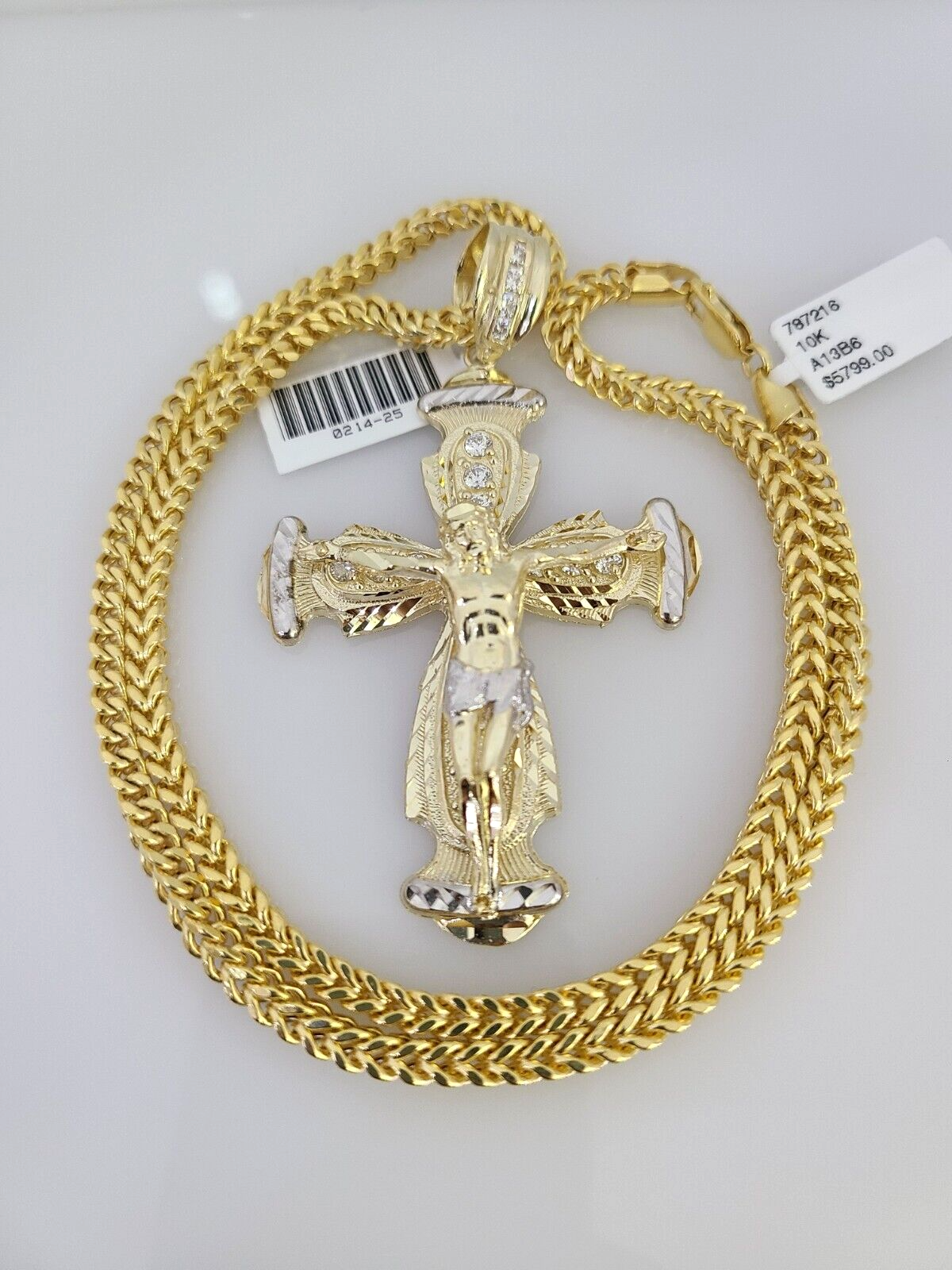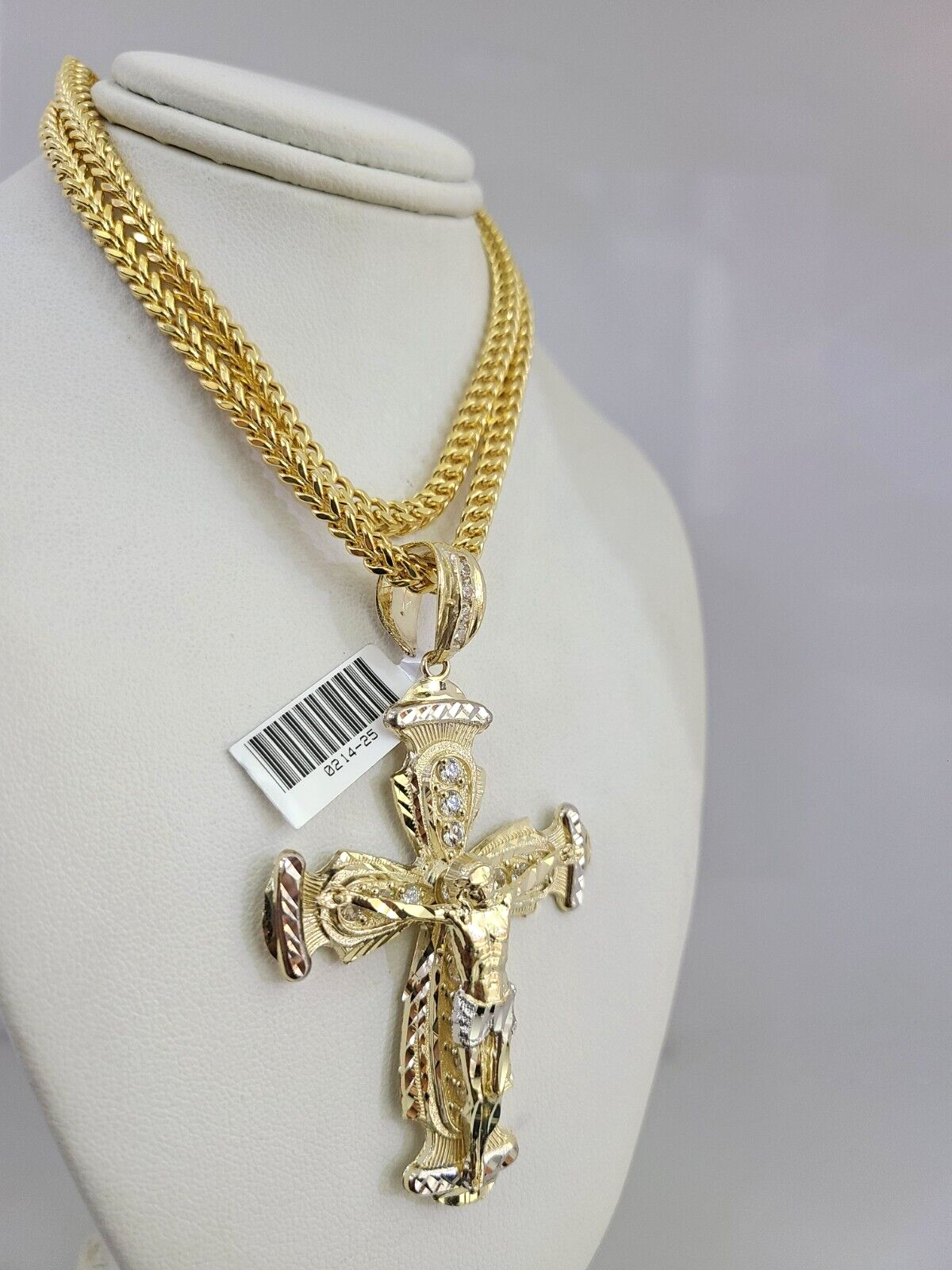 Genuine 10k Yellow Gold Franco Necklace 4mm Franco Chain with Jesus Cross Charm. The Various length of the Chain are 18"-28" with Jesus Cross Charm. The pendants are unique in design and considered durable too. If you are not happy with the way it looks or feels, we do offer 30 - Days FREE Return shipping. Contact us for more information.