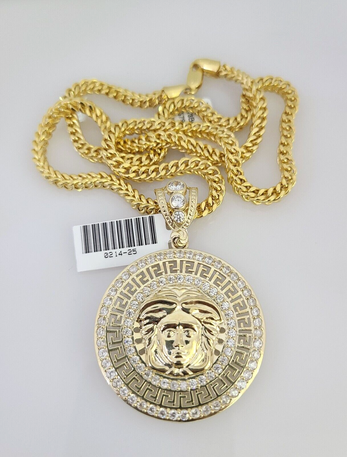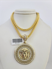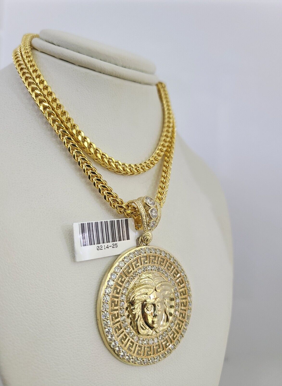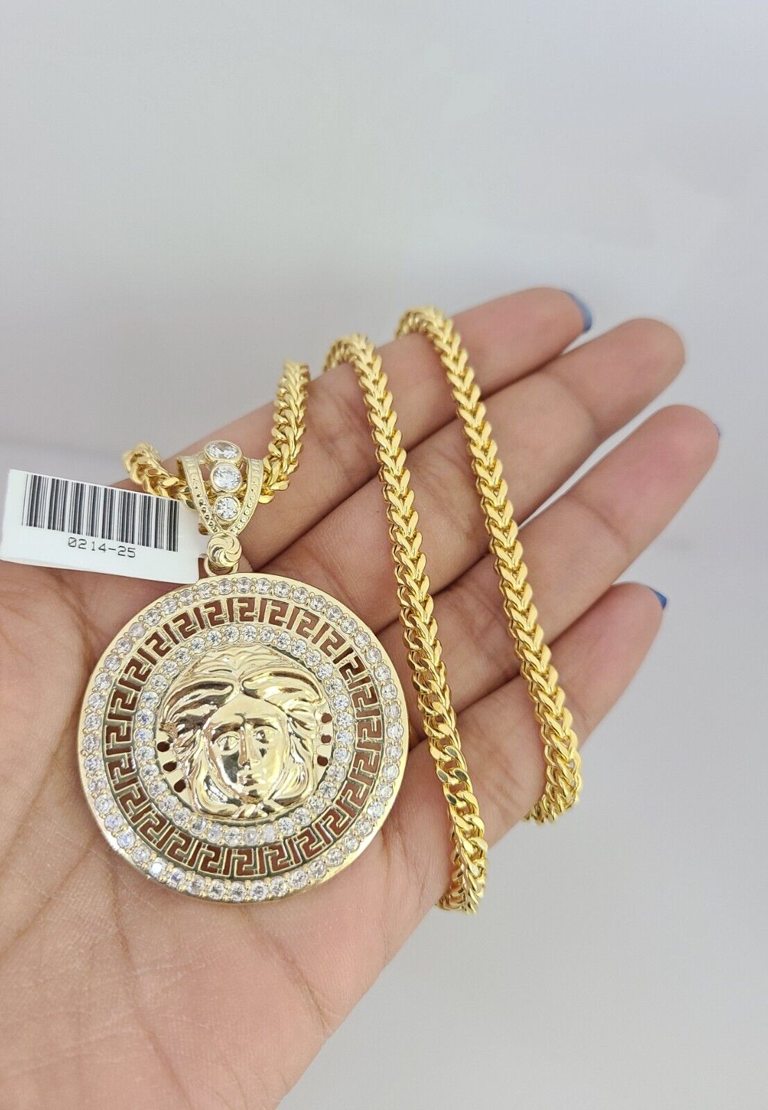 Genuine 10k Yellow Gold Franco Necklace 4mm Franco Chain with Medusa Head Charm. The Various length of the Chain are 18"-28" with Medusa Head Charm. The pendants are unique in design and considered durable too. If you are not happy with the way it looks or feels, we do offer 30 - Days FREE Return shipping. Contact us for more information.