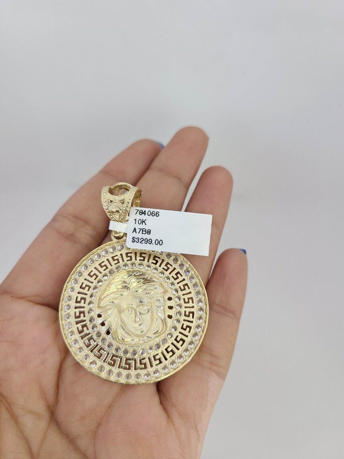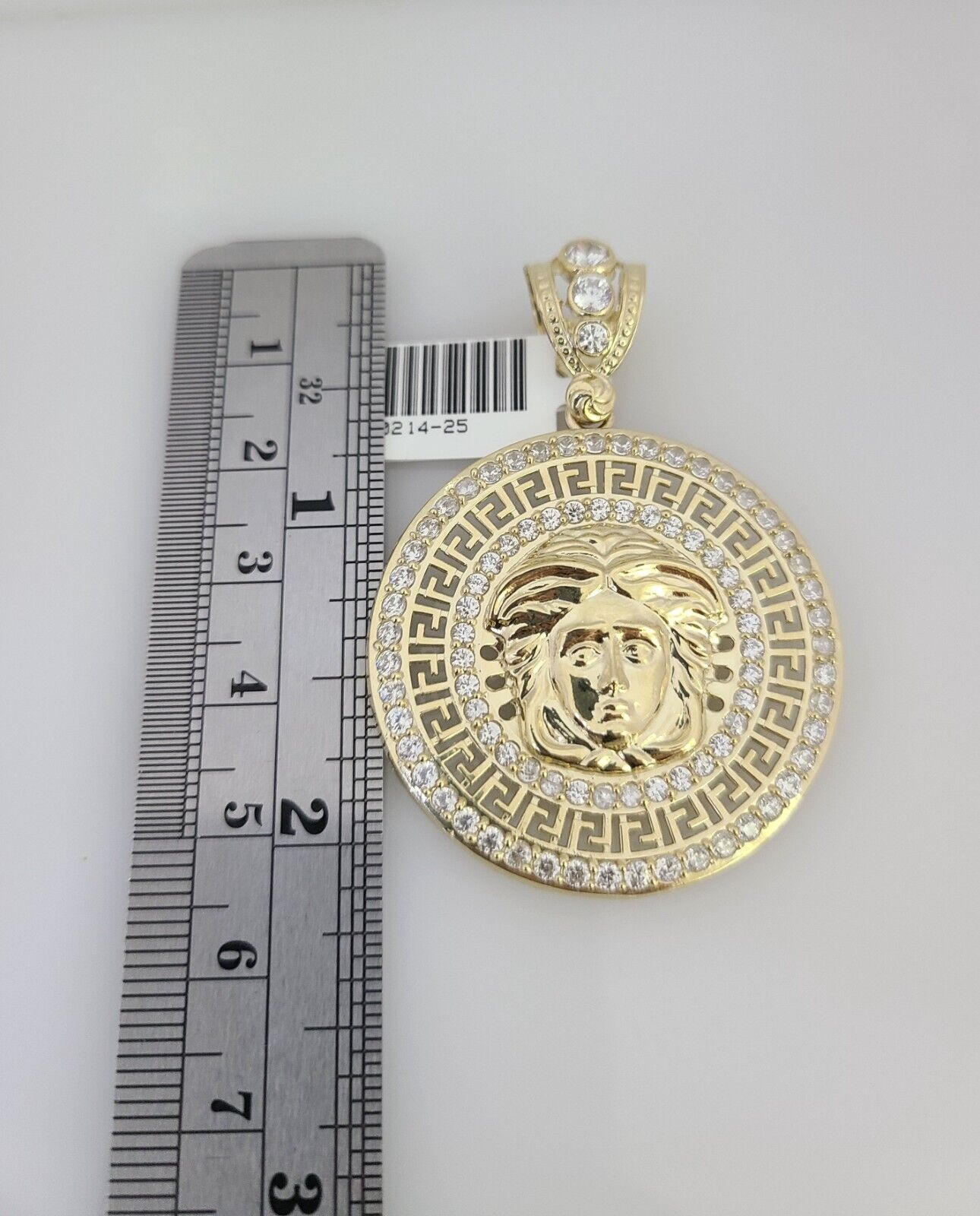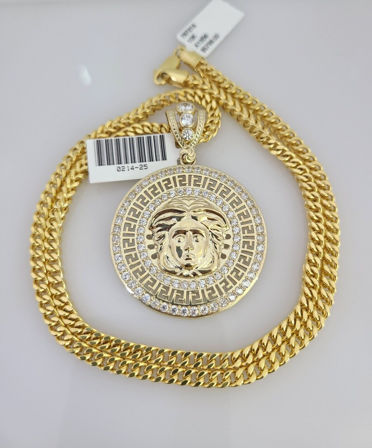 Genuine 10k Yellow Gold Franco Necklace 4mm Franco Chain with Medusa Head Charm. The Various length of the Chain are 18"-28" with Medusa Head Charm. The pendants are unique in design and considered durable too. If you are not happy with the way it looks or feels, we do offer 30 - Days FREE Return shipping. Contact us for more information.