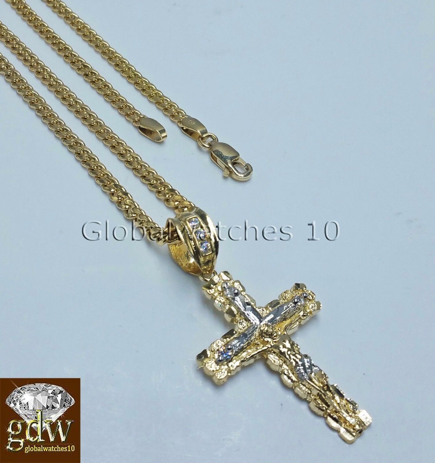 We present You with This Absolutely Stunning Real 10k Yellow Gold Miami Cuban Chain with Jesus Cross Charm. It has a detailed cut with a very good finish.��These Beautiful Pendant and Chain will not tarnish, discolor, or fade because they are Pure 10K Gold. Please feel free to contact us if you have any queries regarding the item.��