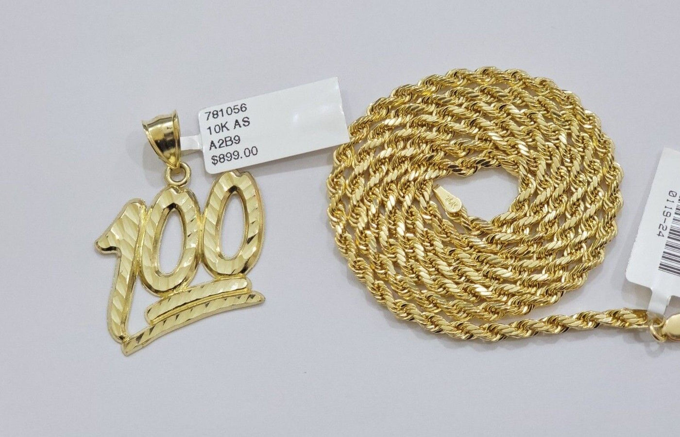 Genuine 10 k Yellow Gold Rope Chain 22 Inch 3mm Necklace With 100 Charm design as a SET. The Various length of the Chain are 22 Inch with 100 Charm 1 inches. If you are not happy with the way it looks or feels, we do offer 30 - Days FREE Return shipping. Contact us for more information.
