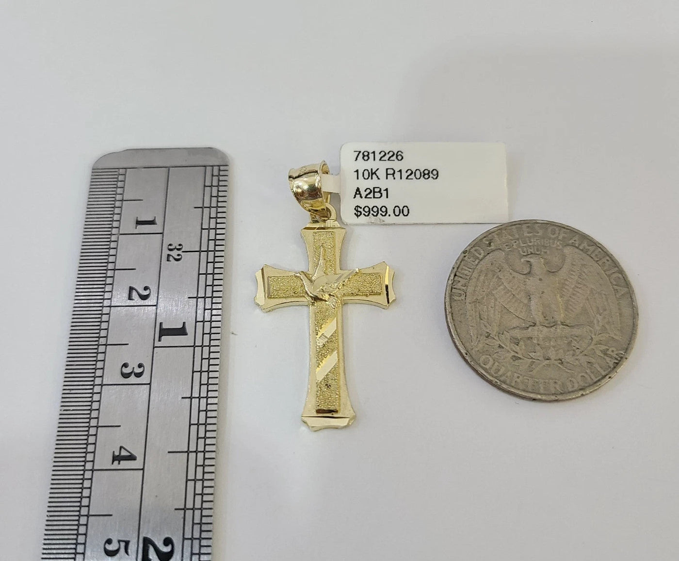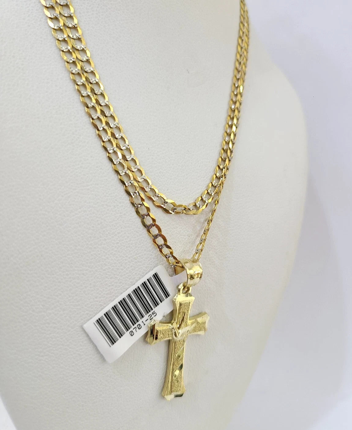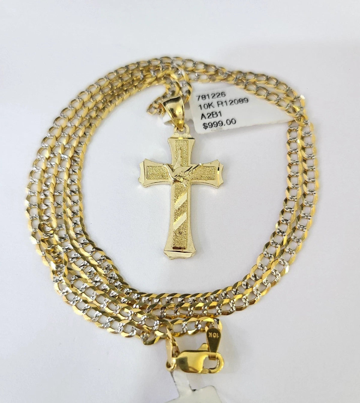 Is Presenting You with This Absolutely Stunning Real 10k Yellow Gold Cuban Curb Chain Diamond Cut 3mm, 18"-28" with Jesus Cross Charm, Lobster Lock. The links are 10K GOLD and are very strong. These Beautiful Chains will not tarnish, discolor, or fade because they are Pure 10K Gold. We also have them in various another length. Please feel free to contact us if you have any queries regarding the item.