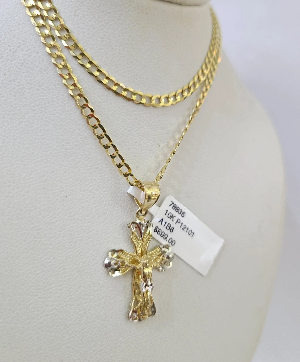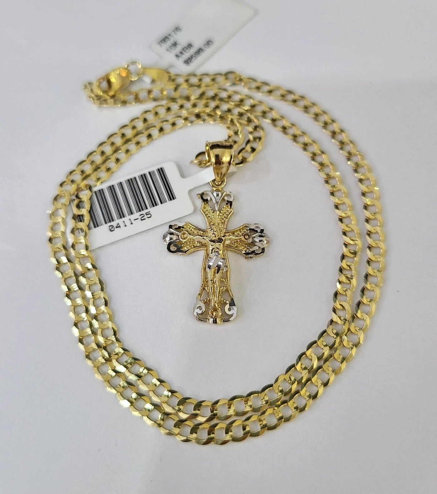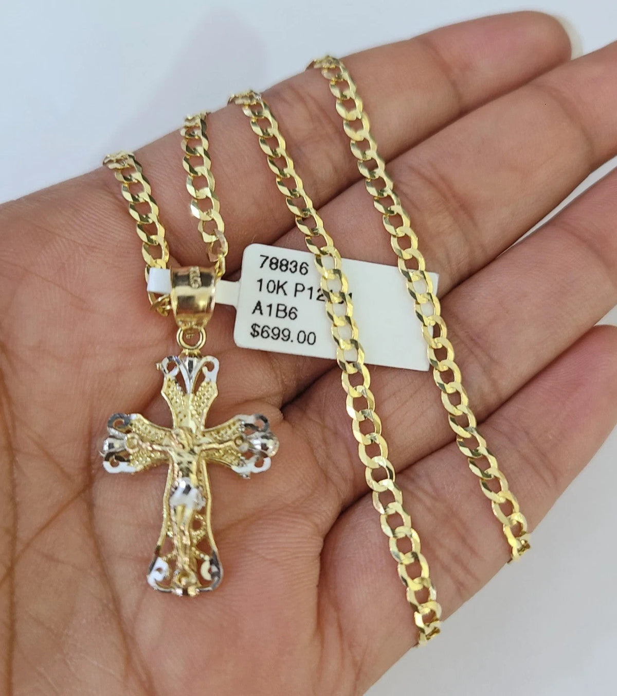 Is Presenting You with This Absolutely Stunning Real 10k Yellow Gold Cuban Curb Chain 3mm, 18"-28" with Jesus Cross Charm, Lobster Lock. The links are 10K GOLD and are very strong. These Beautiful Chains will not tarnish, discolor, or fade because they are Pure 10K Gold. We also have them in various another length. Please feel free to contact us if you have any queries regarding the item.