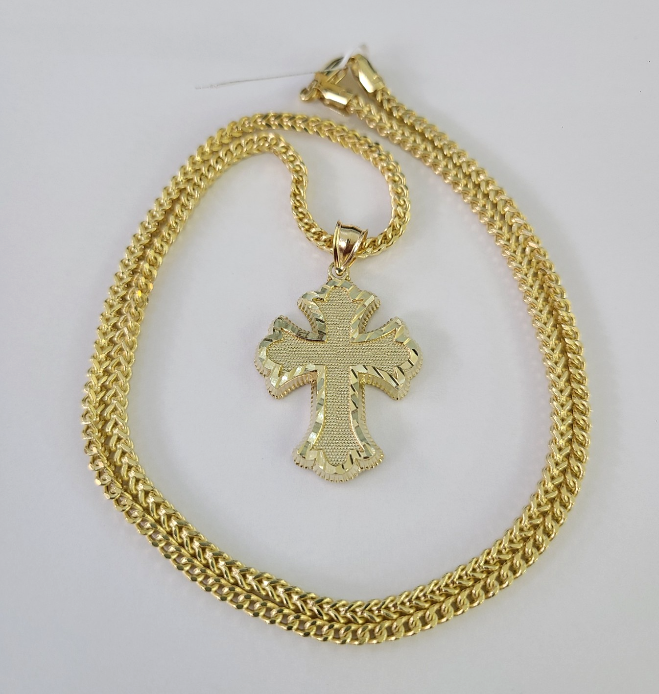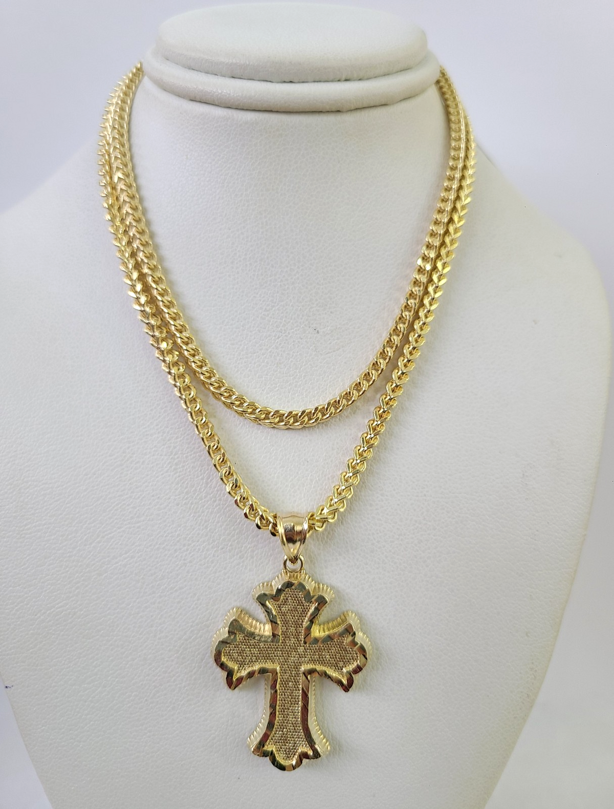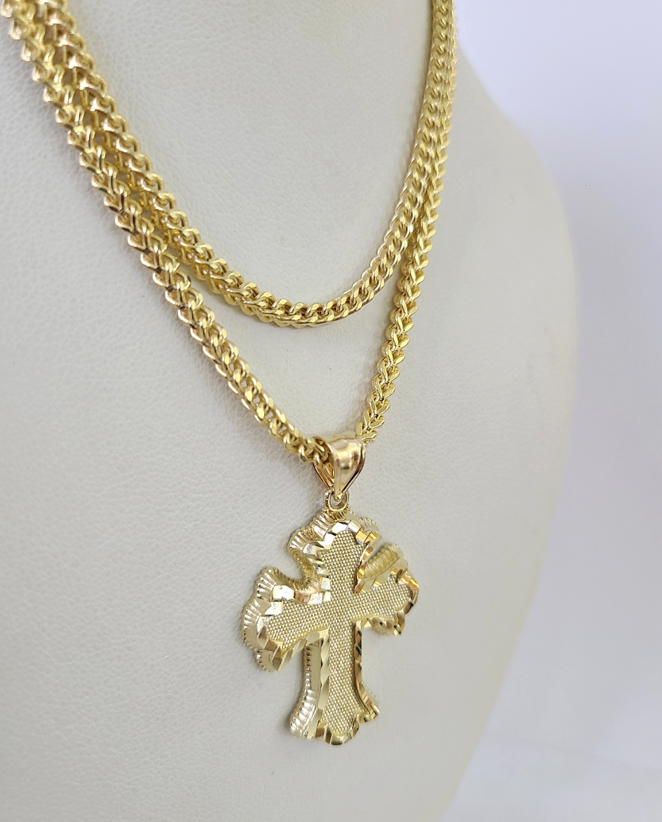 Genuine 10k Yellow Gold Franco Necklace 3mm Chain with Jesus Cross Charm. The Various length of the Chain are 18"-28" inches. The pendants are unique in design and considered durable too. If you are not happy with the way it looks or feels, we do offer 30 - Days FREE Return shipping. Contact us for more information.