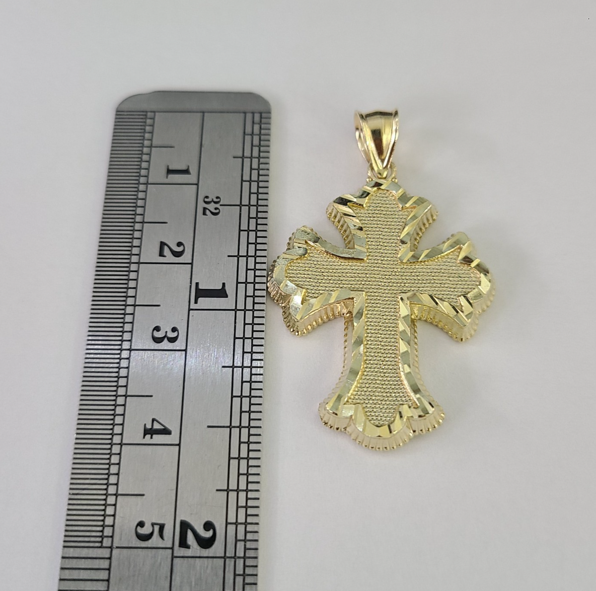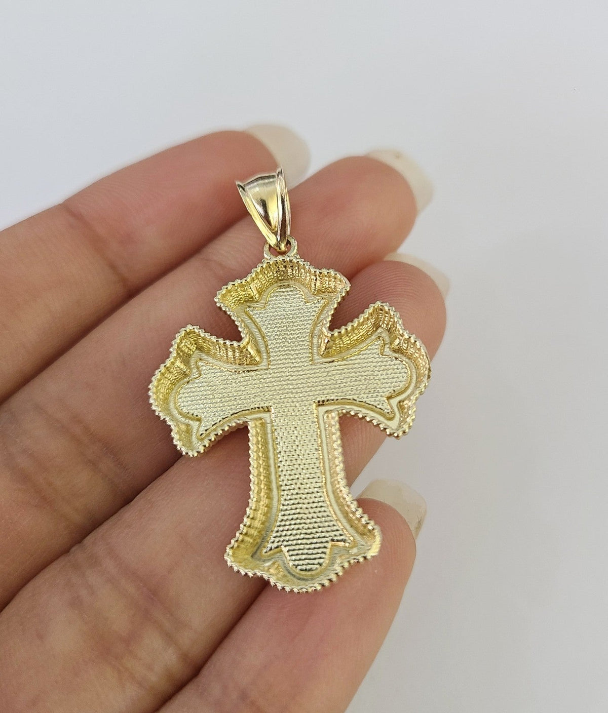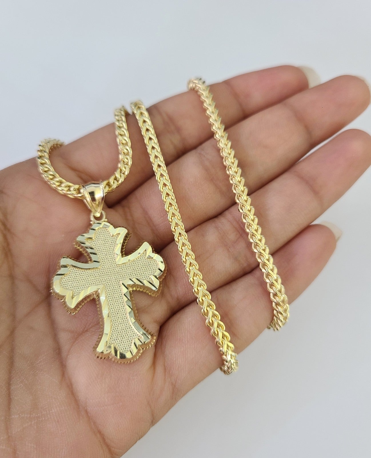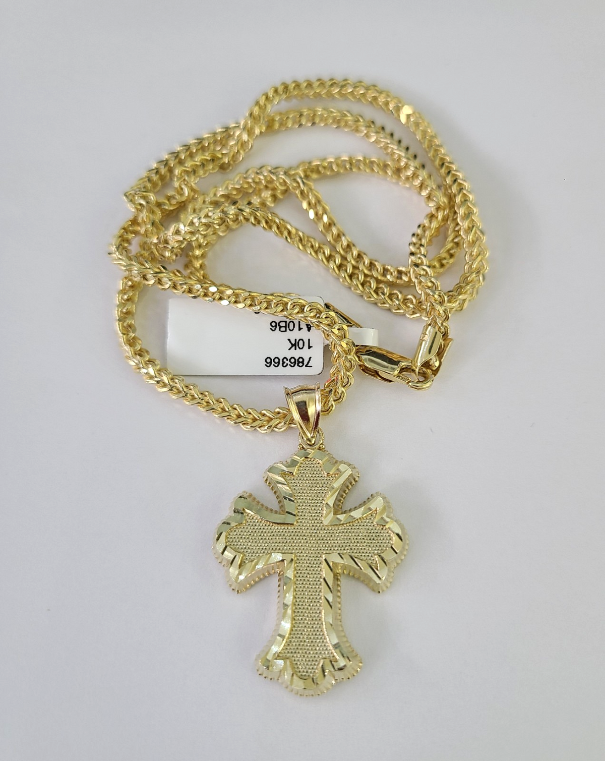 Genuine 10k Yellow Gold Franco Necklace 3mm Chain with Jesus Cross Charm. The Various length of the Chain are 18"-28" inches. The pendants are unique in design and considered durable too. If you are not happy with the way it looks or feels, we do offer 30 - Days FREE Return shipping. Contact us for more information.