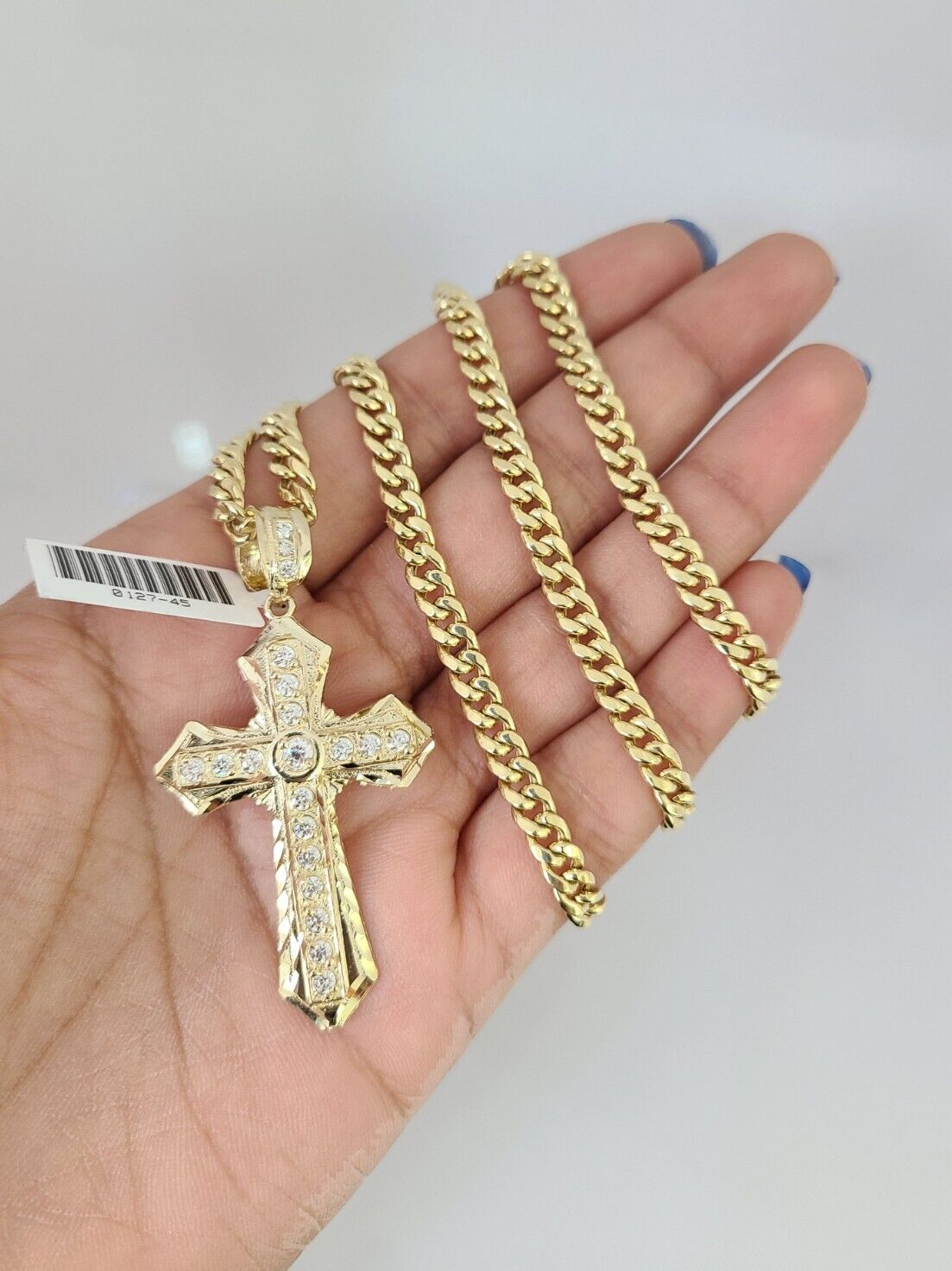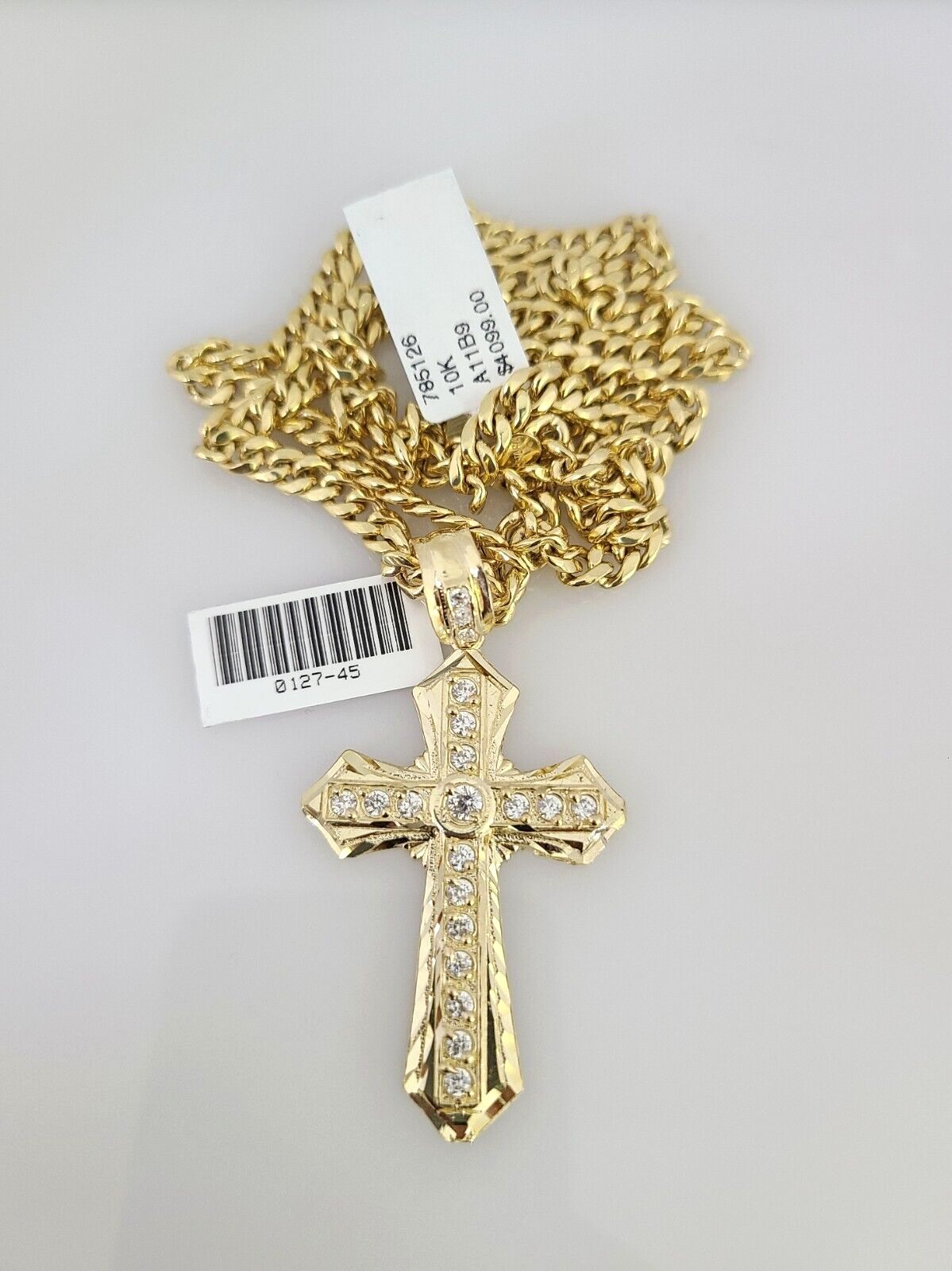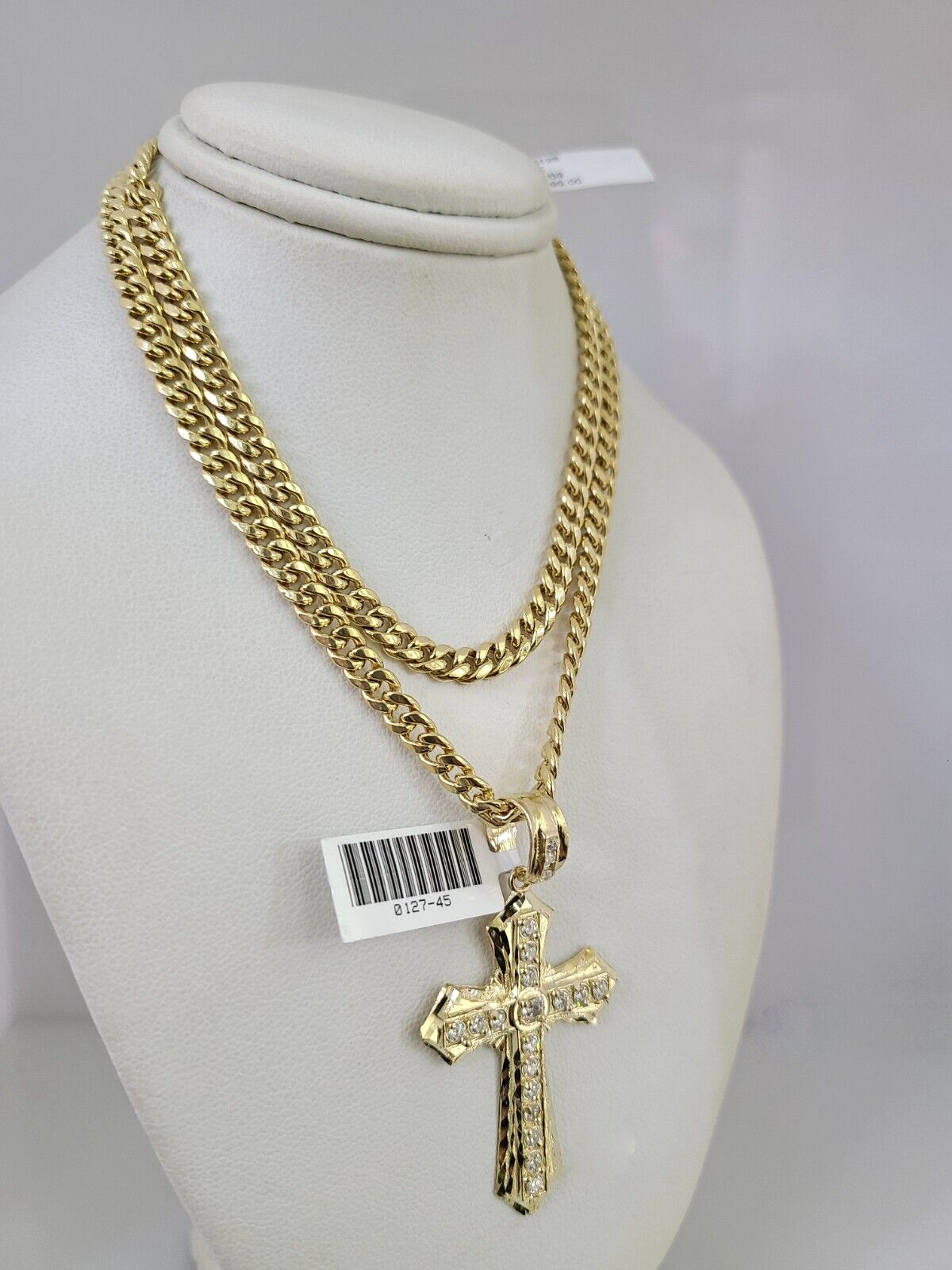 10kt Gold Miami Cuban Chain Jesus Cross Charm Pendant 5mm 18-28Inch Necklace