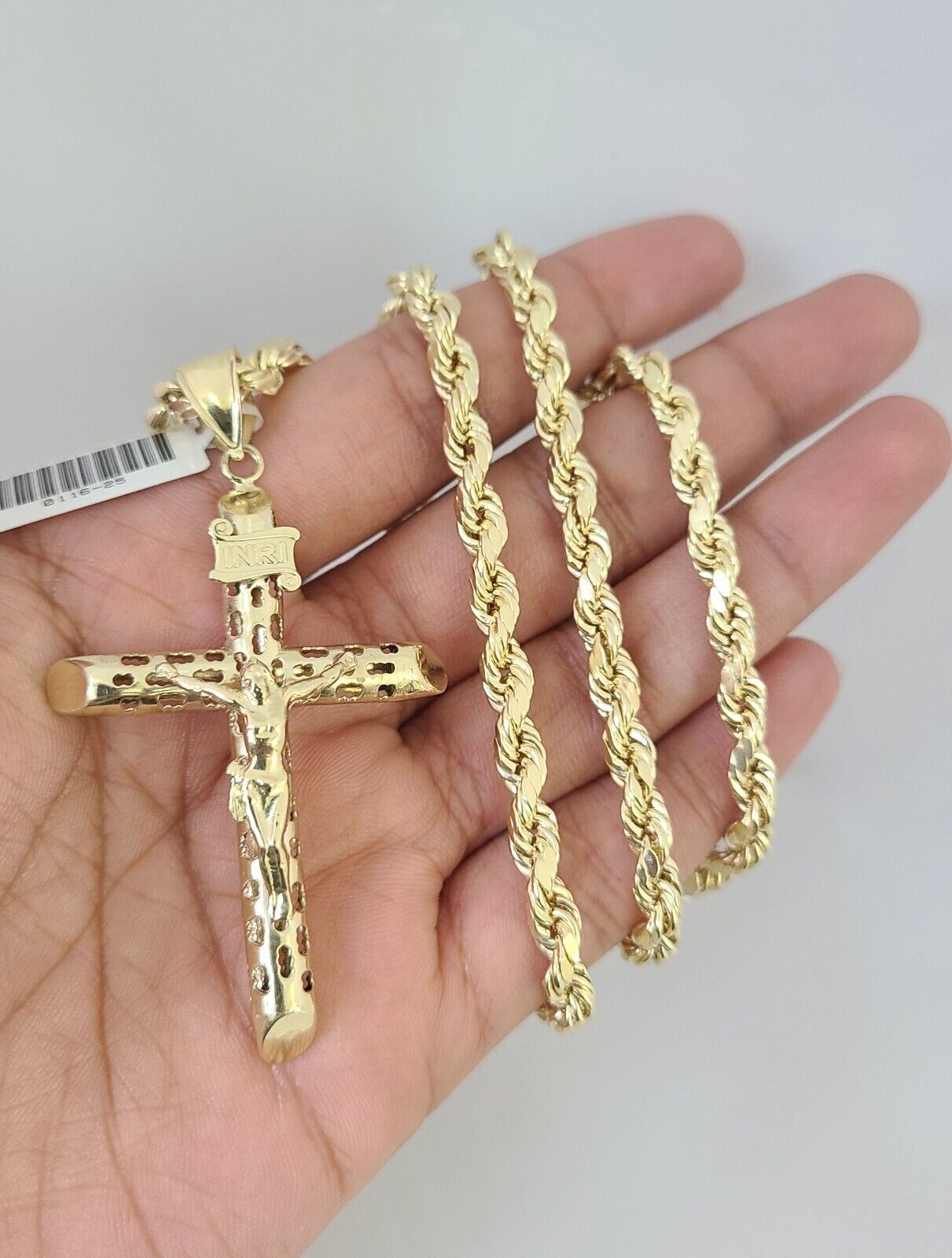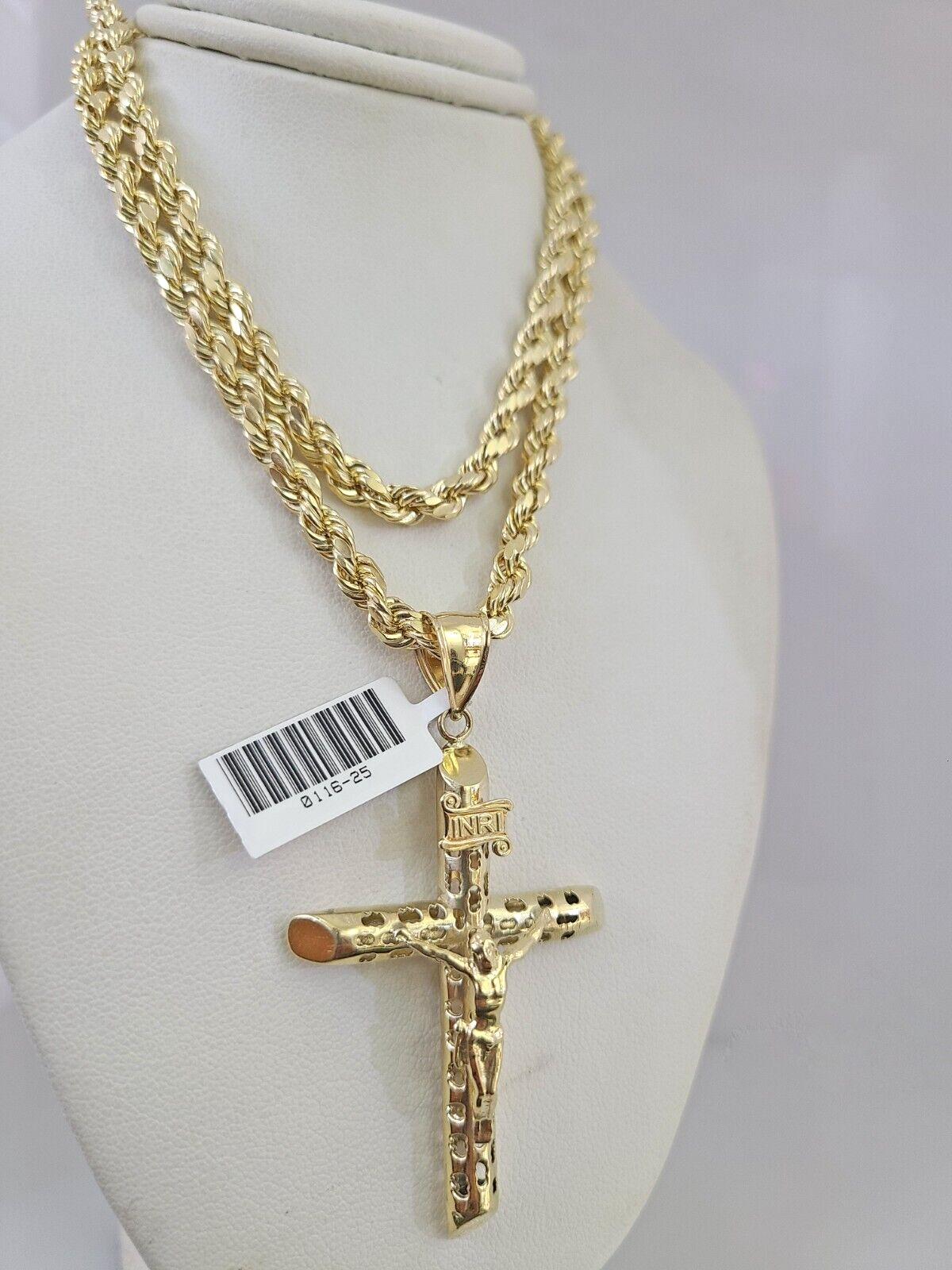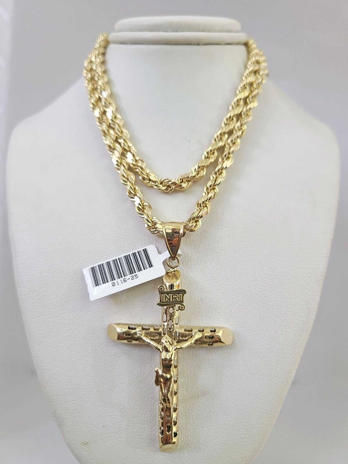Genuine 10k Yellow Gold Rope Chain 18-30 Inch 5mm Necklace With INRI Jesus Cross Charm design as a SET. The Various length of the Chain are 18-30 Inches . If you are not happy with the way it looks or feels, we do offer 30 - Days FREE Return shipping. Contact us for more information.