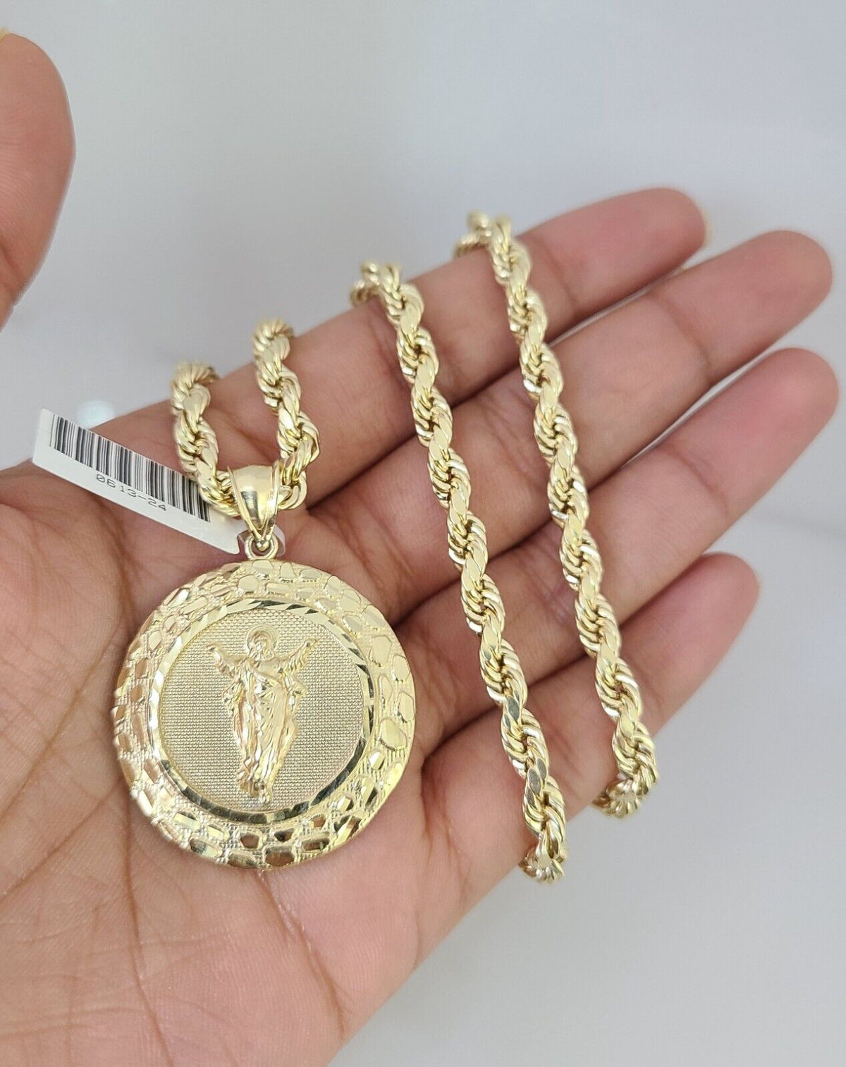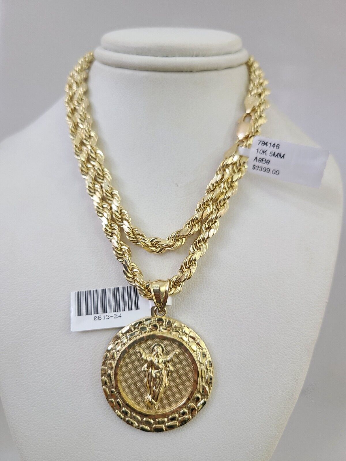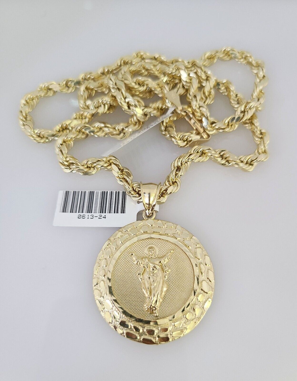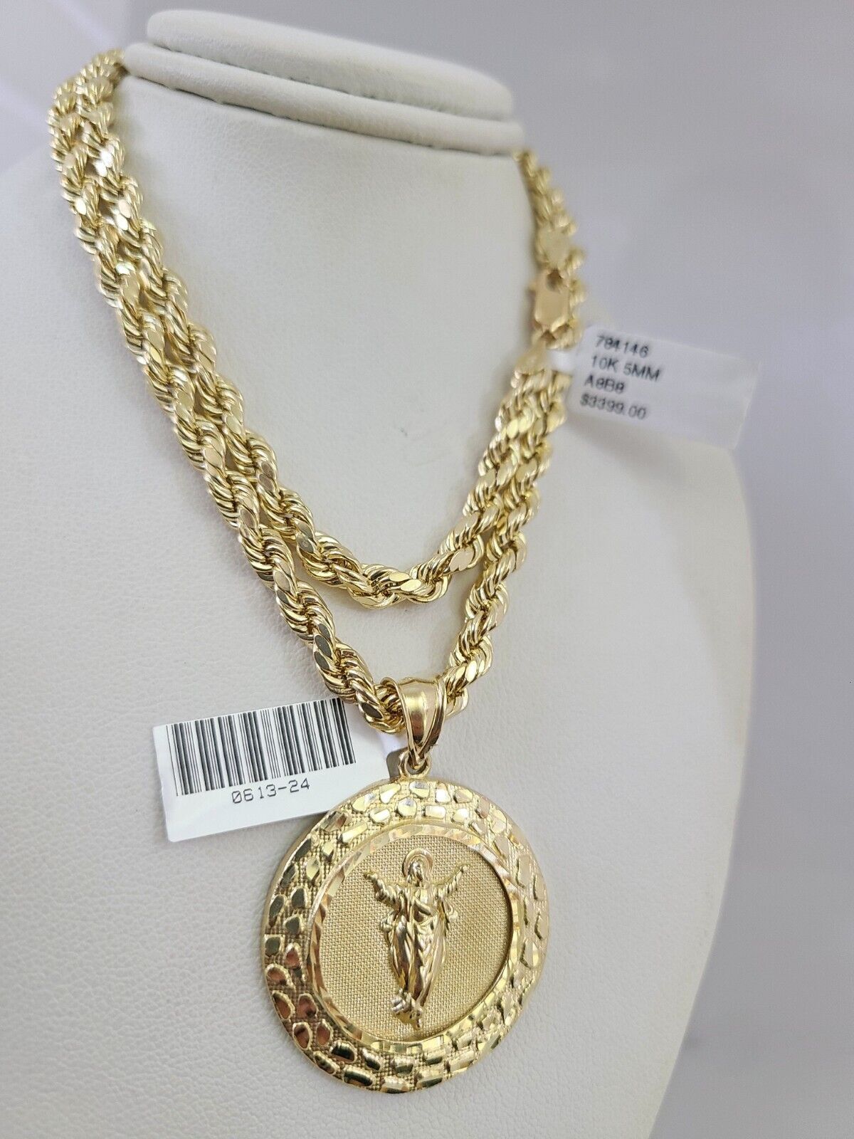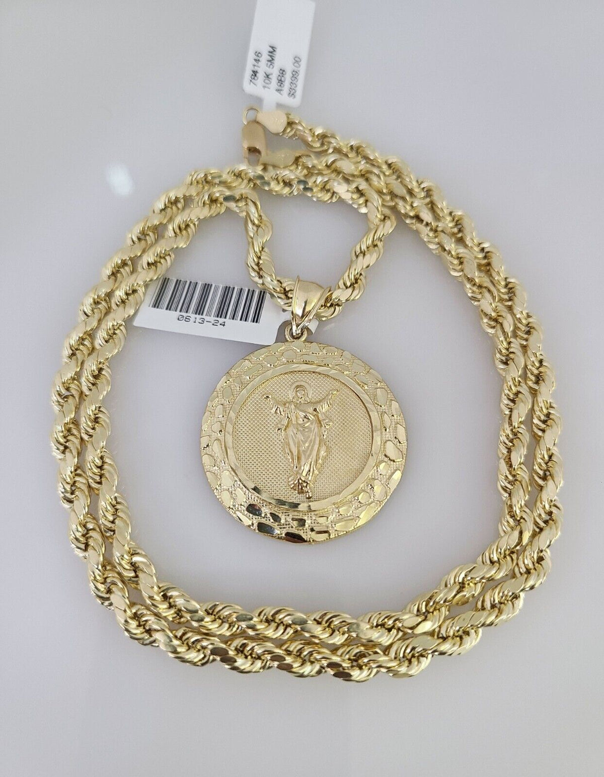 Genuine 10k Yellow Gold Rope Chain 18-30 Inch 5mm Necklace With Jesus Christ Charm design as a SET. The Various length of the Chain are 18-30 Inches . If you are not happy with the way it looks or feels, we do offer 30 - Days FREE Return shipping. Contact us for more information.