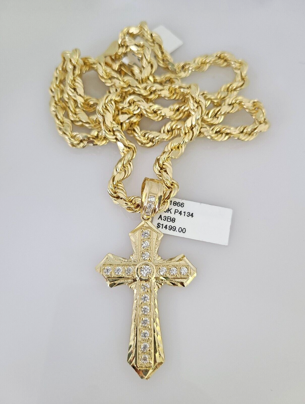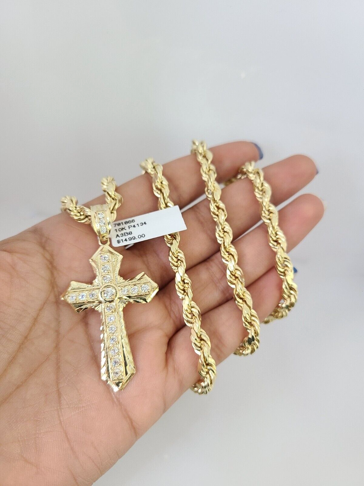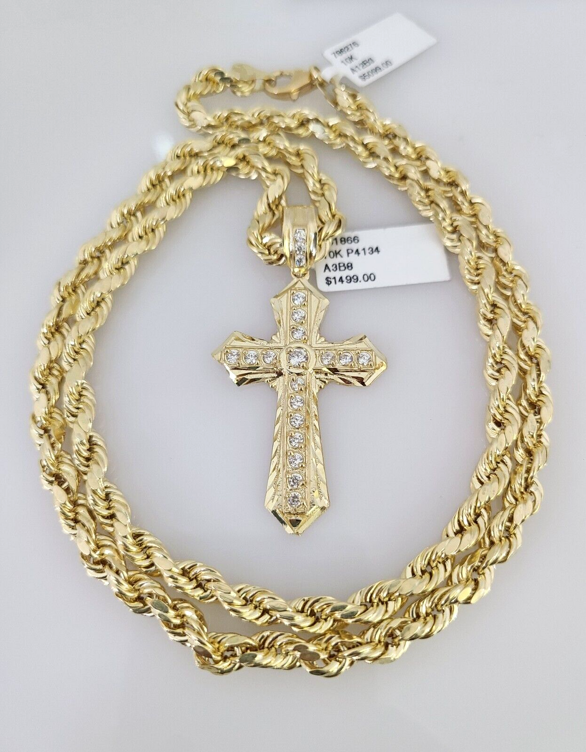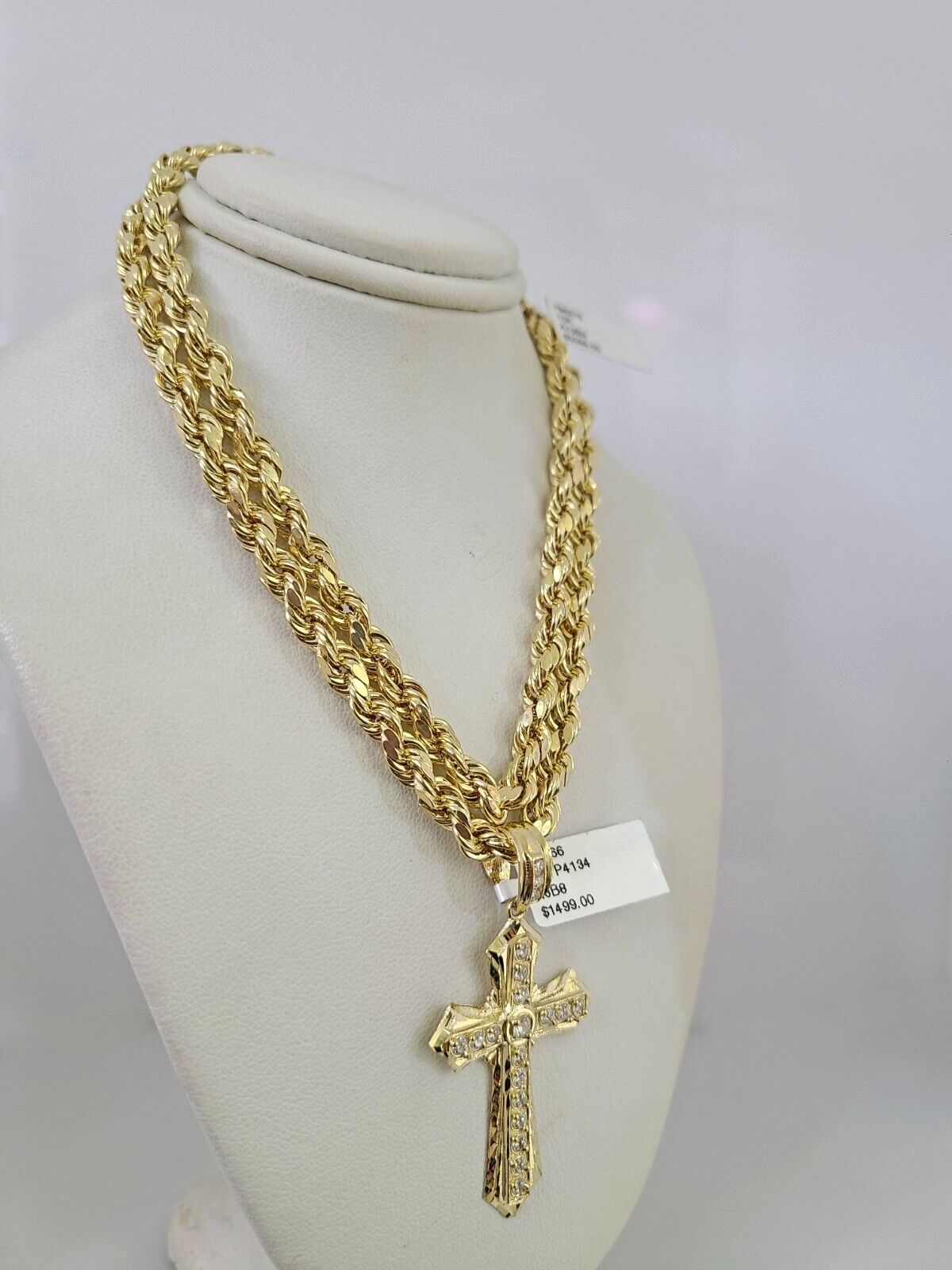 Genuine 10k Yellow Gold Rope Chain 18-30 Inch 6mm Necklace with Jesus Cross Charm design as a SET. The Various length of the Chain are 18-30 Inches. If you are not happy with the way it looks or feels, we do offer 30 - Days FREE Return shipping. Contact us for more information.