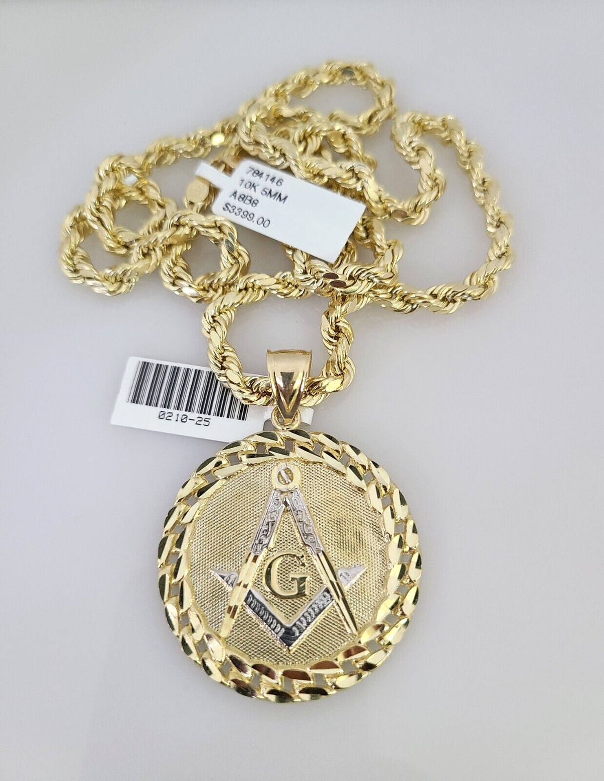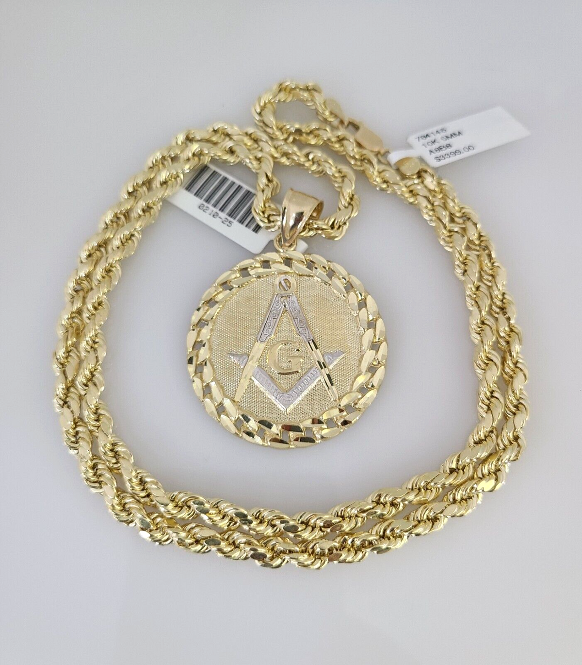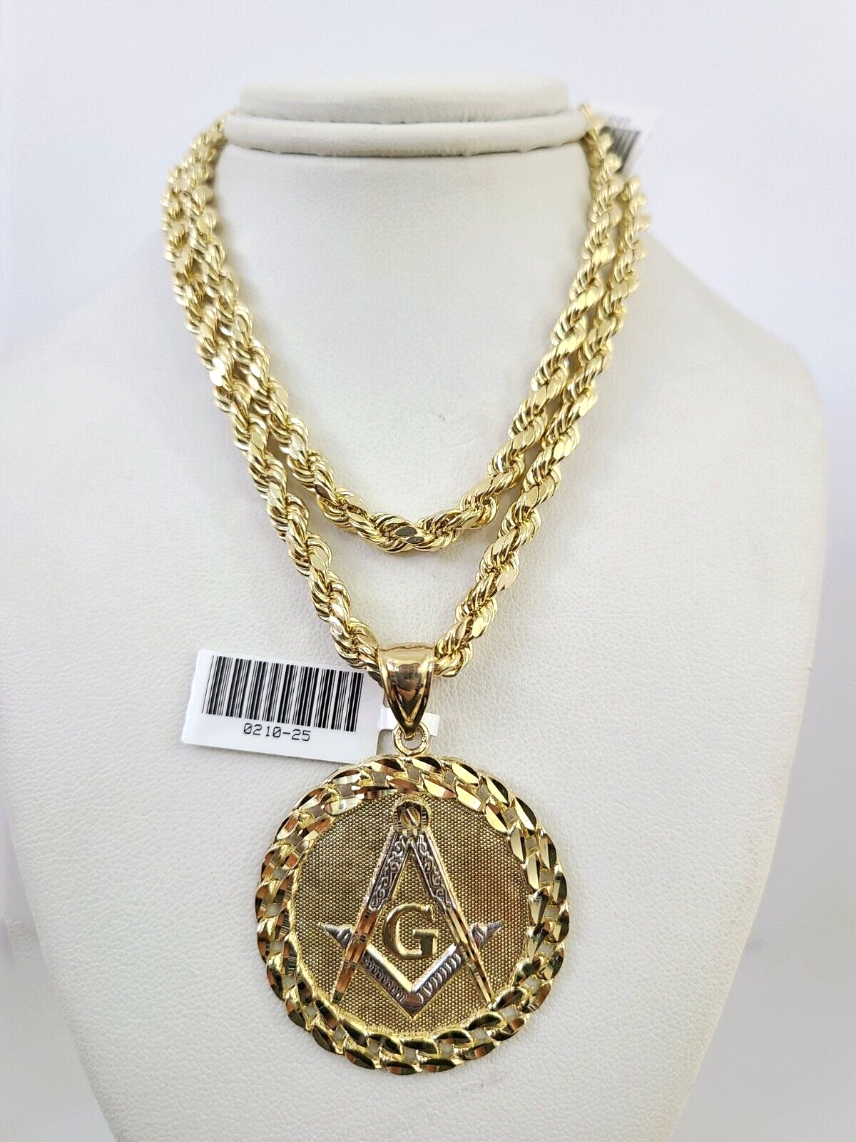 Genuine 10k Yellow Gold Rope Chain 18-30 Inch 5mm Necklace With Masonic Charm design as a SET. The Various length of the Chain are 18-30 Inches . If you are not happy with the way it looks or feels, we do offer 30 - Days FREE Return shipping. Contact us for more information.