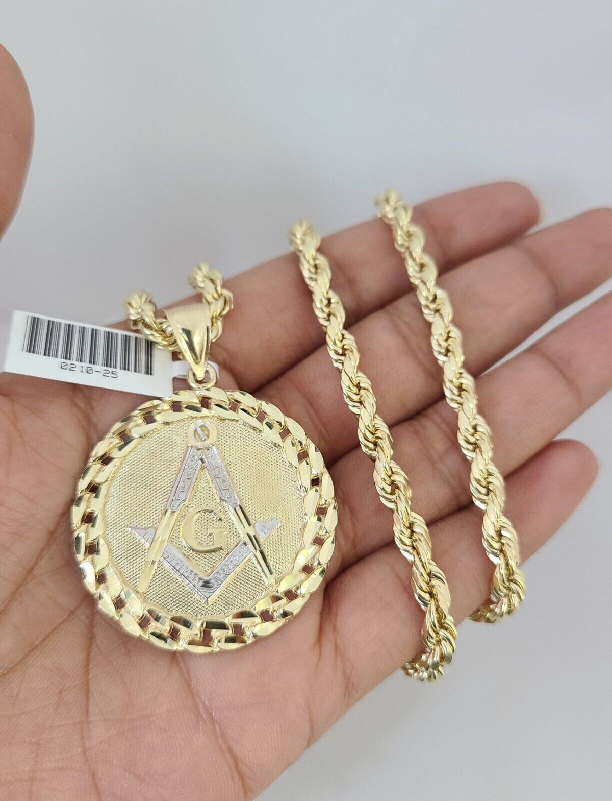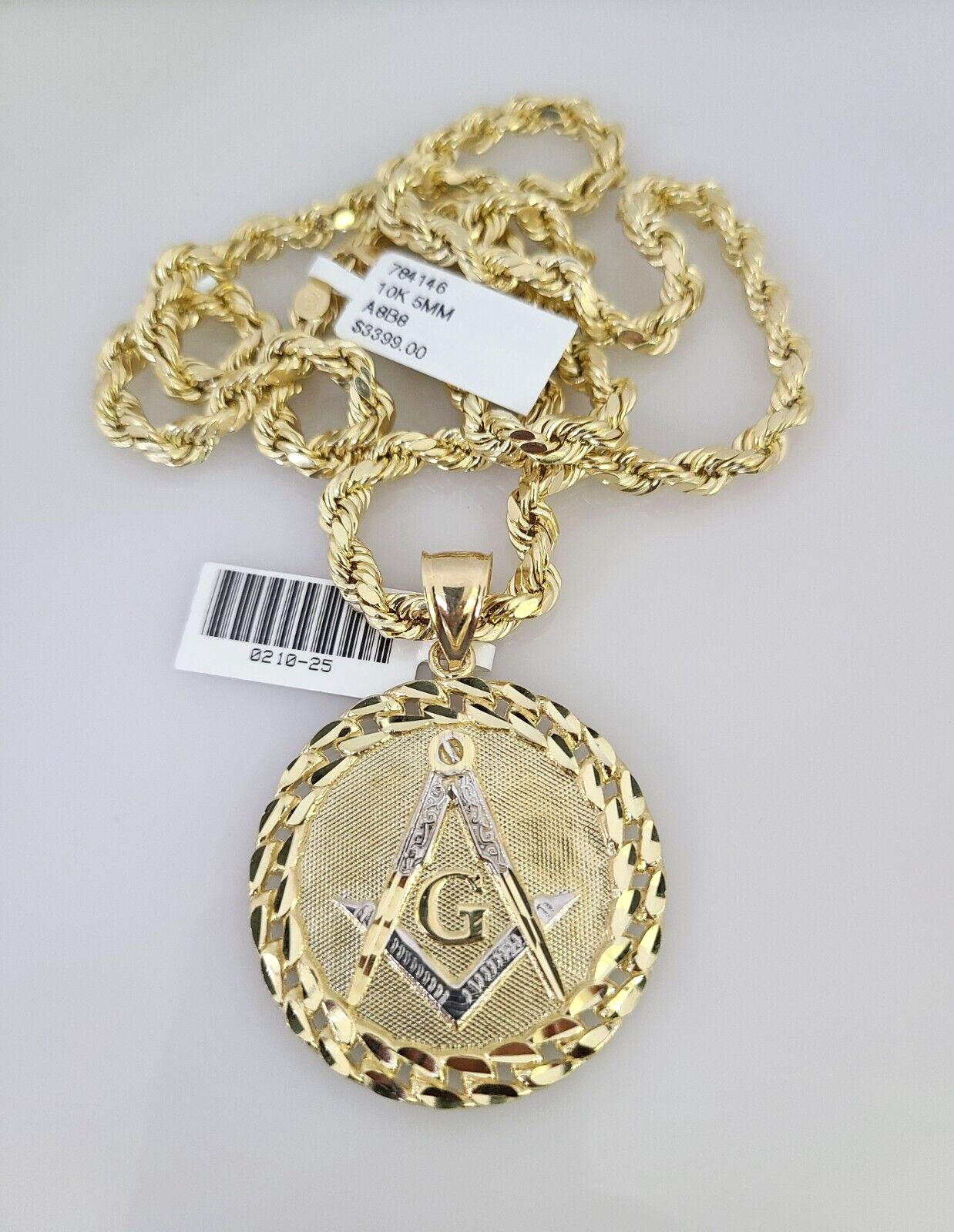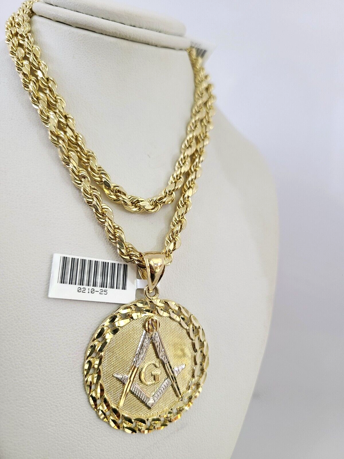 Genuine 10k Yellow Gold Rope Chain 18-30 Inch 5mm Necklace With Masonic Charm design as a SET. The Various length of the Chain are 18-30 Inches . If you are not happy with the way it looks or feels, we do offer 30 - Days FREE Return shipping. Contact us for more information.
