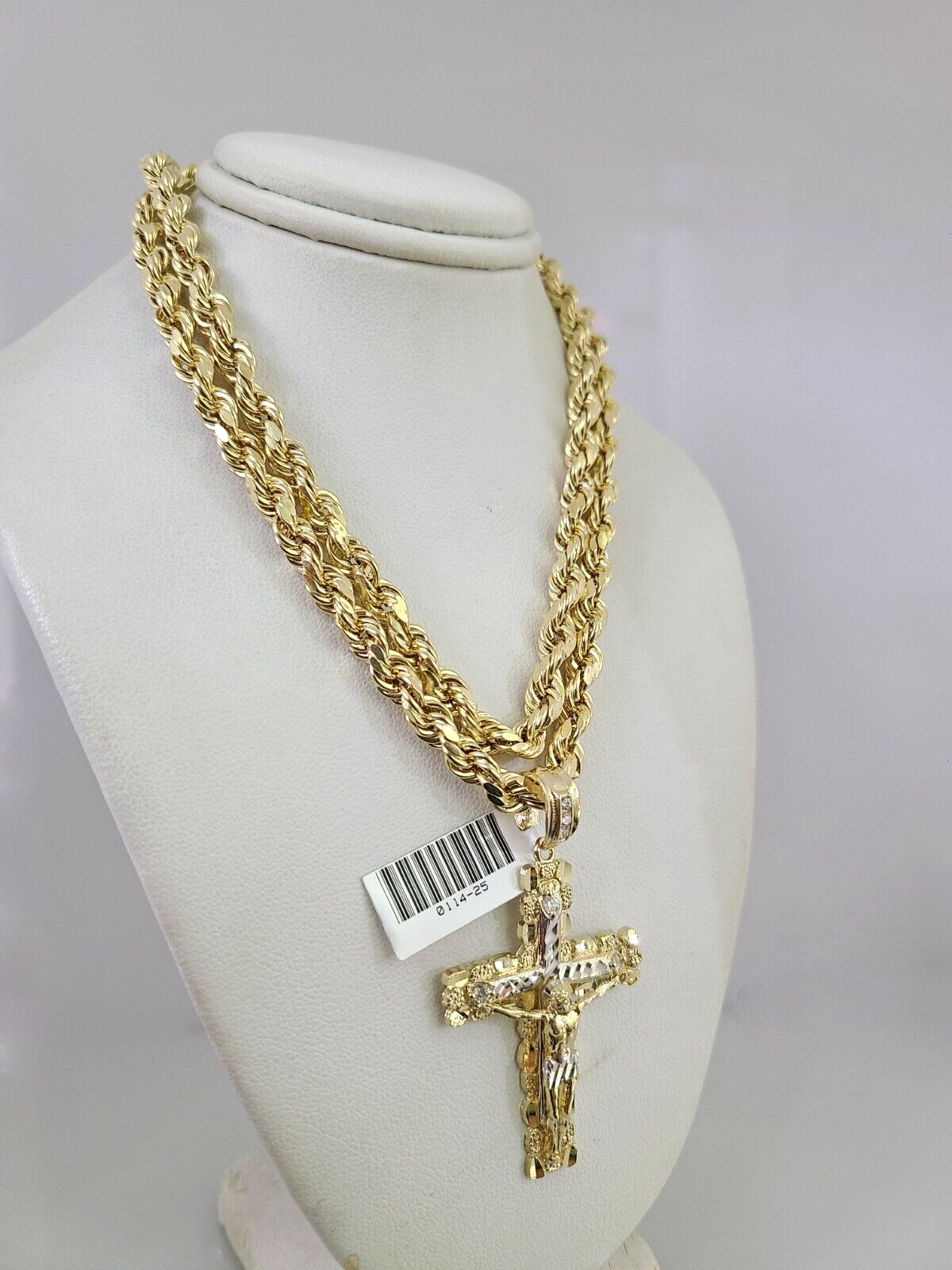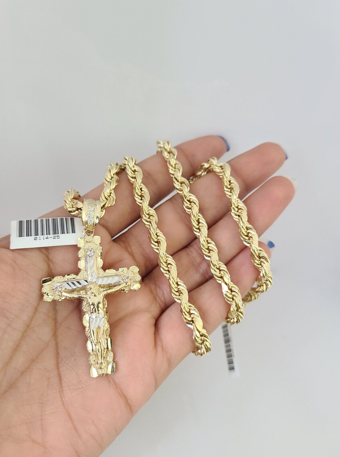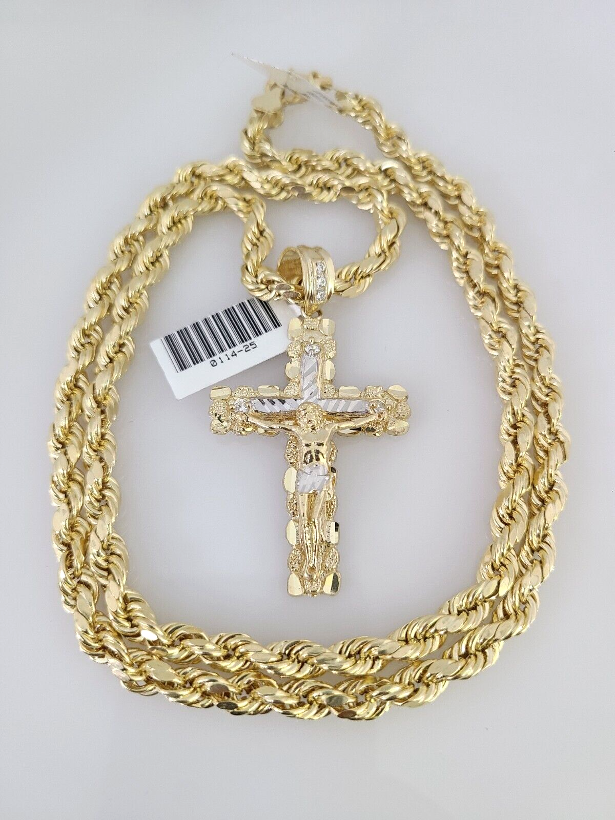 Genuine 10k Yellow Gold Rope Chain 18-30 Inch 6mm Necklace with Nugget Jesus Cross Charm design as a SET. The Various length of the Chain are 18-30 Inches. If you are not happy with the way it looks or feels, we do offer 30 - Days FREE Return shipping. Contact us for more information.