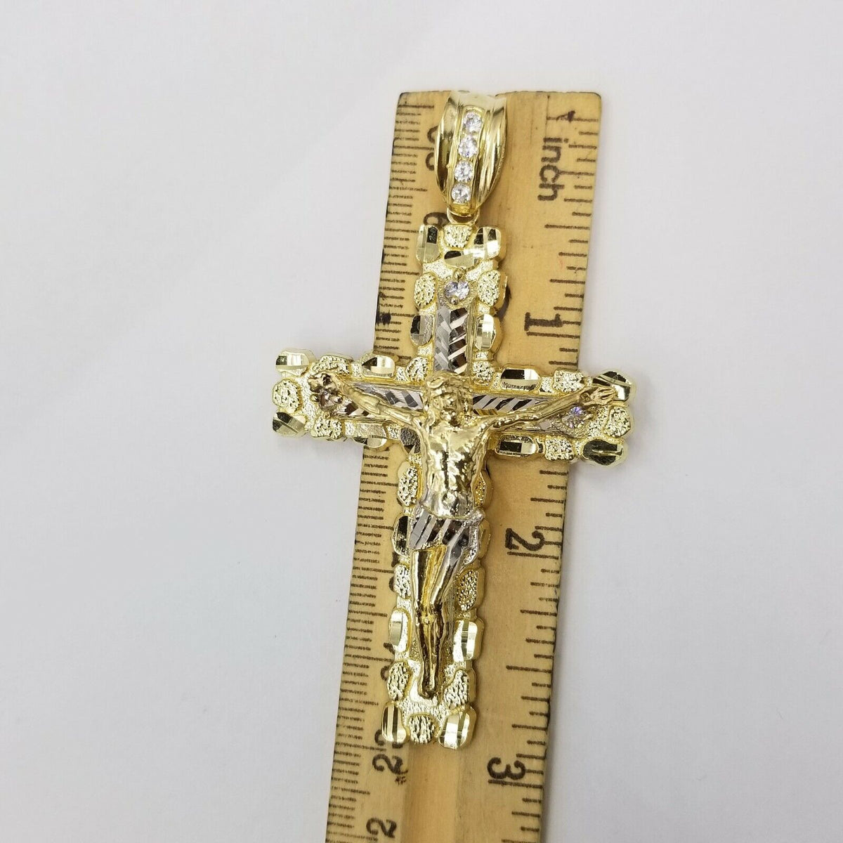 Is Presenting You with This Absolutely Stunning Real 10k Yellow Gold Box Byzantine Chino Chain 4mm, 24 Inches, Lobster Lock with 3" Nugget Style JESUS CRUCIFIX CROSS Pendant(has simulated diamonds). These Beautiful chains and Pendant will not tarnish, discolor, or fade because they are Pure 10K Gold. We also have them in various another length and sizes.