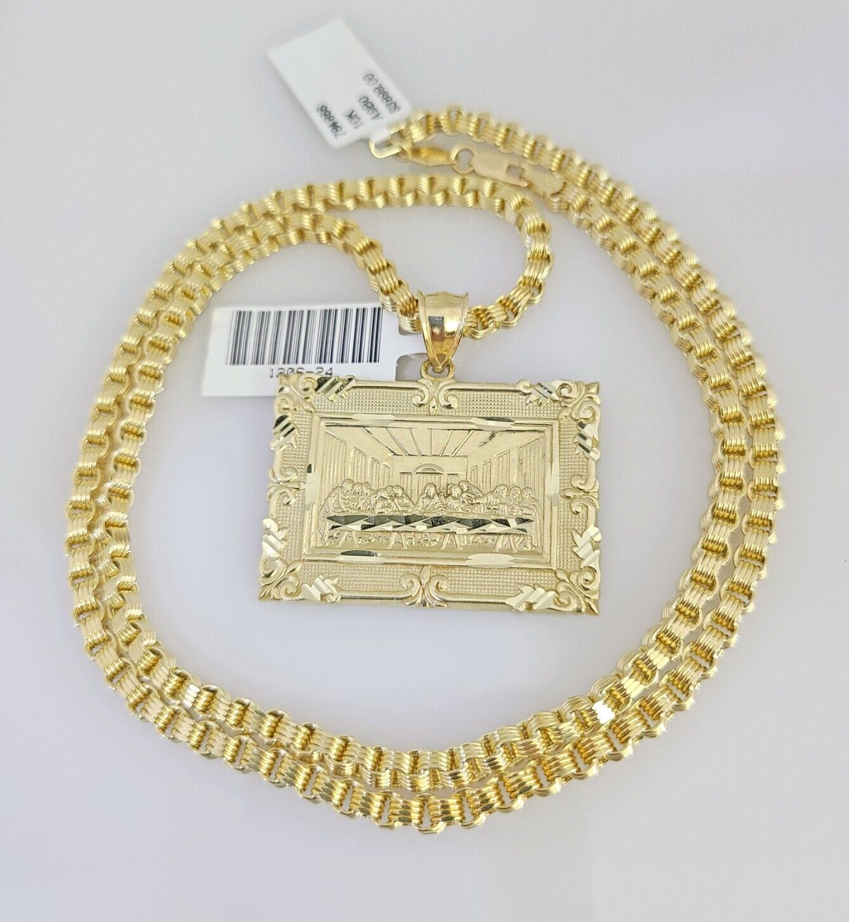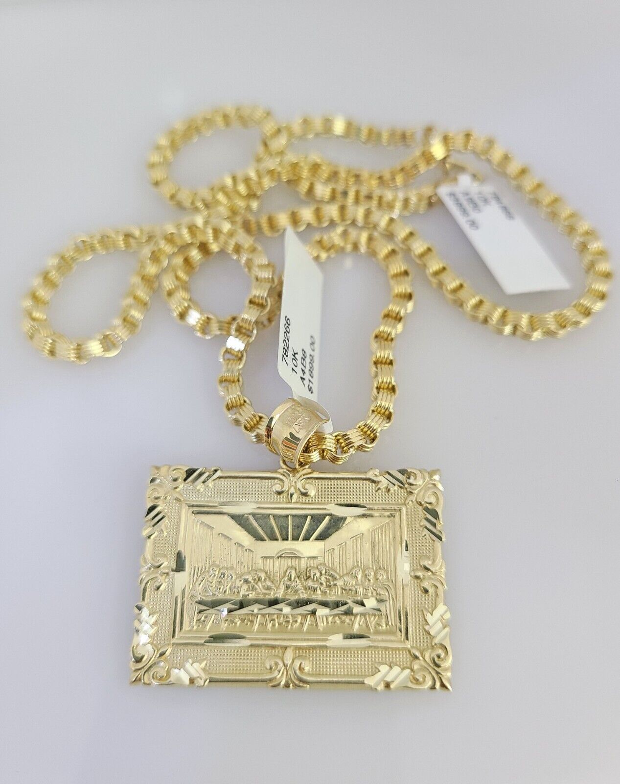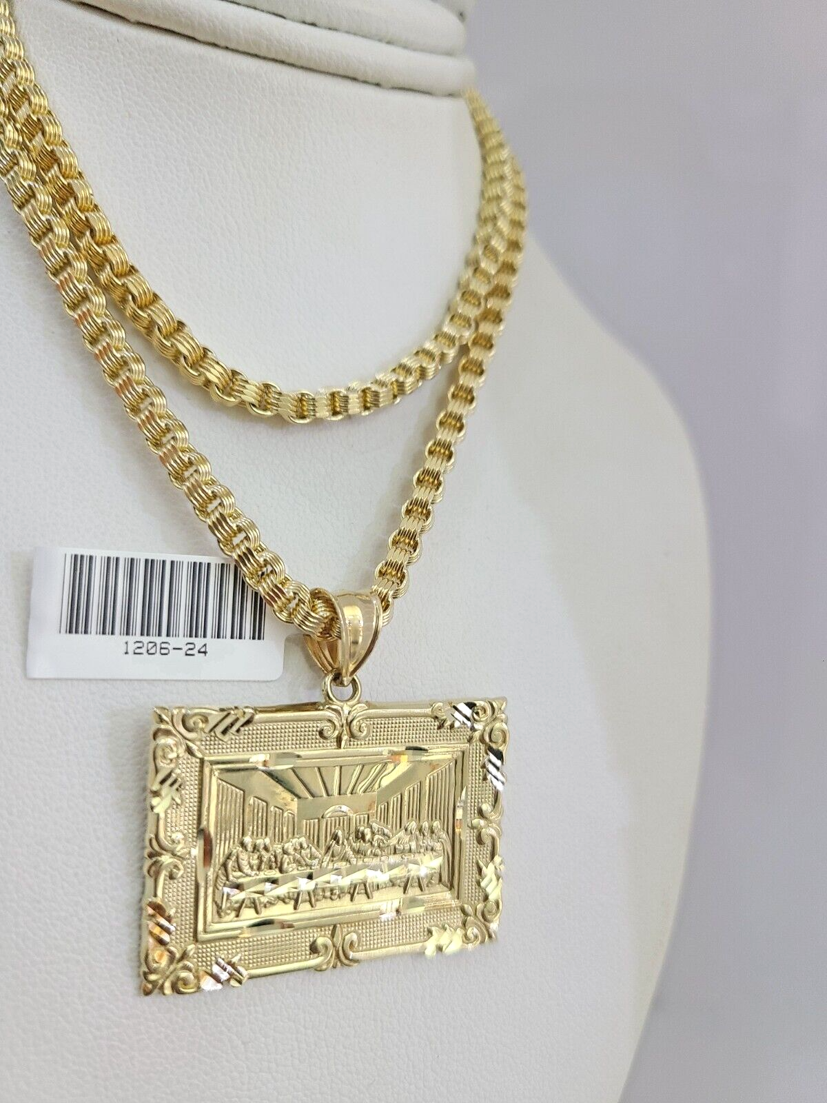 Real 10k Gold Byzantine Necklace Last Supper Charm SET Chain 20-30" 3mm Pendant