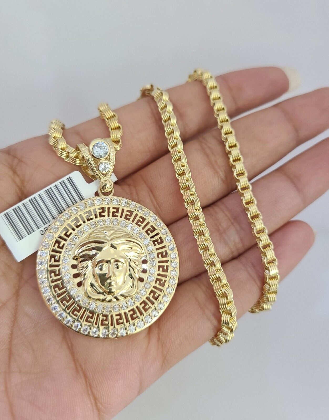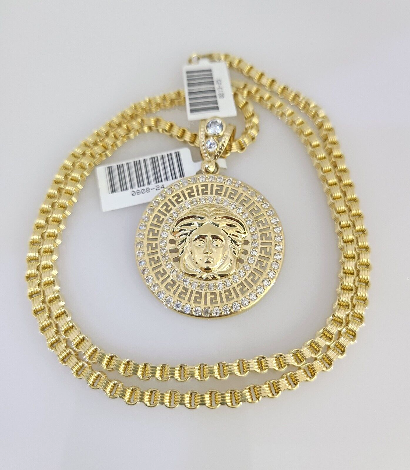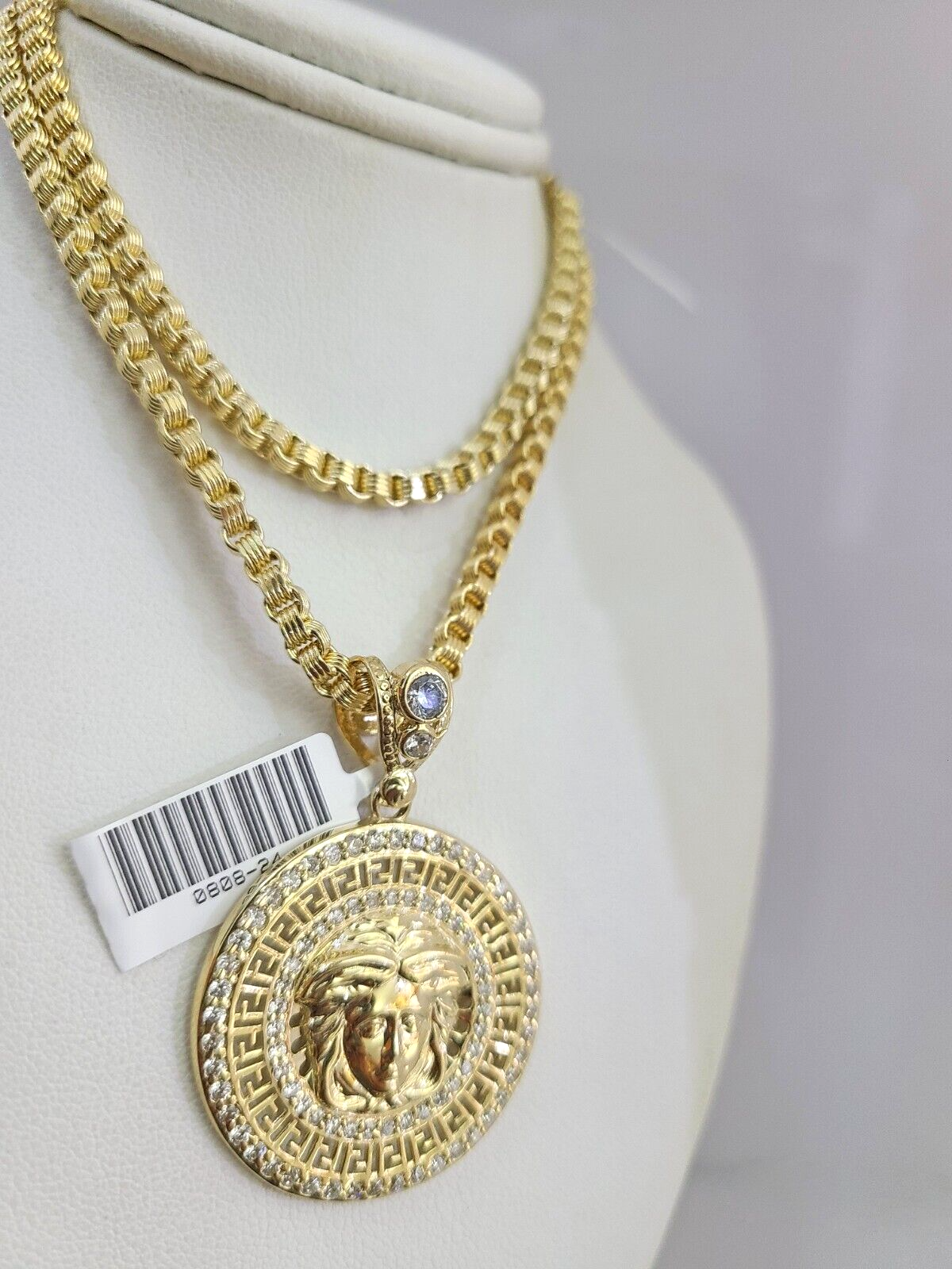 Real 10k Gold Byzantine Necklace Medusa Head Charm SET Chain 20-30" 3mm Pendant - 22 inch with charm