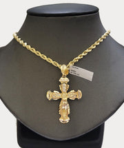 Genuine 10 k Yellow Gold Rope Necklace 5mm Chain Diamond cuts With Jesus Crucifix Cross. The Various length of the Chain are 18"-28" with Jesus Crucifix Cross 2 inch(approx.). The pendants are unique in design and considered durable too. If you are not happy with the way it looks or feels, we do offer 30 - Days FREE Return shipping. Contact us for more information.