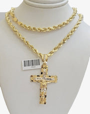 Real 10k Gold Chain Pendant set Rope Necklace Jesus Cross Charm 18" Choker 4mm
