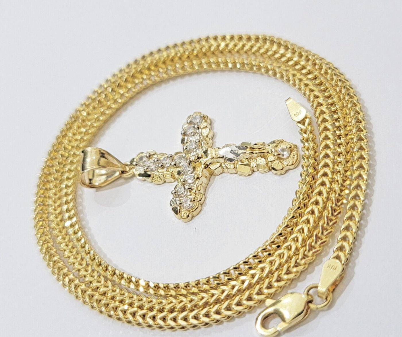 Real 10k Gold Cross Charm pendant & Franco Chain Necklace 2.5mm 18" Men Women