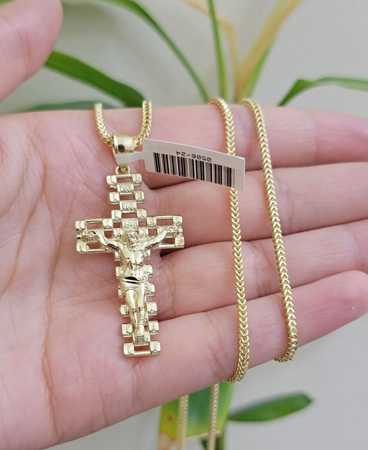 Real 10k Gold Franco Chain Cross Charm SET 18-24 Inch 2mm Necklace Jesus Pendant