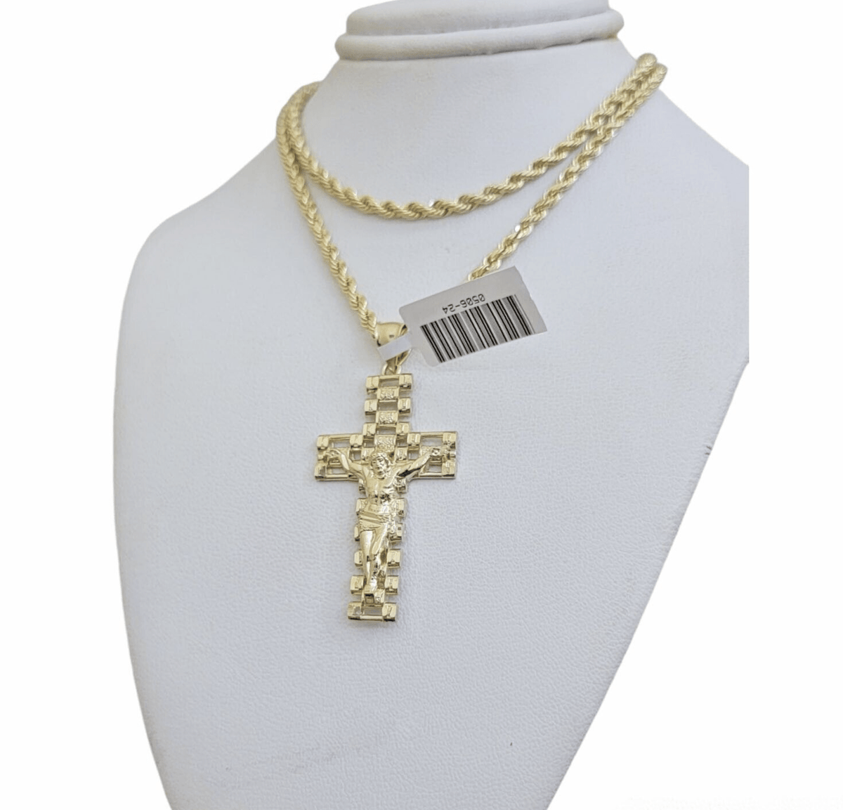 Real 10k Gold Rope Chain Cross Charm Pendant SET 3mm 20" Necklace Jesus Crucifix