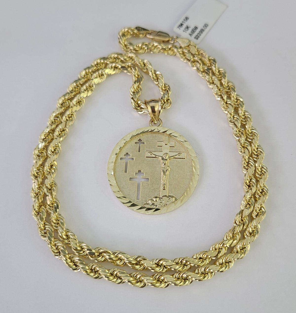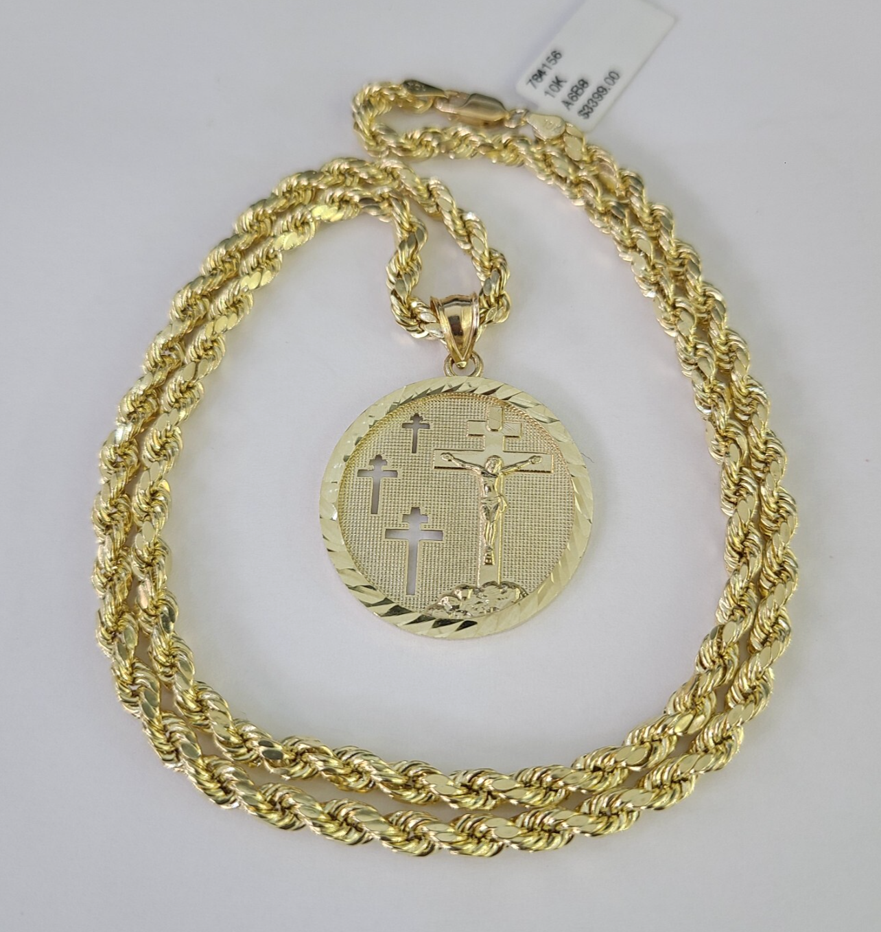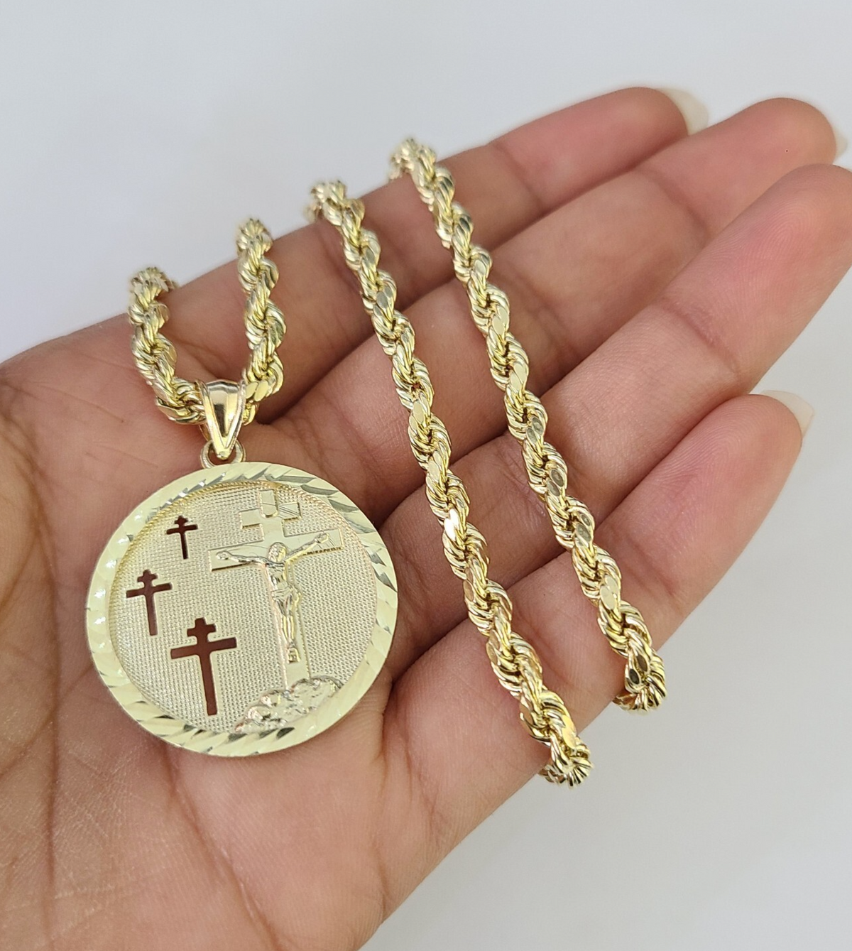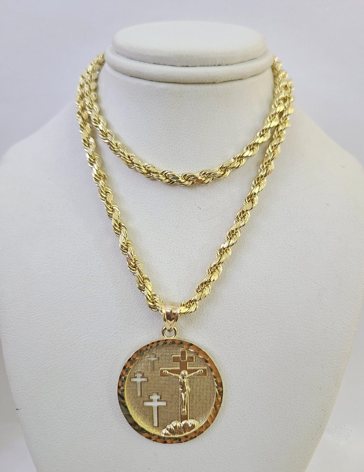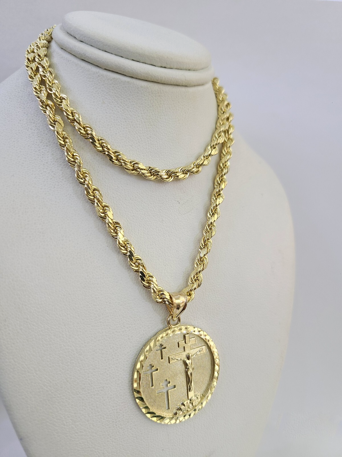 Genuine 10k Yellow Gold Rope Chain 4mm With Jesus Medallion Cross Diamond cuts design. The Various length of the Chain are 18"-28". The pendants are unique in design and considered durable too. If you are not happy with the way it looks or feels, we do offer 30 - Days FREE Return shipping. Contact us for more information.