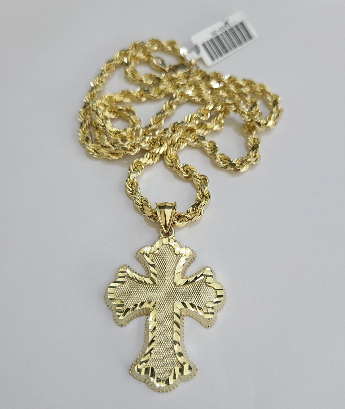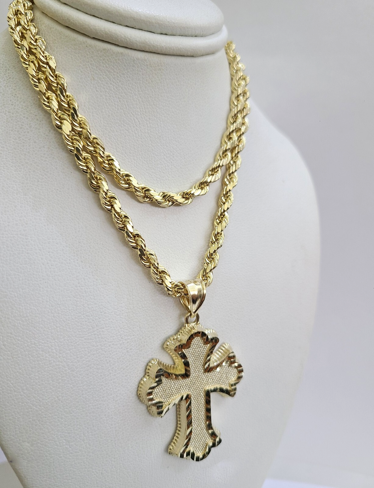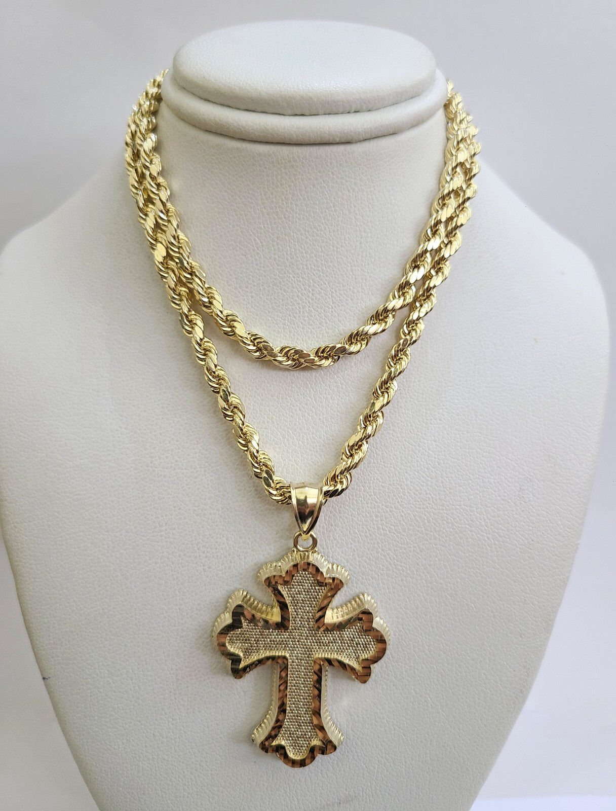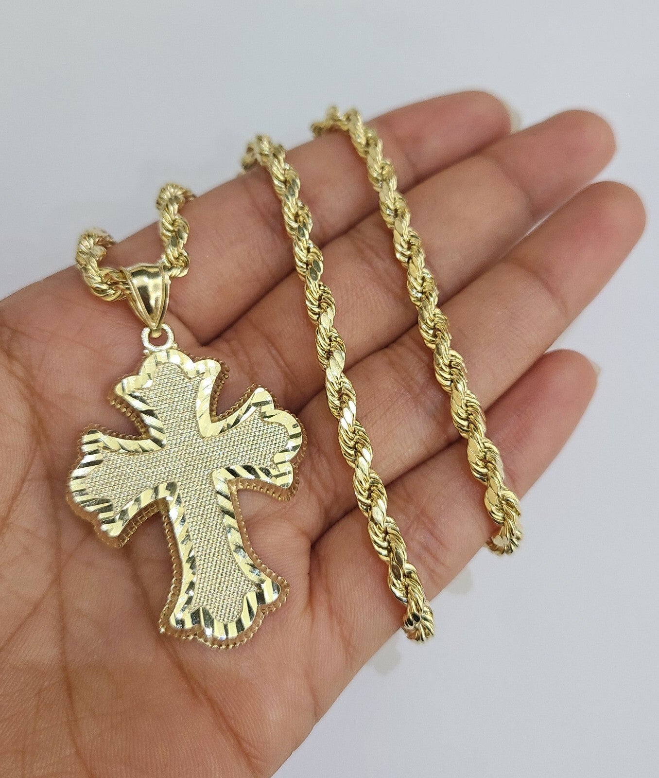 Genuine 10k Yellow Gold Rope Chain 4mm With Jesus Cross Diamond cuts design. The Various length of the Chain are 18"-28". The pendants are unique in design and considered durable too. If you are not happy with the way it looks or feels, we do offer 30 - Days FREE Return shipping. Contact us for more information.