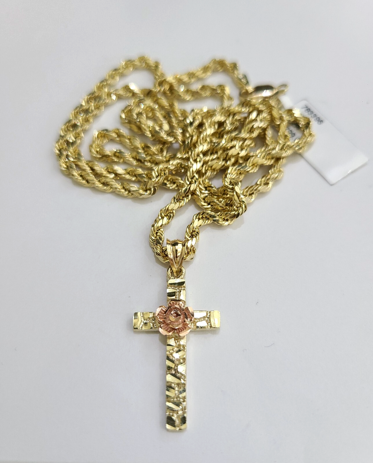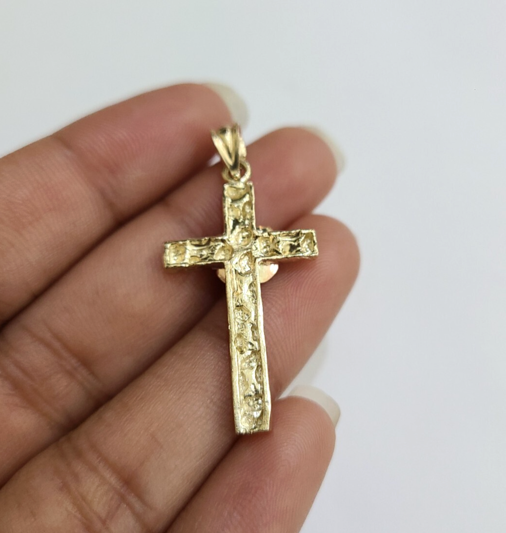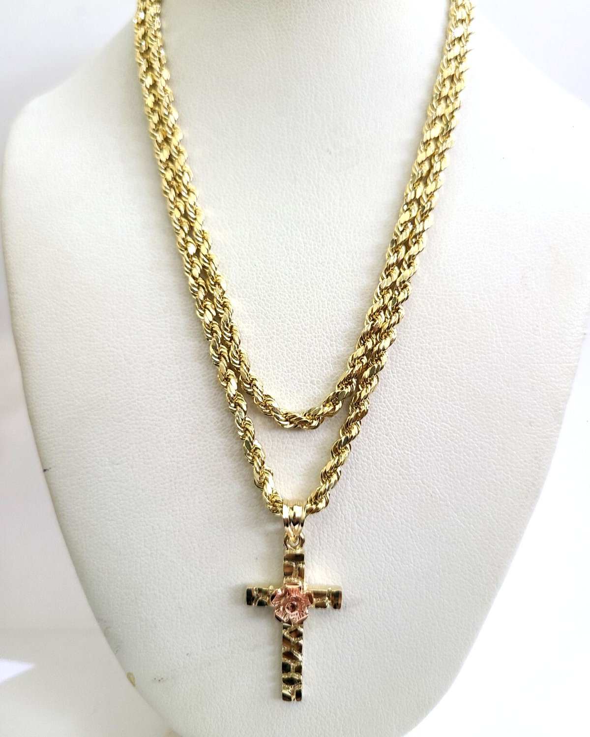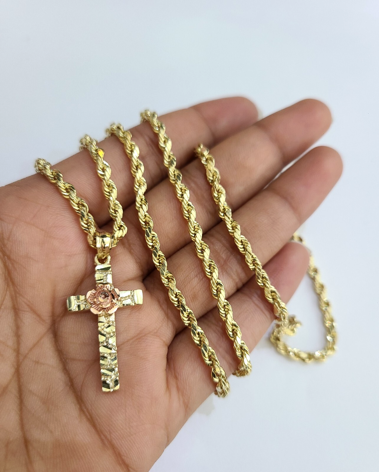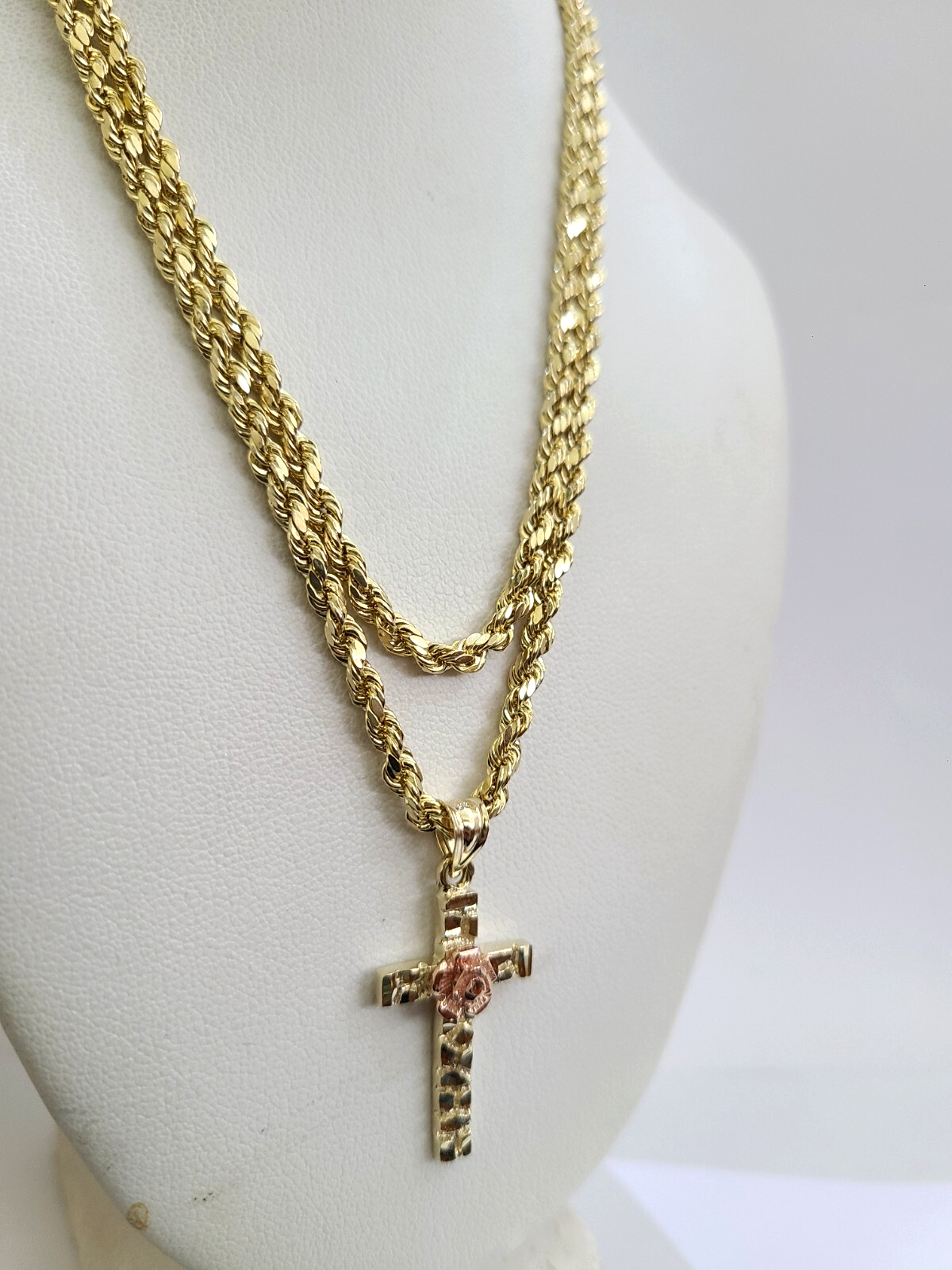 Genuine 10k Yellow Gold Rope Chain 3mm With Nugget Jesus Rose Cross Diamond cuts design. The Various length of the Chain are 18"-28". The pendants are unique in design and considered durable too. If you are not happy with the way it looks or feels, we do offer 30 - Days FREE Return shipping. Contact us for more information.