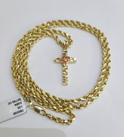REAL 10k Rope Chain Jesus Rose Cross Charm Pendant 3mm Necklace Set 18"-28"