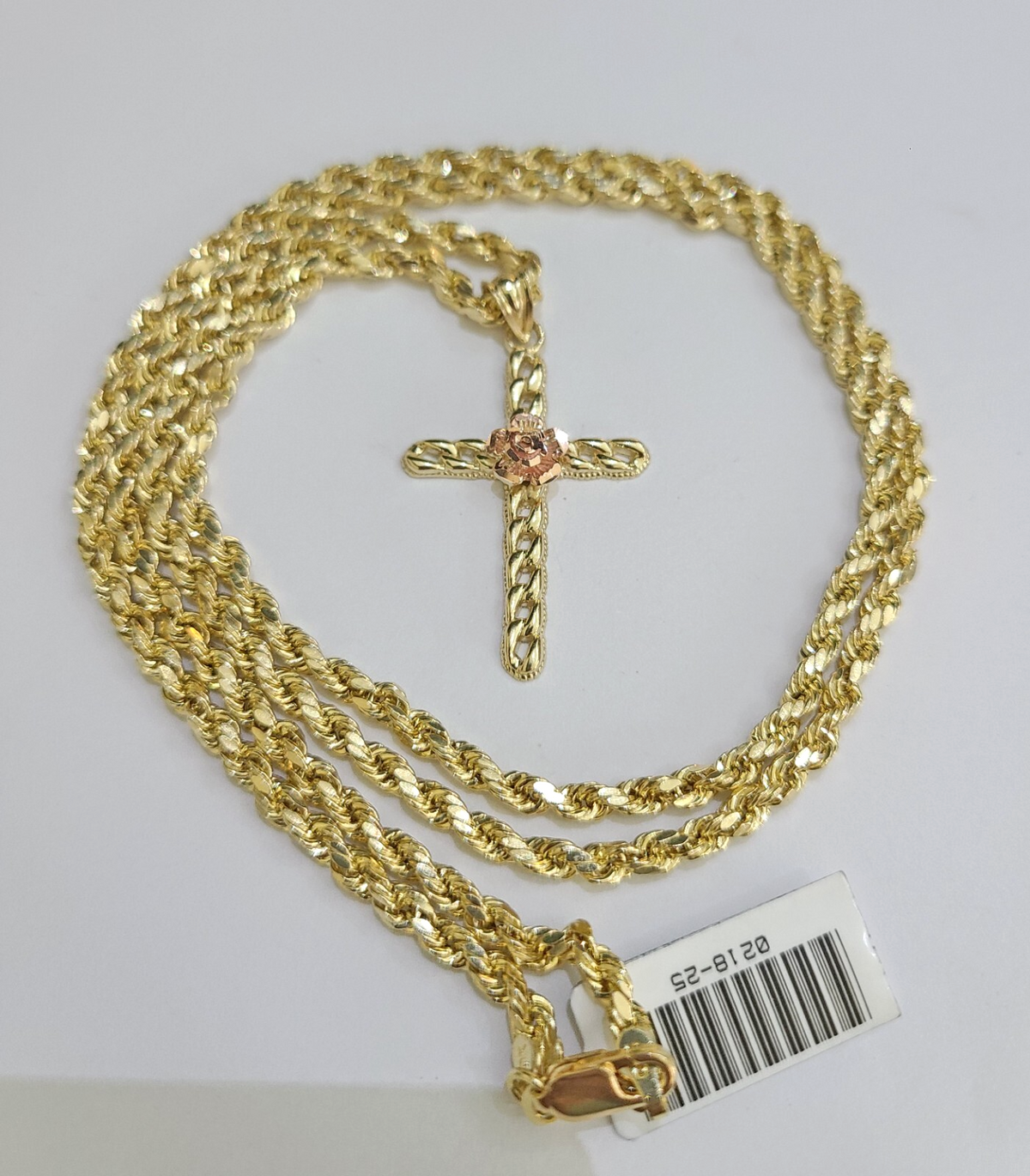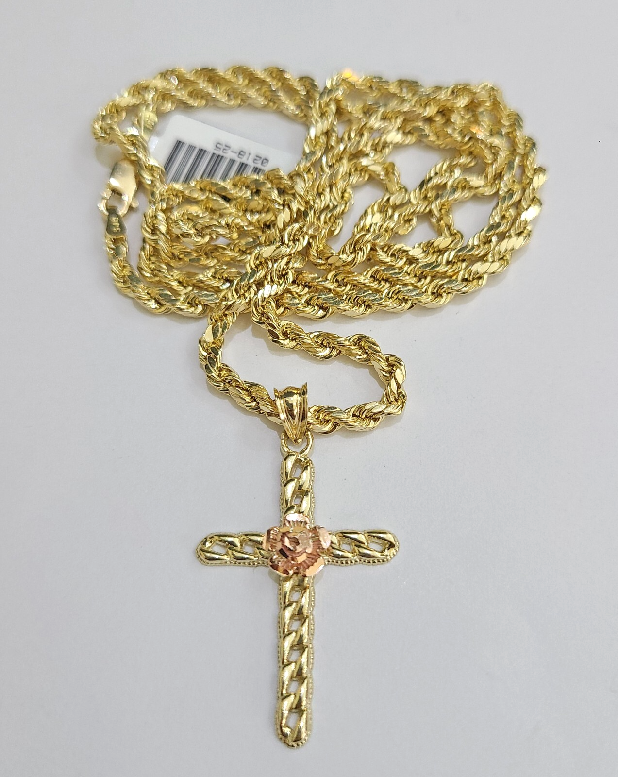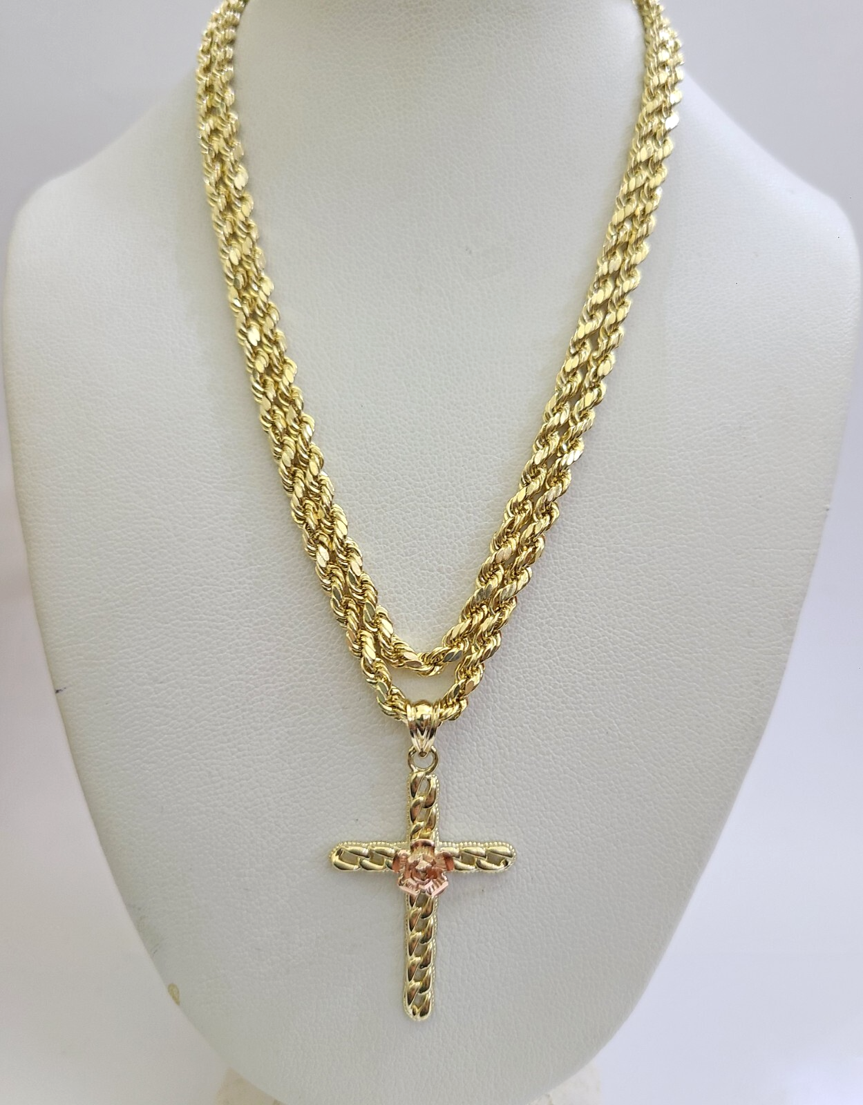 REAL 10k Rope Chain Jesus Rose Cross Charm Pendant 3mm Necklace Set 18"-28"