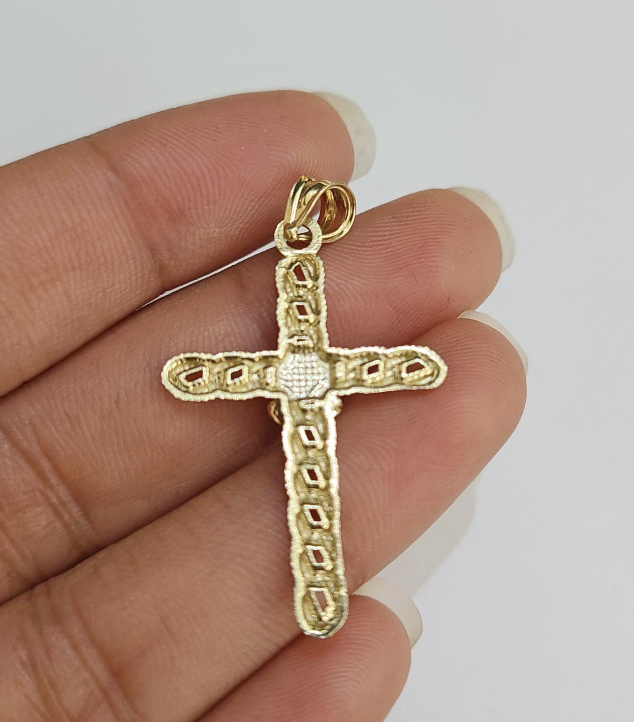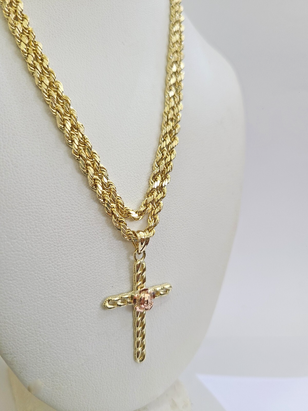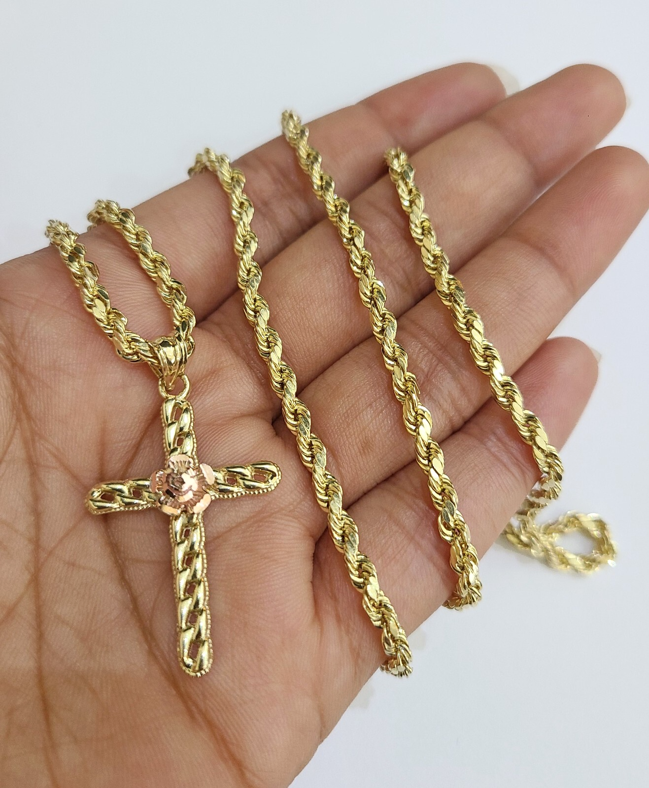 Genuine 10k Yellow Gold Rope Chain 3mm With Jesus Rose Cross Diamond cuts design. The Various length of the Chain are 18"-28". The pendants are unique in design and considered durable too. If you are not happy with the way it looks or feels, we do offer 30 - Days FREE Return shipping. Contact us for more information.
