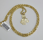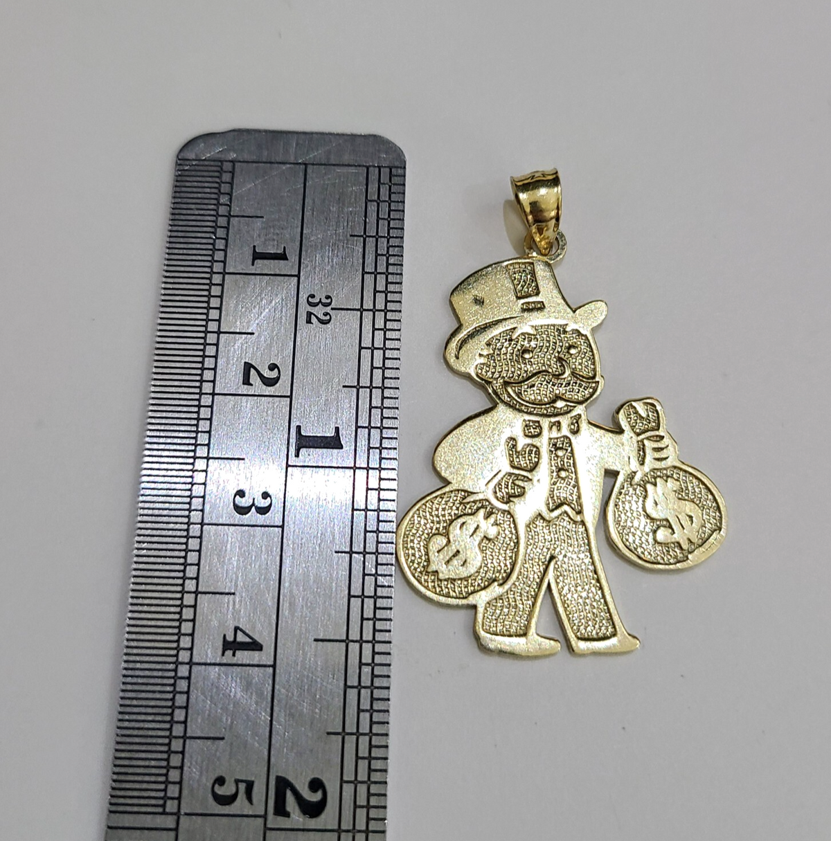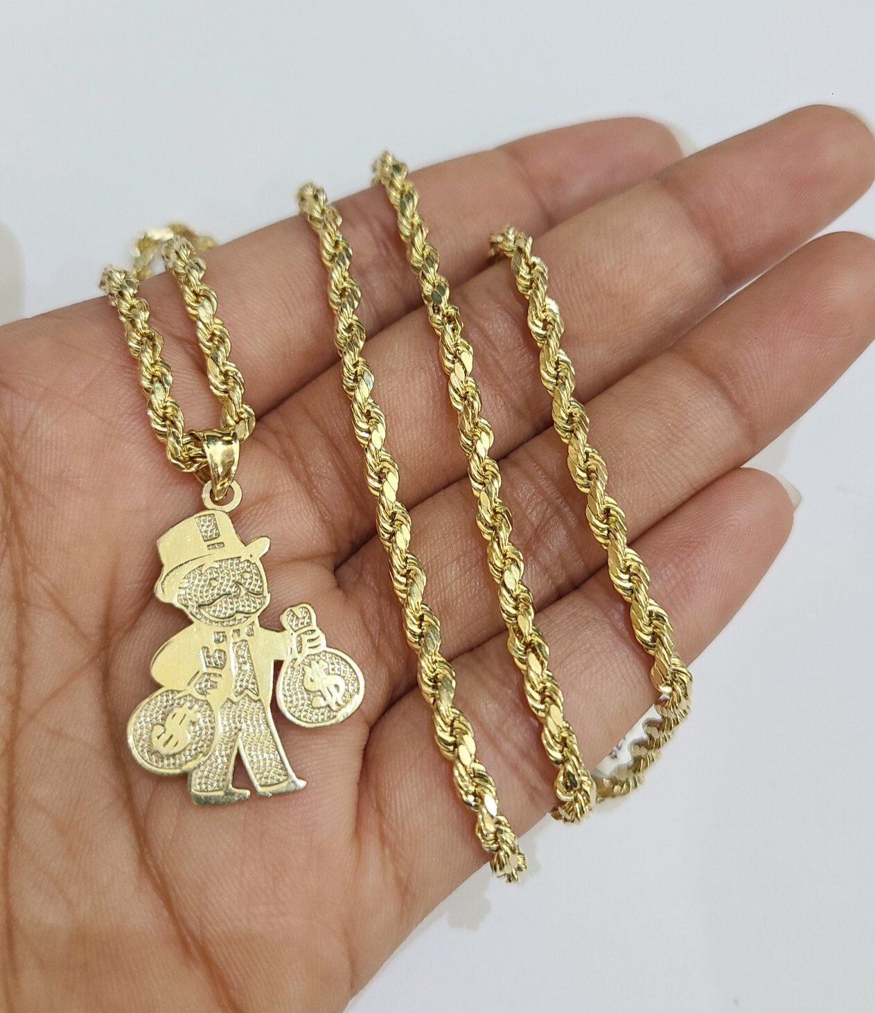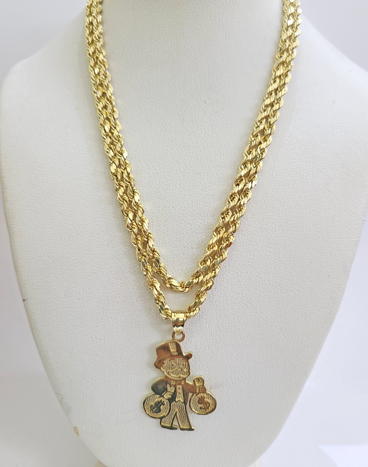 Genuine 10k Yellow Gold Rope Chain 3mm With Grandpa Money Bag Charm Diamond cuts design. The Various length of the Chain are 18"-28". The pendants are unique in design and considered durable too. If you are not happy with the way it looks or feels, we do offer 30 - Days FREE Return shipping. Contact us for more information.