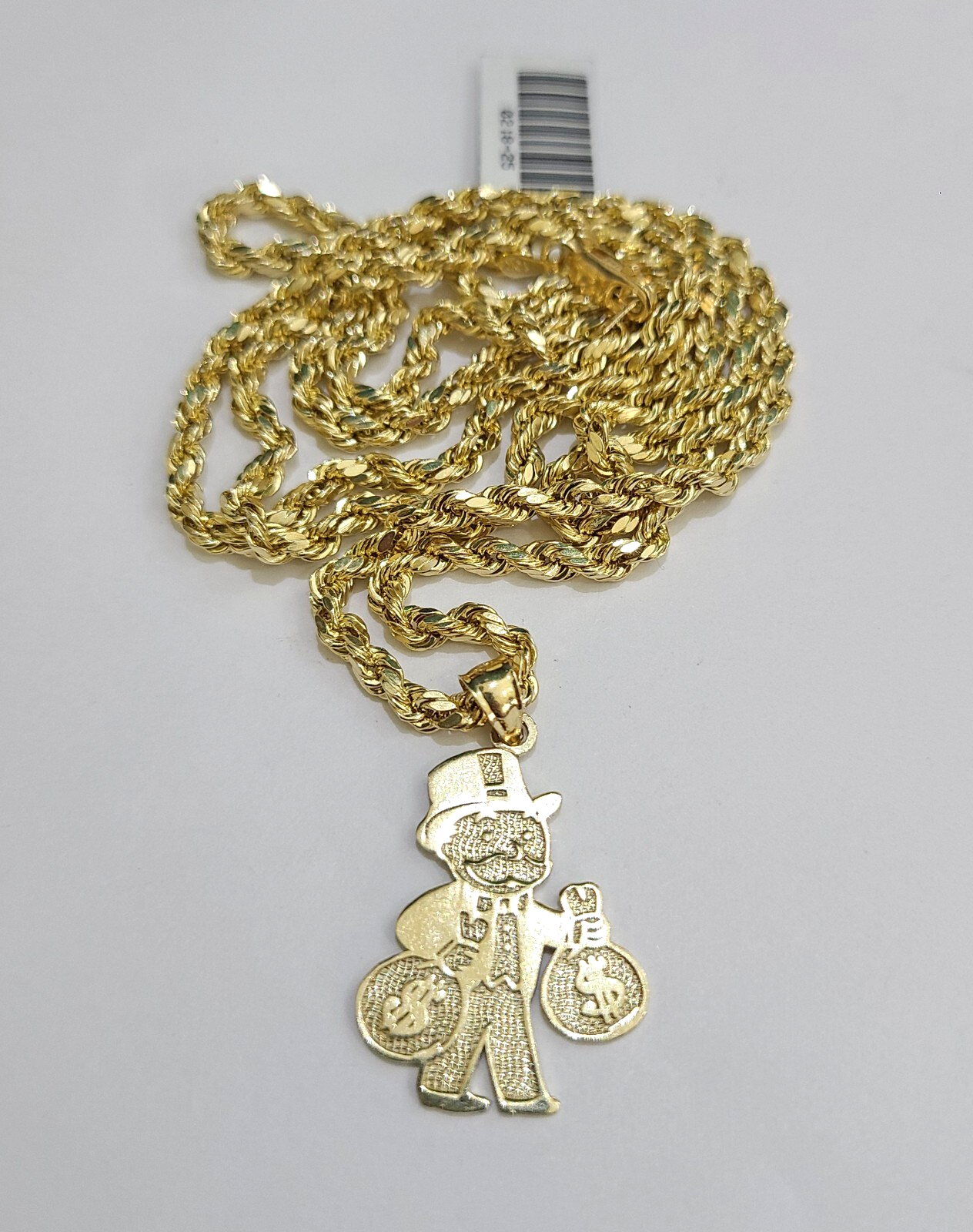 REAL 10k Rope Chain Grandpa Money Bag Charm Pendant 3mm Necklace Set 18"-28"