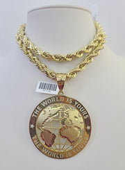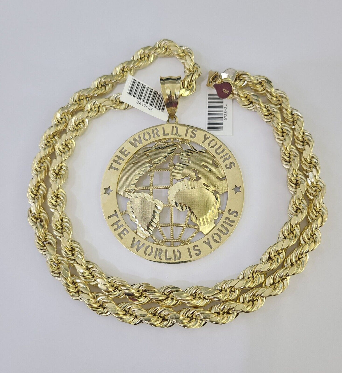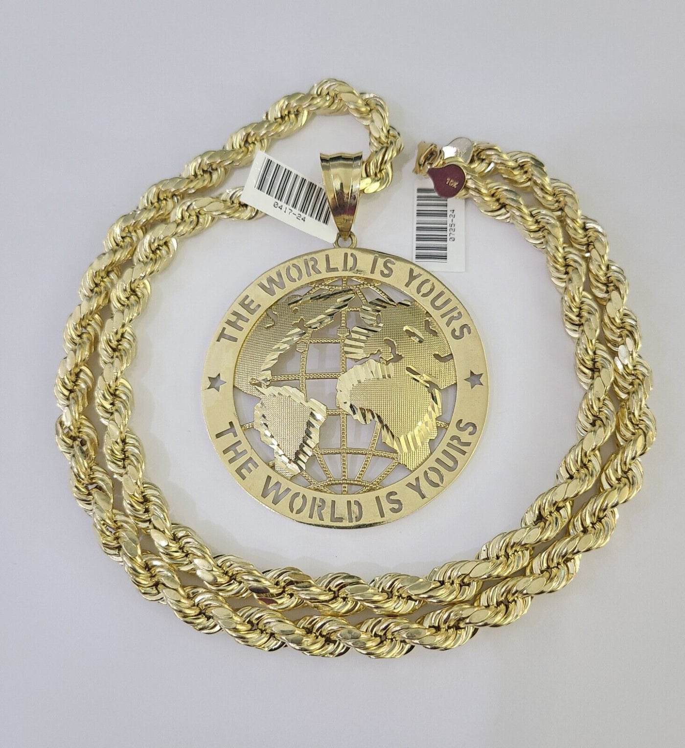 Is Presenting You with This Absolutely Stunning Real 10k Yellow Gold Rope Chain 8mm, 20 inch-30 inches, Lobster Lock with a 10k World is Yours Charm Pendant. These Beautiful chains and Pendant will not tarnish, discolor, or fade because they are Pure 10K Gold. We also have them in various another length and sizes. 26"-A27B8 A14B5