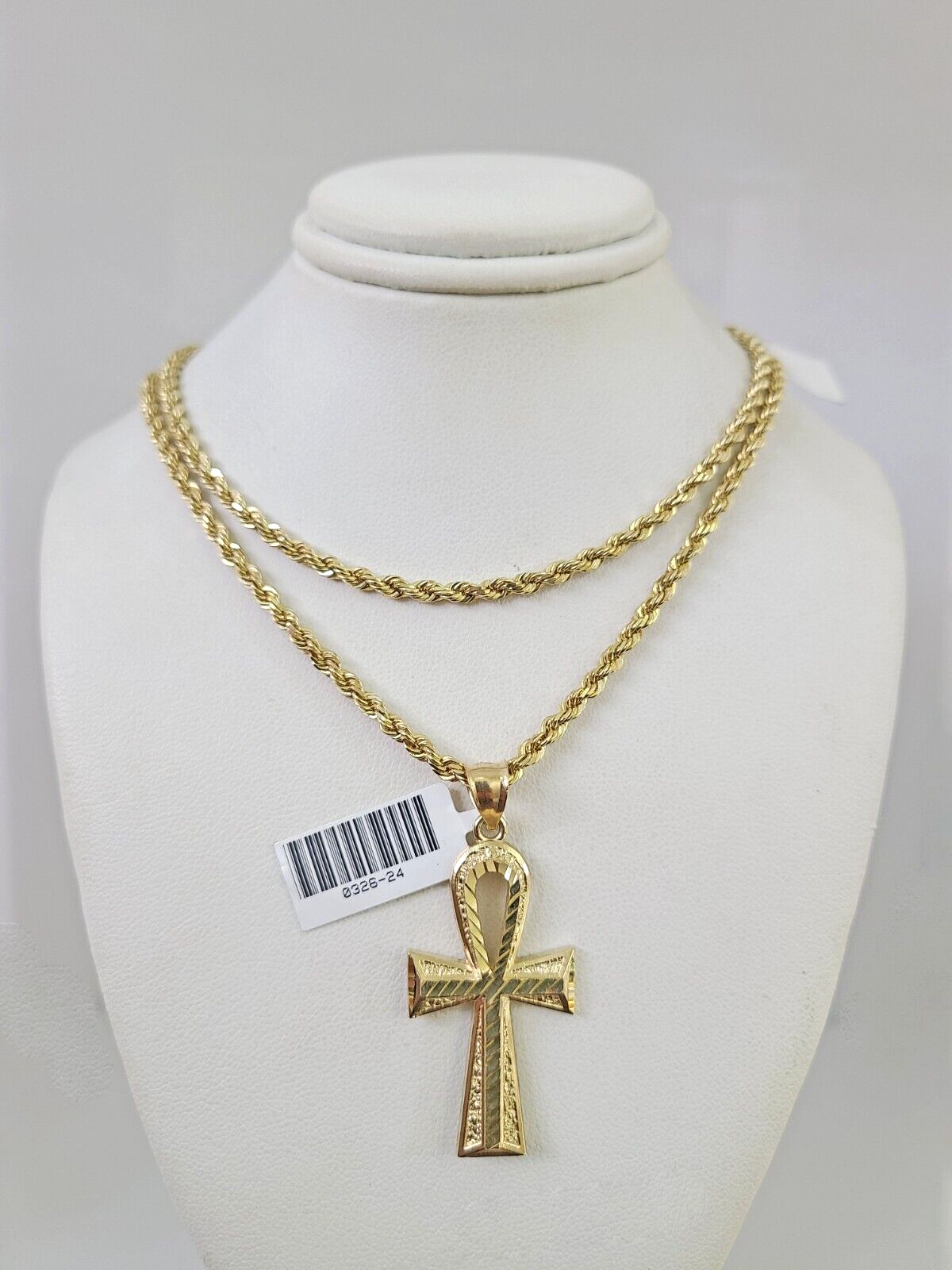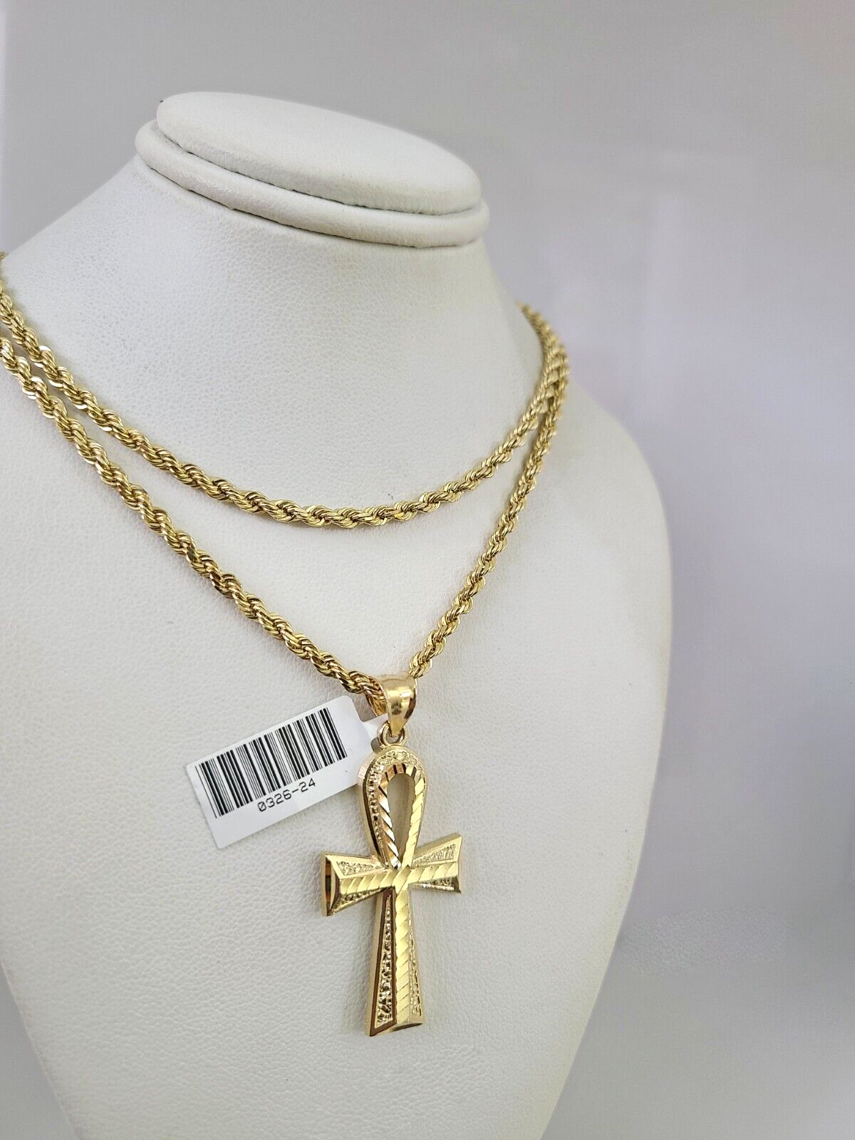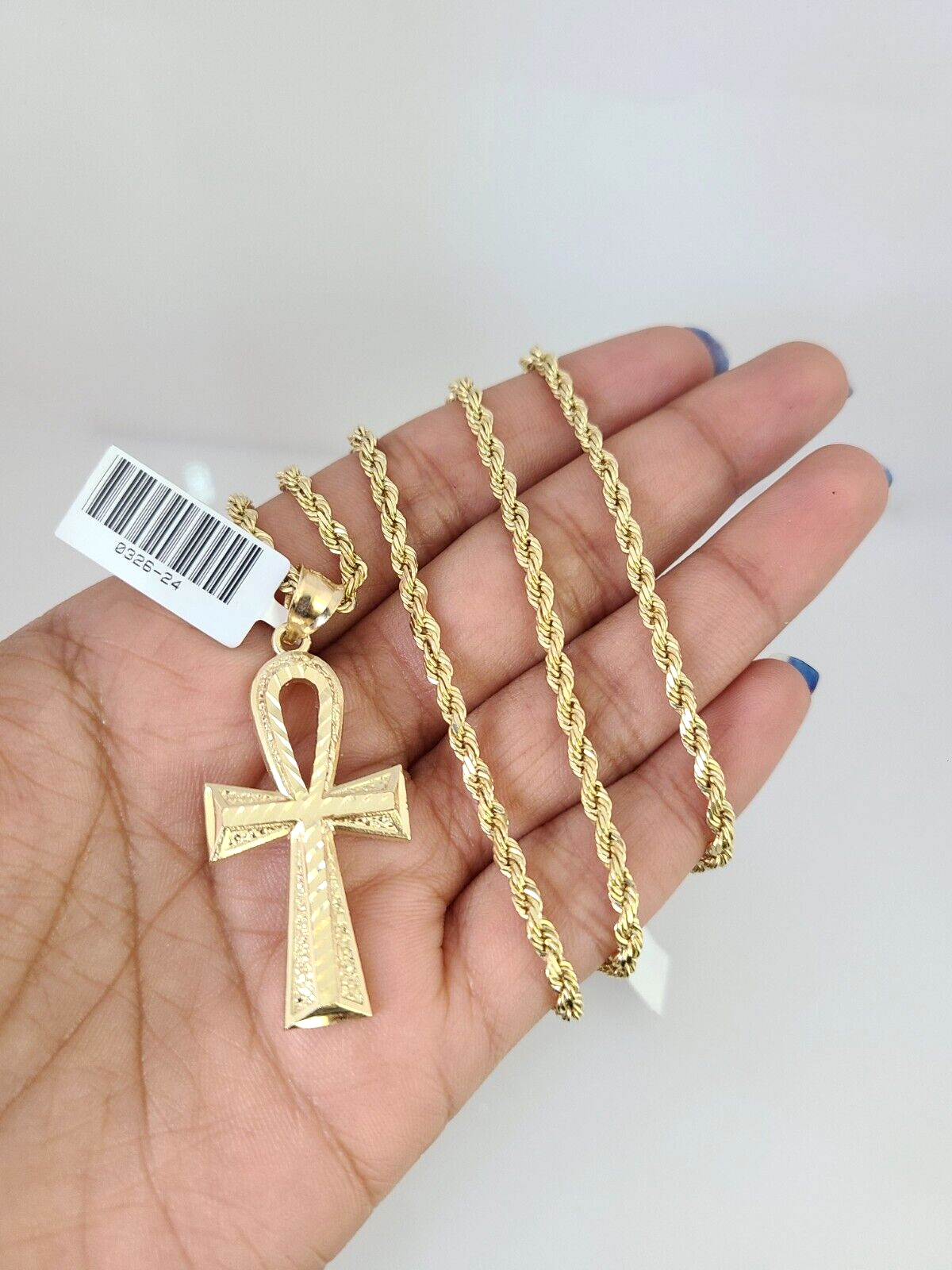 REAL 10k Solid Rope Chain Ankh Cross Charm Pendant 3mm Set 18"-26" in Necklace