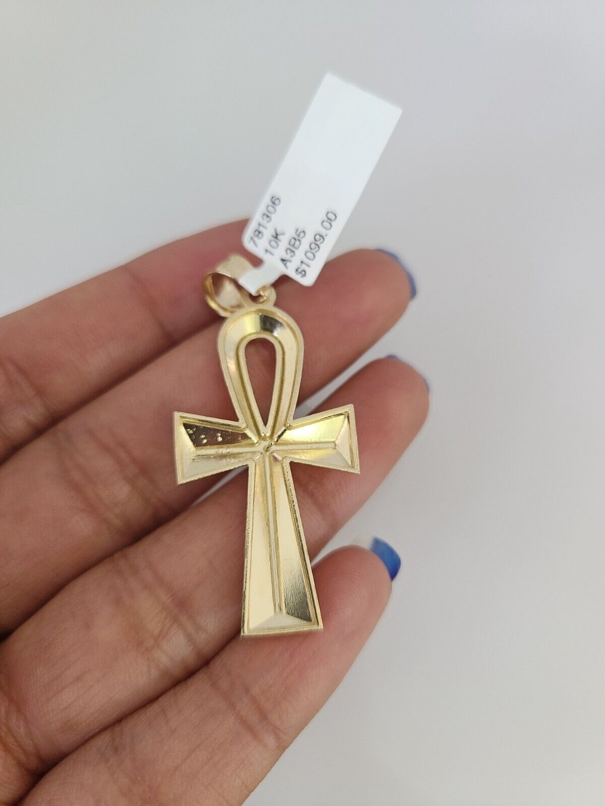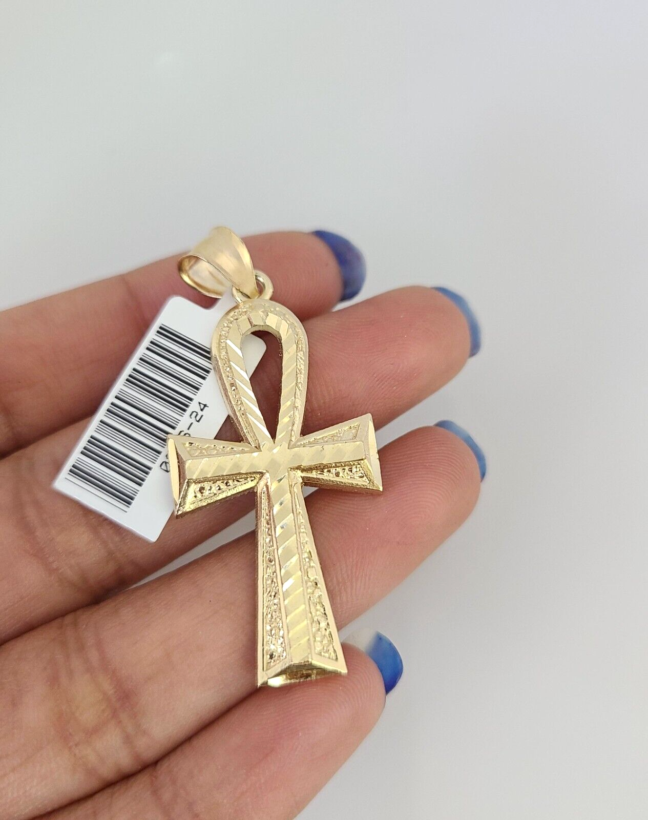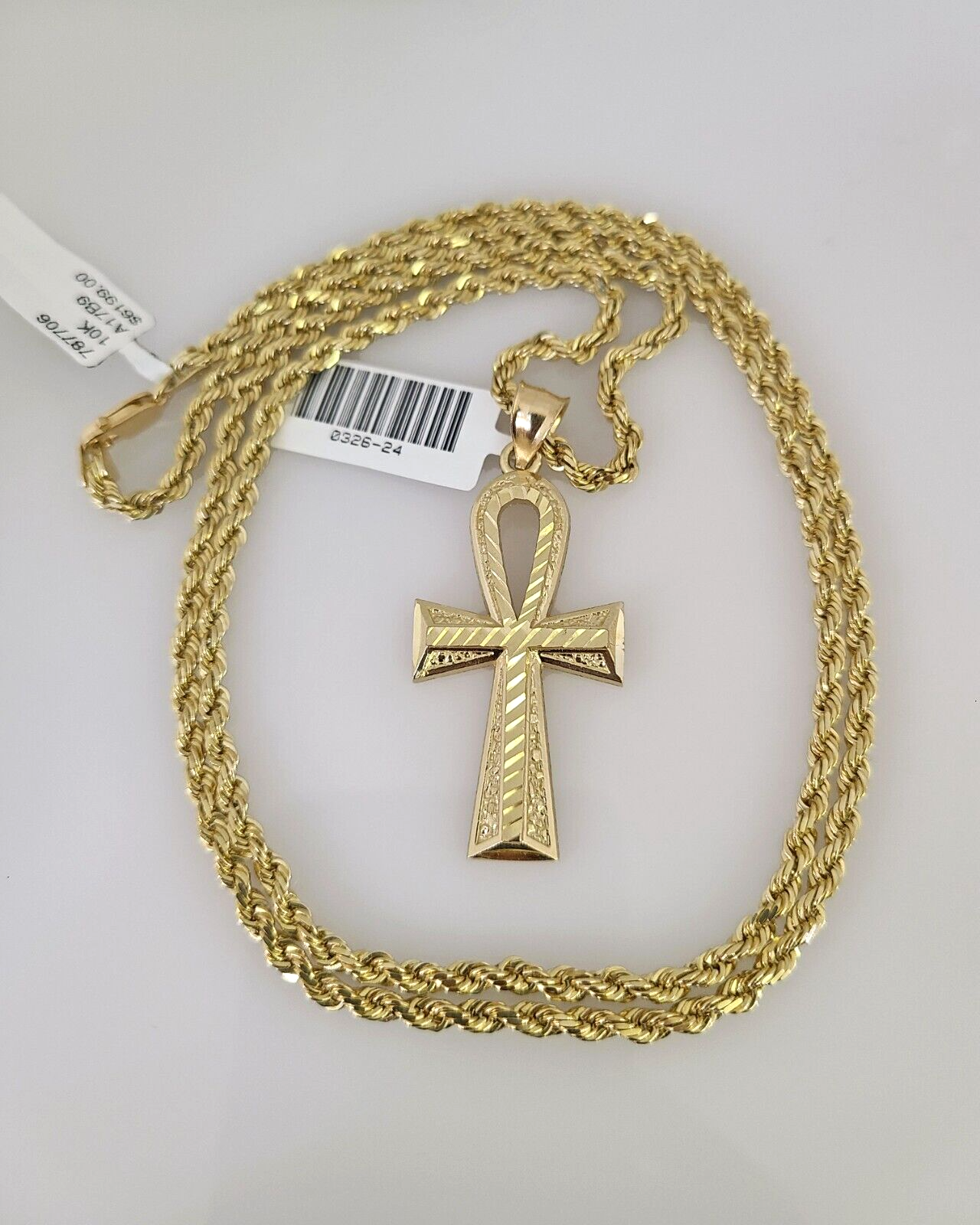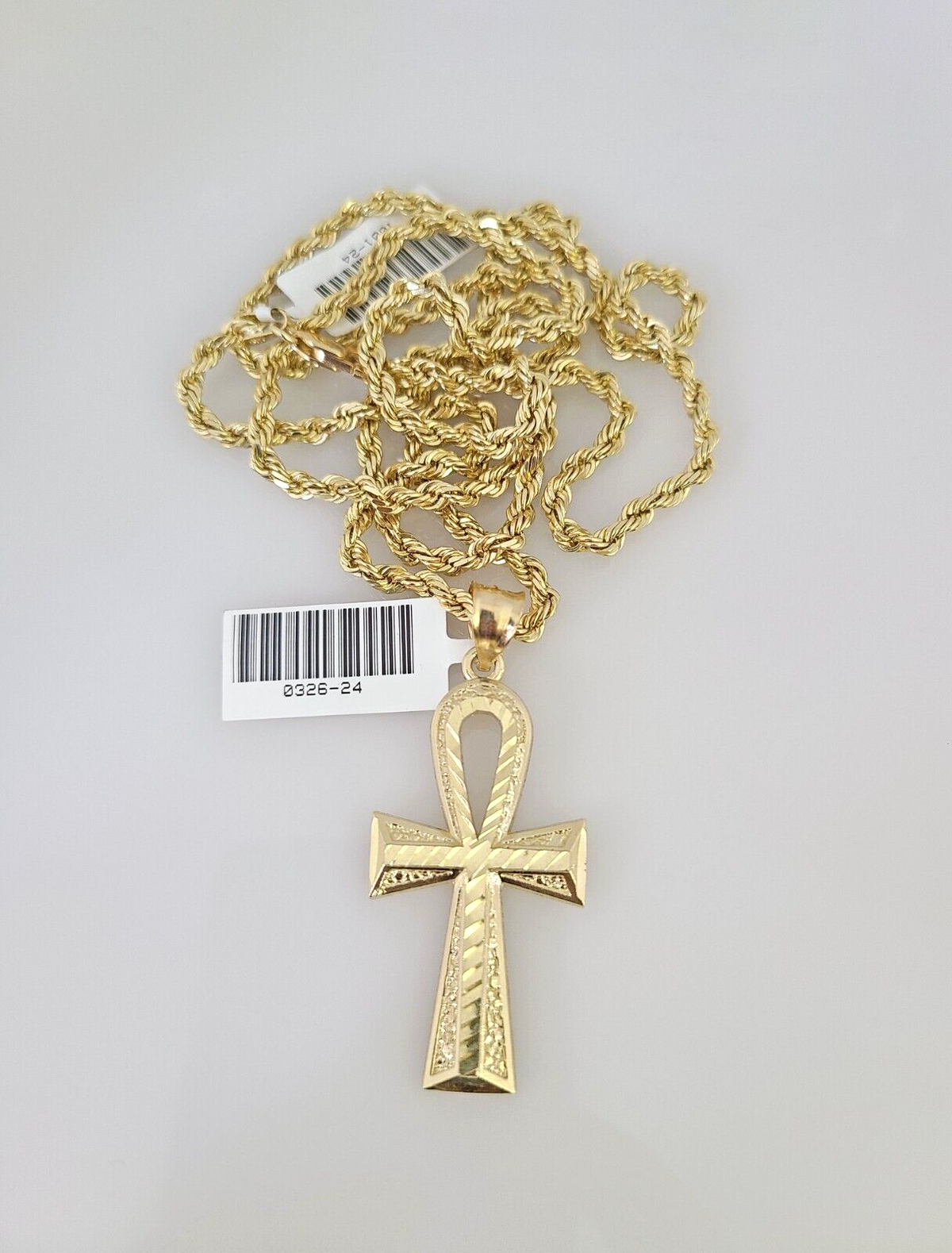 REAL 10k Solid Rope Chain Ankh Cross Charm Pendant 3mm Set 18"-26" in Necklace